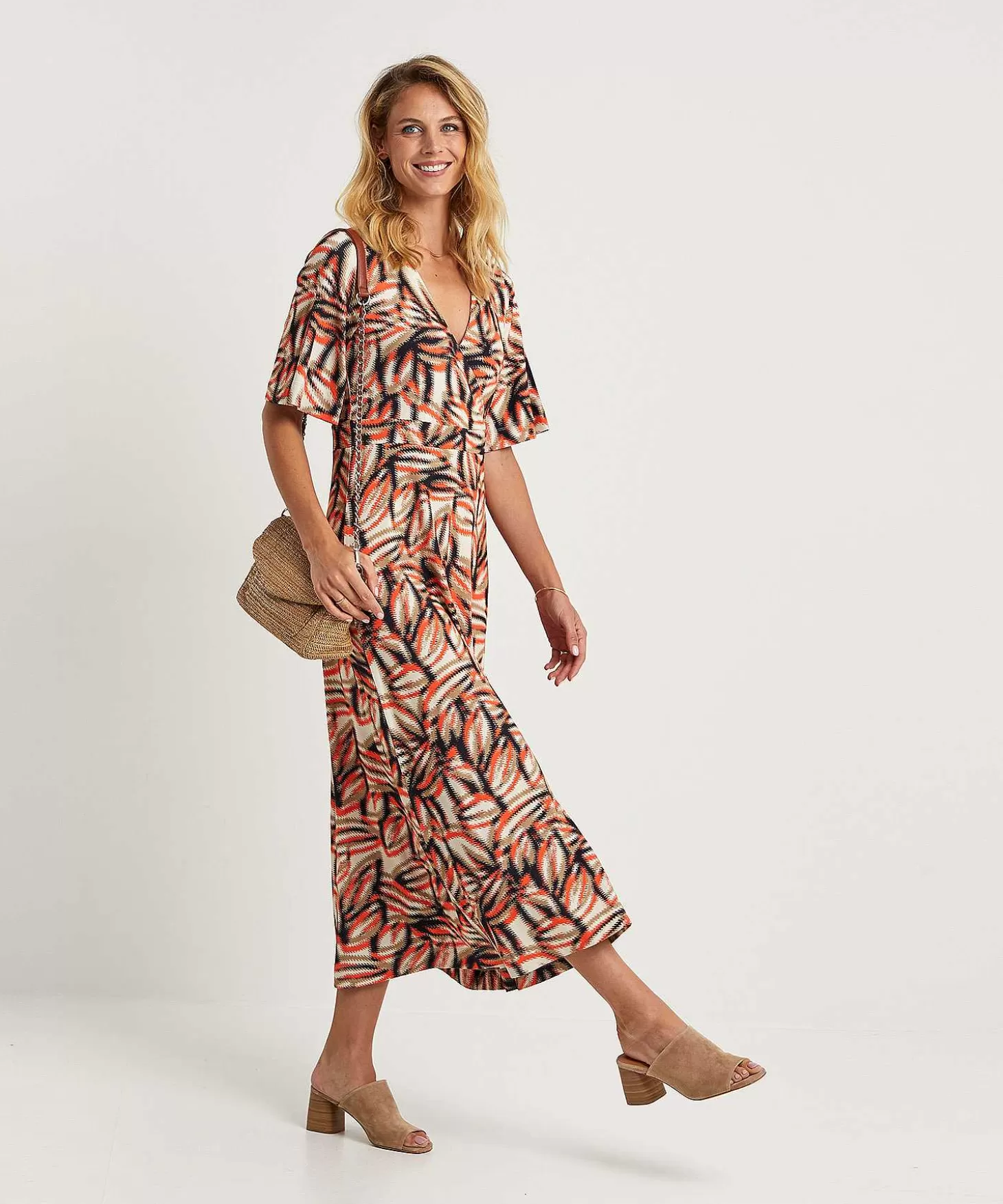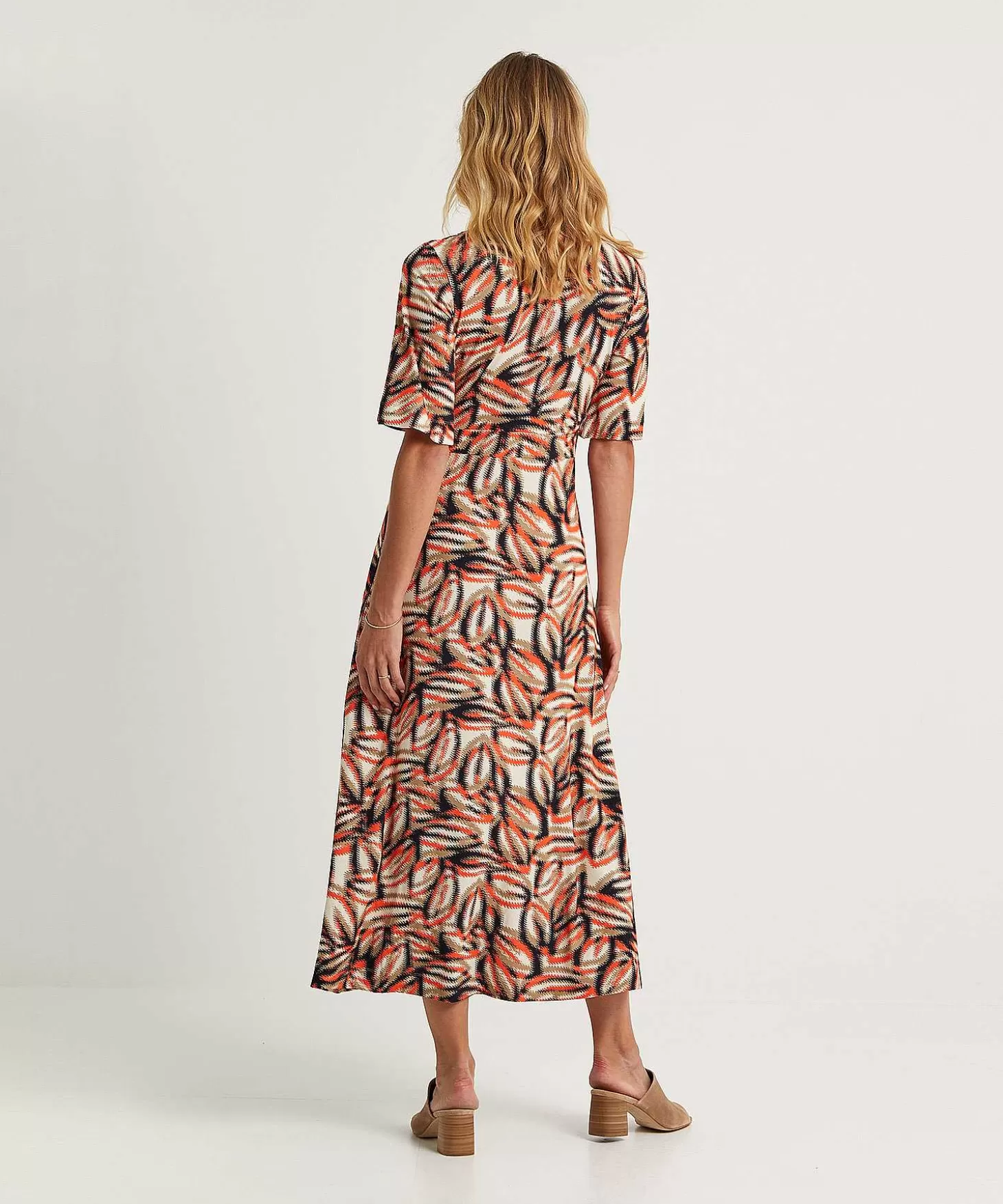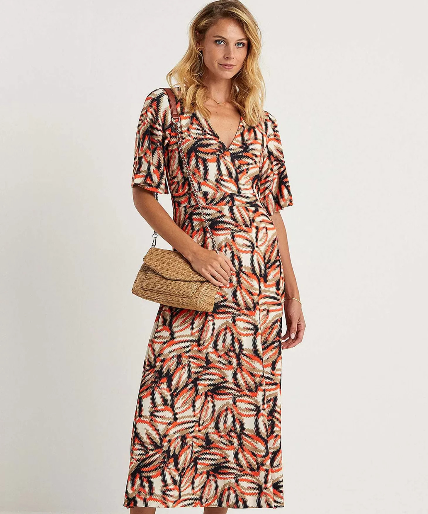 Flaneren Langs Het Strand, Een Bruiloft, Een Feestje Of Gewoon Voor Iedere Dag, Het Kan Allemaal Met Jurk Nancy Uit De Collectie Van Kyra. Nancy Is Gemaakt Van Een Zalig Rekbare En Geweldig Vallende Viscose Met Elastan. De Soepelvallende Viscose Gecombineerd Met Het Uiterst Vrouwelijke Model, Maakt Dat Deze Jurk Iedereen Goed Uit De Verf Laat Komen. De Jurk Heeft Een V-Hals Overslag En Korte Mouwen. Het Rokdeel Loopt In Een A-Lijn Tot Op De Kuit/Enkel. Draag Bij Deze Jurk Een Fijn Sandaaltje Of Kies Voor Een Zomerse Hoge Hak. Vergeet Niet Je Nagels Te Lakken. Want Daar Vraagt Deze Bladertjesprint In Zand, Beige En Zwart Met Een Contrastje In Warm Oranje, Zeker Om. Samenstelling: 96% Viscose, 4% Elastan. Stof 2: 100% Viscose.