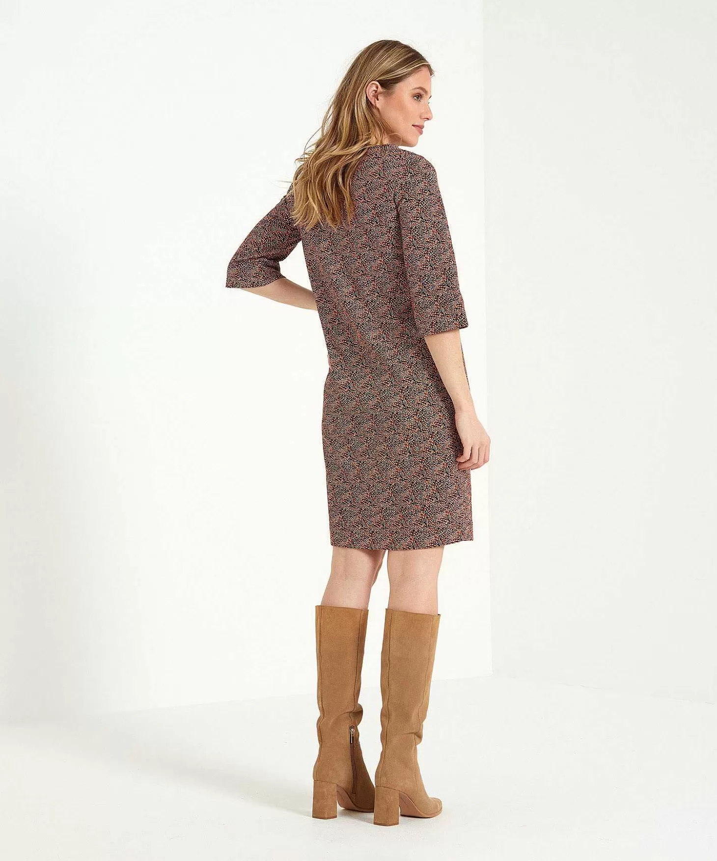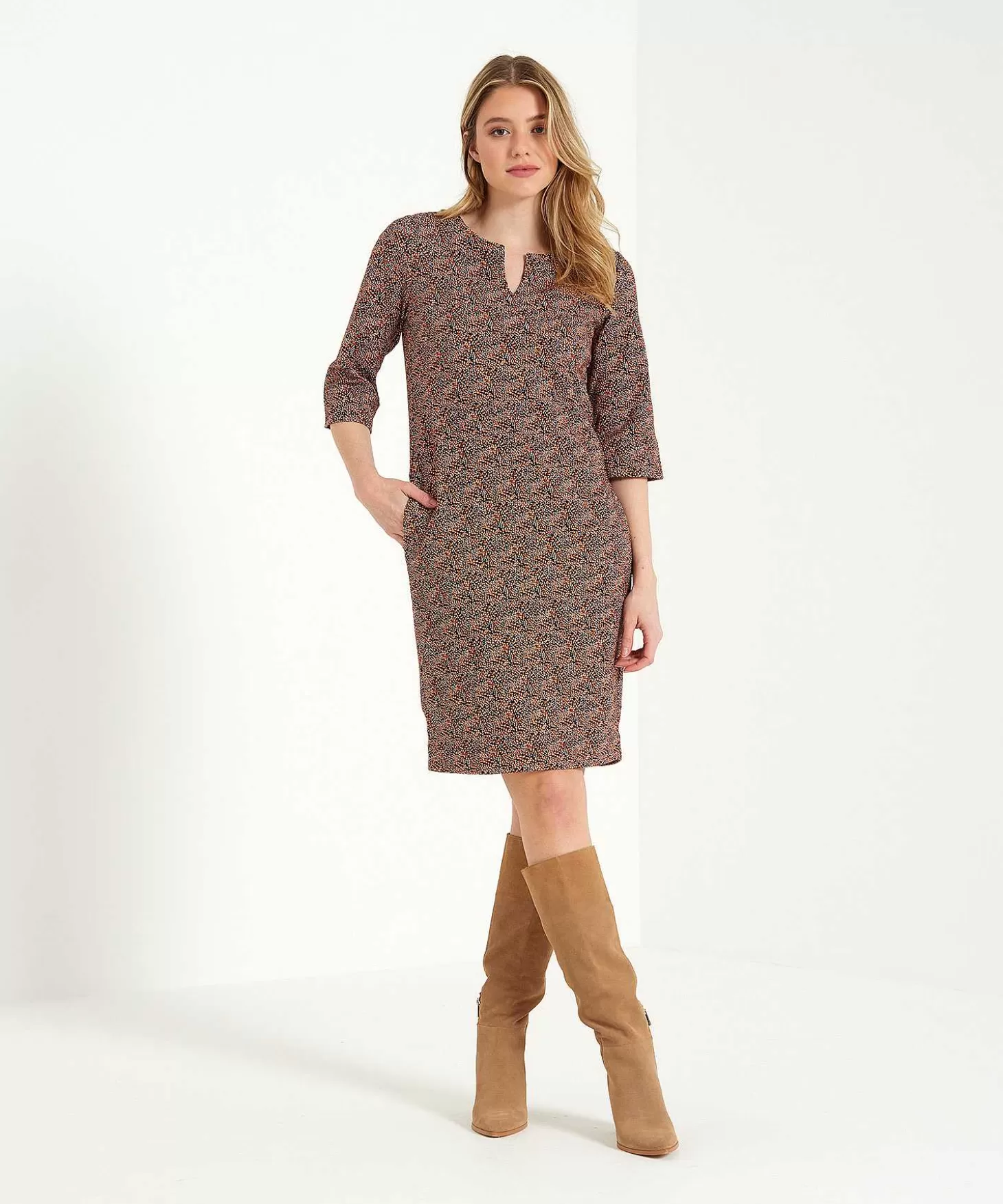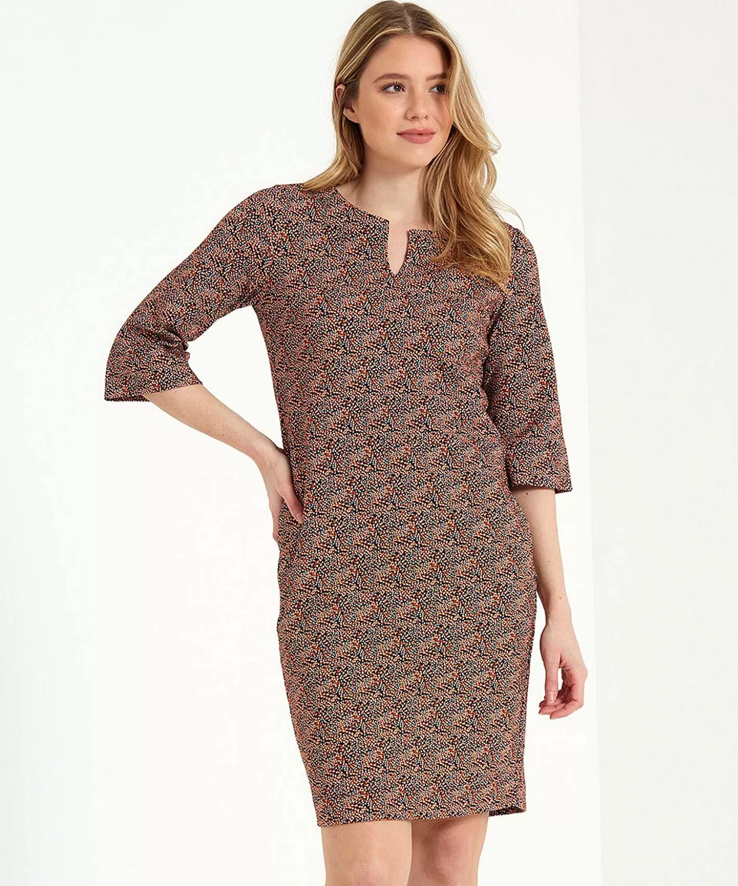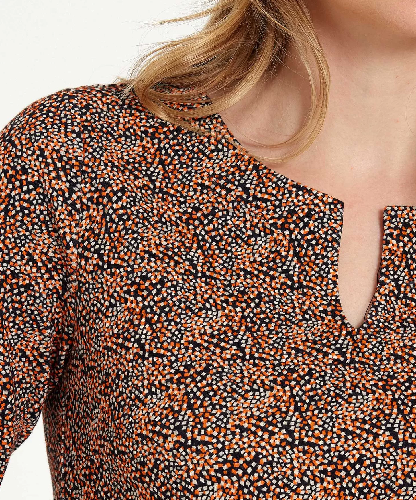 Deze Kyra Klassieker Komt In Een Nieuw Jasje…Eh Printje. Wat Een Comfortabele Jurk In Een Zachte Stretchy Katoenmix En Wat Een Maximaal Speelse Minimal Print. Vanaf Een Zwarte Basis Poppen Kleine Vierkantjes Je Tegemoet In Mandarin, Licht Zand En Offwhite En Zie Je Haar Minimalistisch Ontwerp? Van Stevige Maar Zachte Jersey Met Kniphals, 3/4E Mouw, Korte Coupenaden En Verborgen Steekzakjes (Als Buidel!) Valt Dit Knielange Model Losjes Om Je Lijf. Match Haar Met Accessoires In Ton Sur Ton Kleuren + Laarsjes Voor Een Klassieke Look Op Kantoor Of Een Feestje. Maar Ook Met High Heels, Een Sjaal Of Tas In Pittig Mandarin Laat Jij De Hoofden Draaien. Bette Is Een Fashionable Blijvertje. Samenstelling: 60% Katoen, 35% Polyester, 5% Elastan. Voering: 100% Viscose.