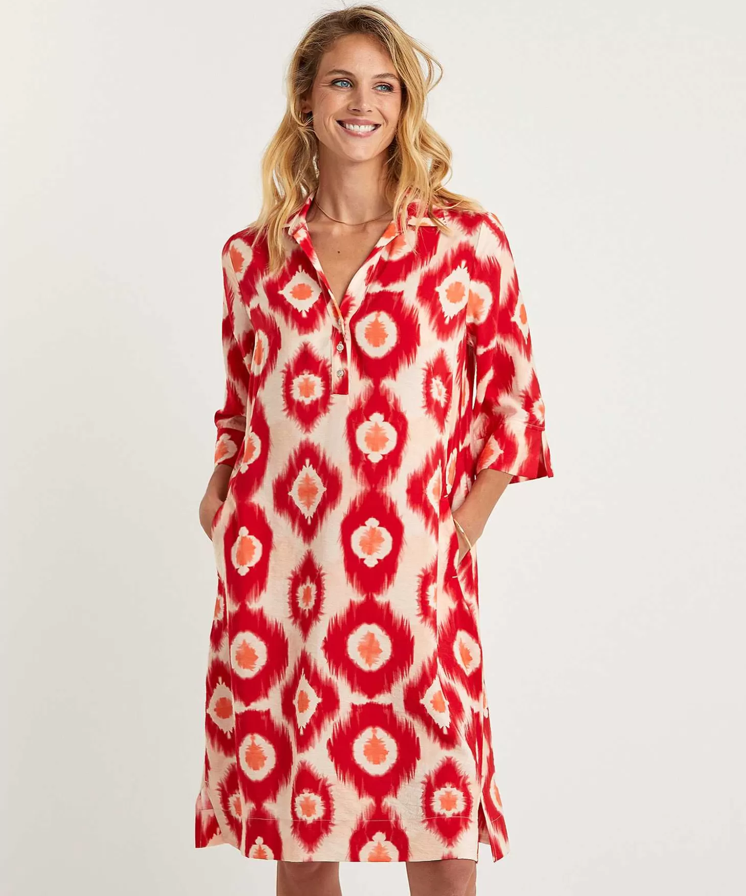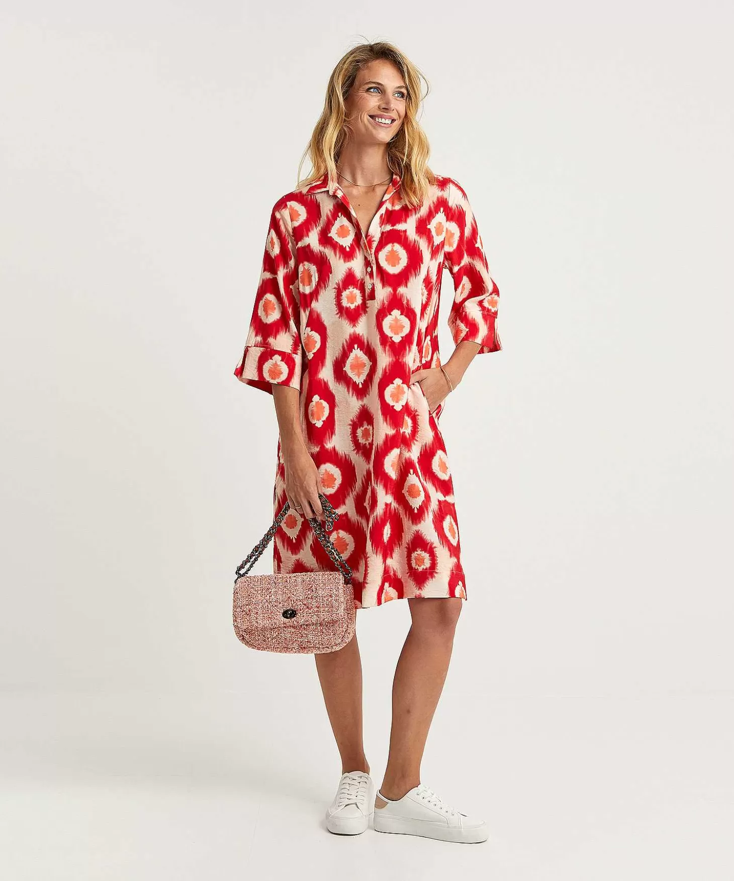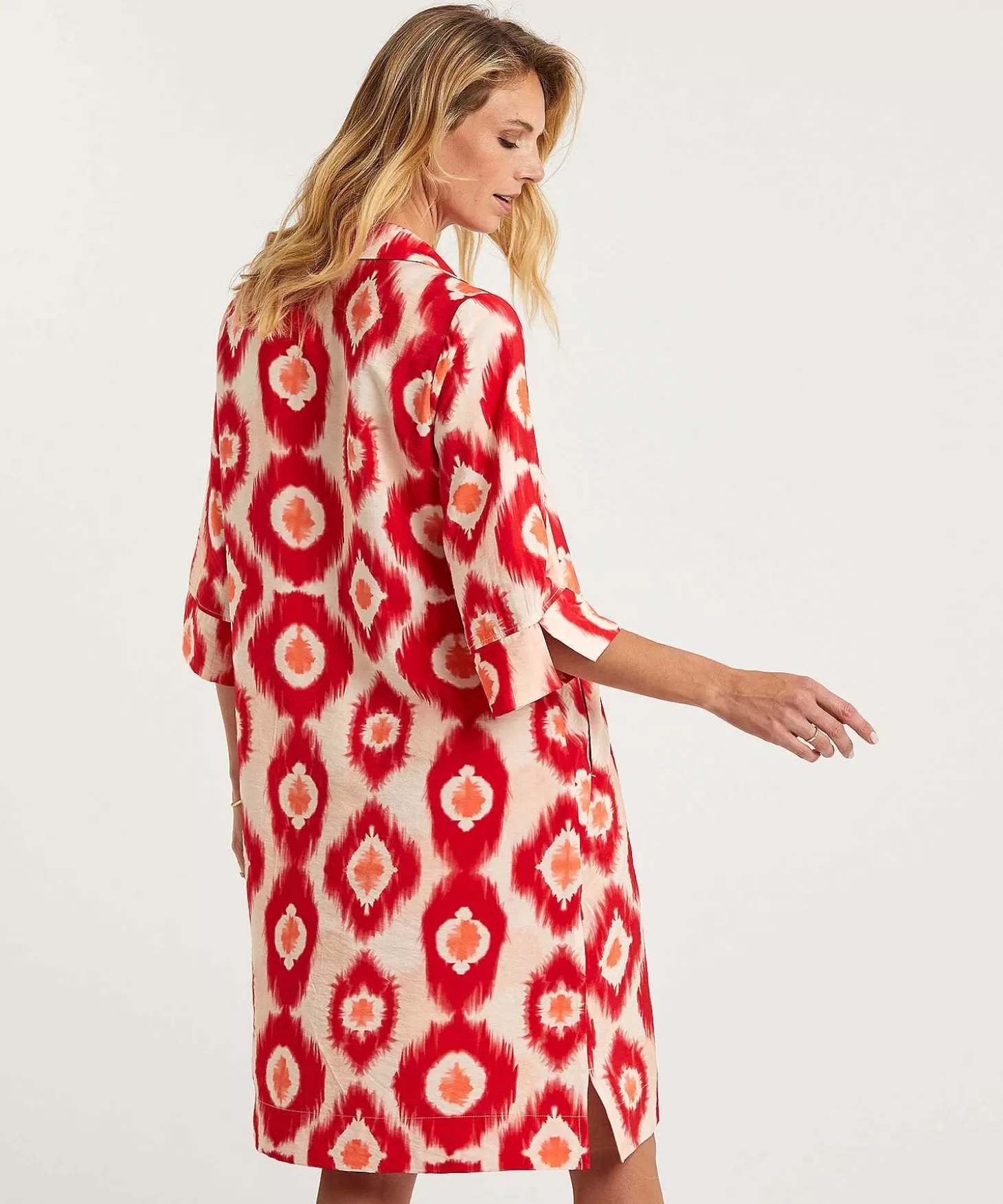 Roomwit Gecombineerd Met De Frisse Tinten Warmrood En Diep Oranje. Kyra Introduceert In Deze Tinten De Tie-Dye Print In Een Uitvergrote Variant. Jurk Nadine Is Uitgevoerd In Een Vrouwelijke A-Lijn Die Tot Net Op Of Over De Knie Valt. Het Jurkje Heeft Een Knoopsluiting Met Kraagje En Wijde Korte Mouwen Die Tot Net Over De Elleboog Vallen. Draag Dit Jurkje Lekker Losvallend En Combineer Met Je Zomerse Sandaaltjes Of Kies Voor Een Riempje In De Taille En Combineer Met Je Hoge Hakken. Samenstelling: 86% Ecovero Viscose, 14% Polyamide.
