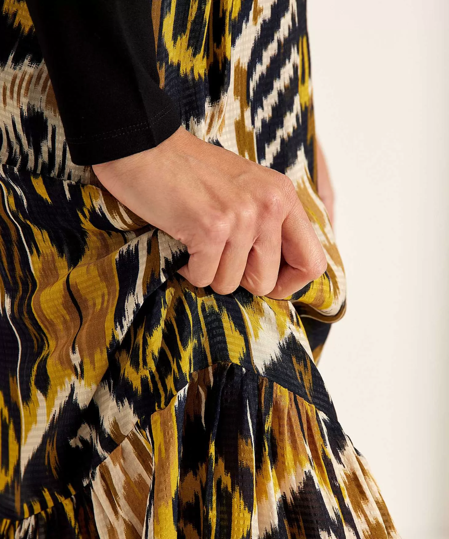 Bohemian Style Met Een Vleugje Chic! Dat Is Bij Uitstek Wat Deze Rok Laat Zien. De Soepel Vallende Vanessa Uit De Collectie Van Kyra. Deze Viscose Rok Is Licht Transparant En Is Voorzien Van Een Onderrok. De Rok Heeft Een Krachtige Ikatprint In De Warme Tinten Mosterdgeel, Curry, Camel, Zacht Beige En Diep Donkerblauw. De Brede Roezelrand Aan De Rok En De Brede Elastische Band In De Taille Ondersteunen De Heerlijke Zwierige Losse Stijl. Maak Het Totaalplaatje Af Met Een Fijne Trui Zoals Bijvoorbeeld De Warm Gele Trui Faye Van Kyra Of Kies Voor De Suggestie Van Een Lange Jurk Door Blouse Vaiana Of Blouse Vixie Met De Rok Te Combineren. Een Paar Kniehoge Camelkleurige Laarzen, Lekker Stoer Met Een Dikke Zool Of Juist Vrouwelijk Met Een Hoge Hak, Maken De Look Compleet. Samenstelling: 100% Viscose. Onderrok: 100% Viscose.