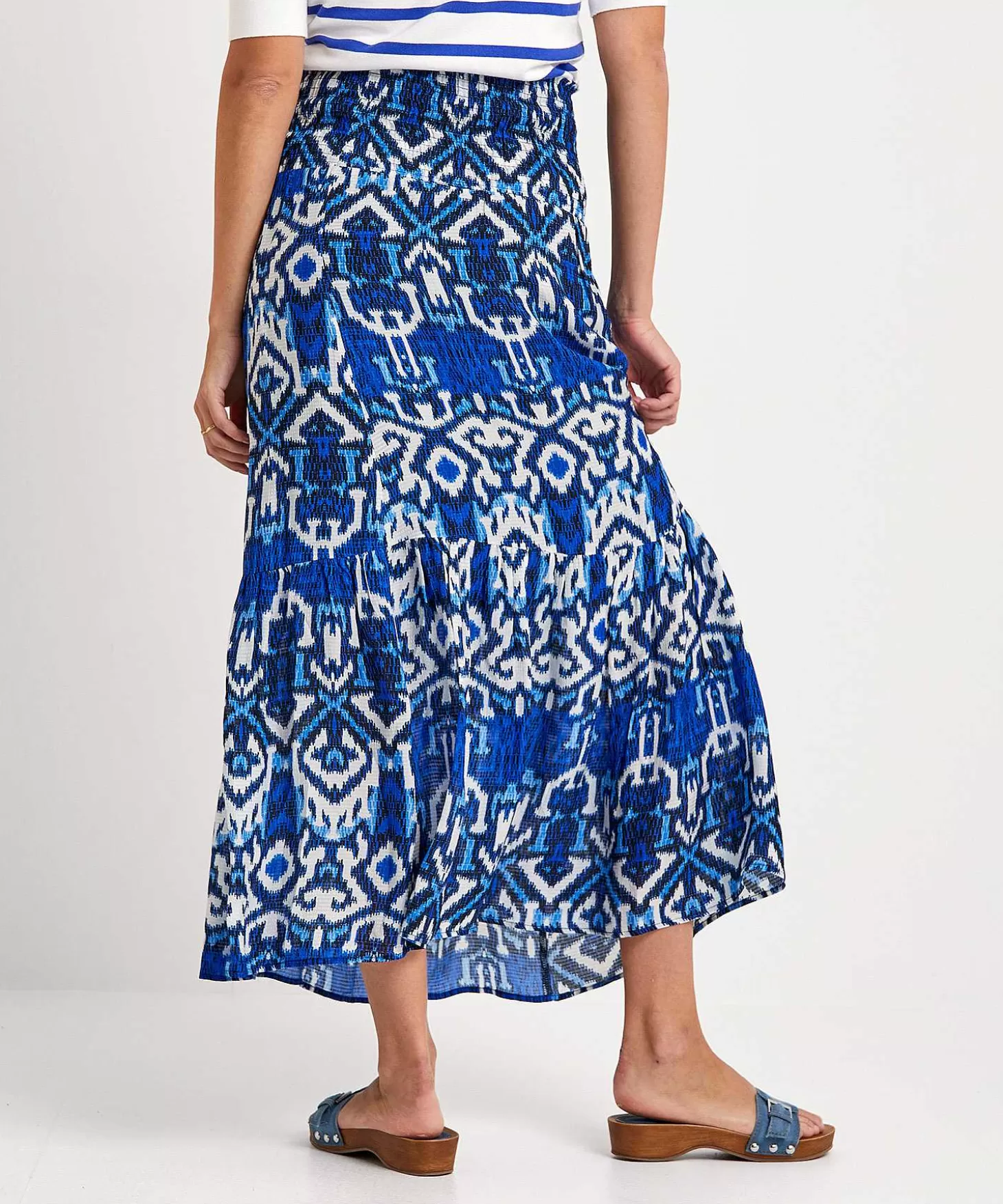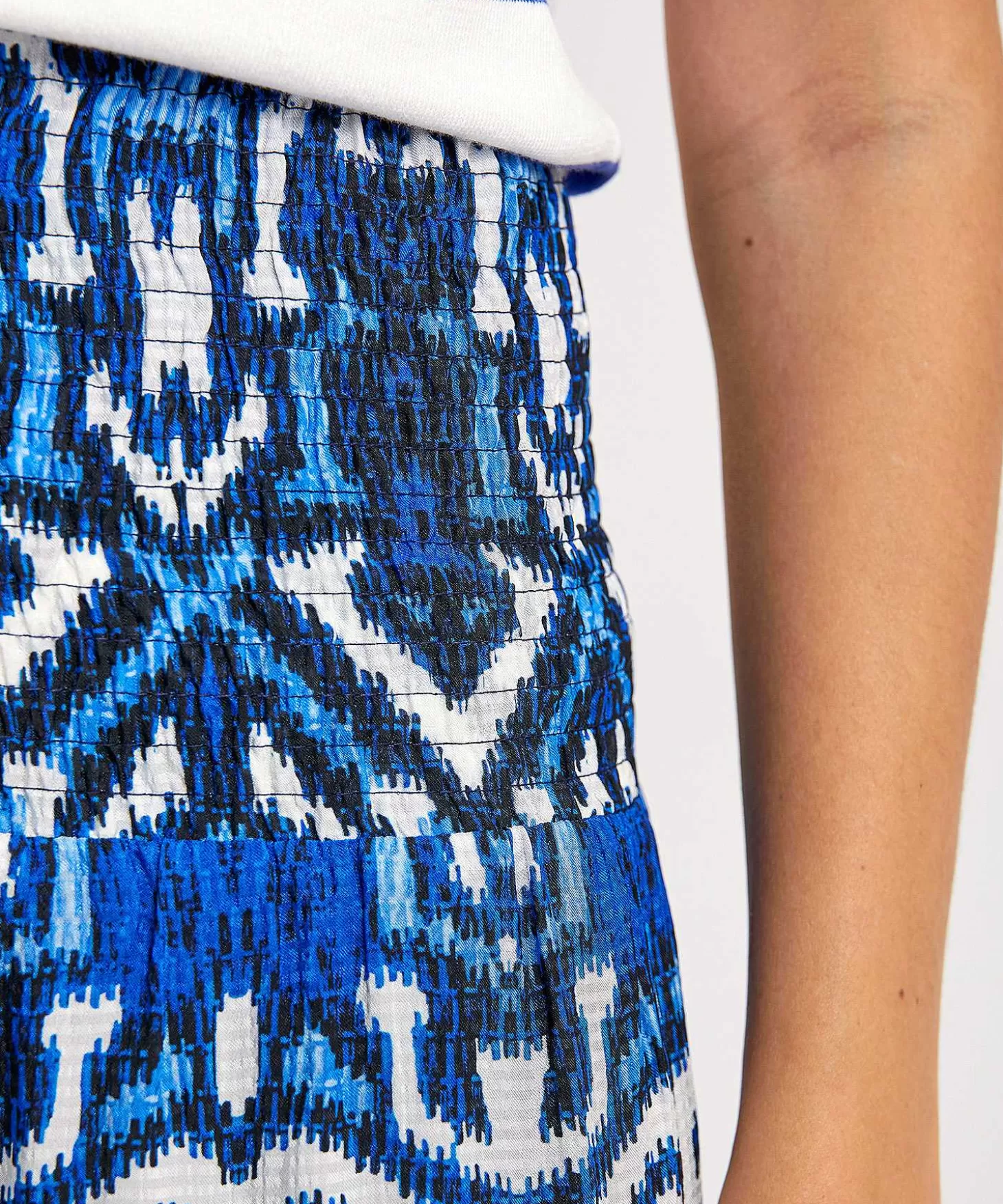 Ontdek De Betoverende Veronique Rok Van Kyra, Een Perfecte Mix Van Bohemian Stijl En Eclectische Flair. Van De Breed Gesmokte Tailleband En Subtiel Gerimpelde Details Loopt De Rok In Lichte A-Lijn Uit. De Ikat Print In Levendige Kobaltblauwe Tinten Springt Eruit Tegen Een Achtergrond Van Zwart En Off-White. Met Een Enkellange Valling En Gedeeltelijke Jersey Voering Tot De Knie, Biedt Veronique Zowel Comfort Als Flair. Ze Valt Normaal Qua Maat En Haar Losvallende Ontwerp Past Perfect Bij Elke Gelegenheid. Combineer Haar Met Sneakers En Bijpassende Printtop Vera En Maak Er Optisch Een Jurk Van, Of Draag Haar Zomers Met Een Wit Topje, Denim Jack En Teenslippers. Samenstelling: 54% Enka-Viscose, 46% Viscose. Onderrok: 100% Viscose.