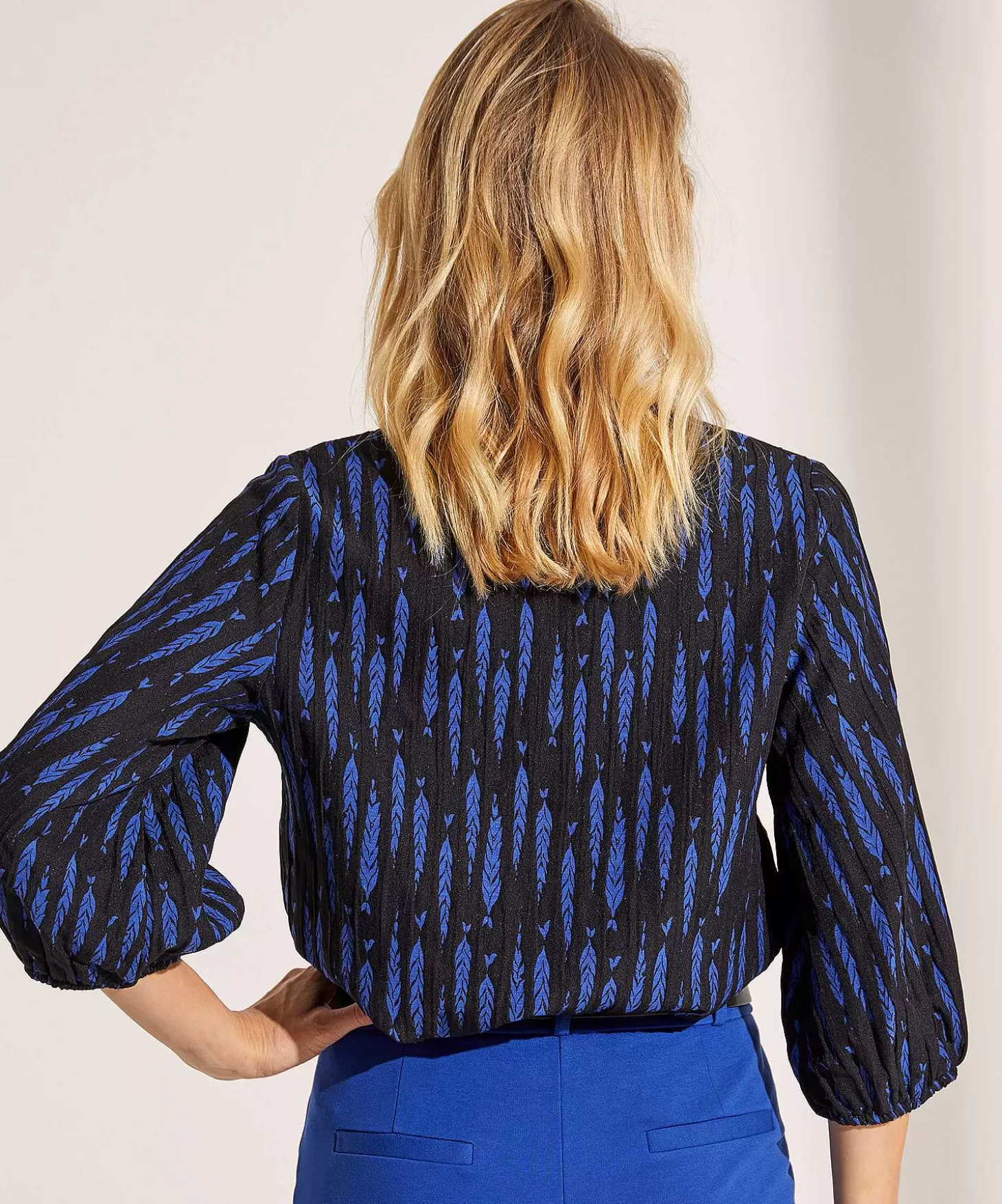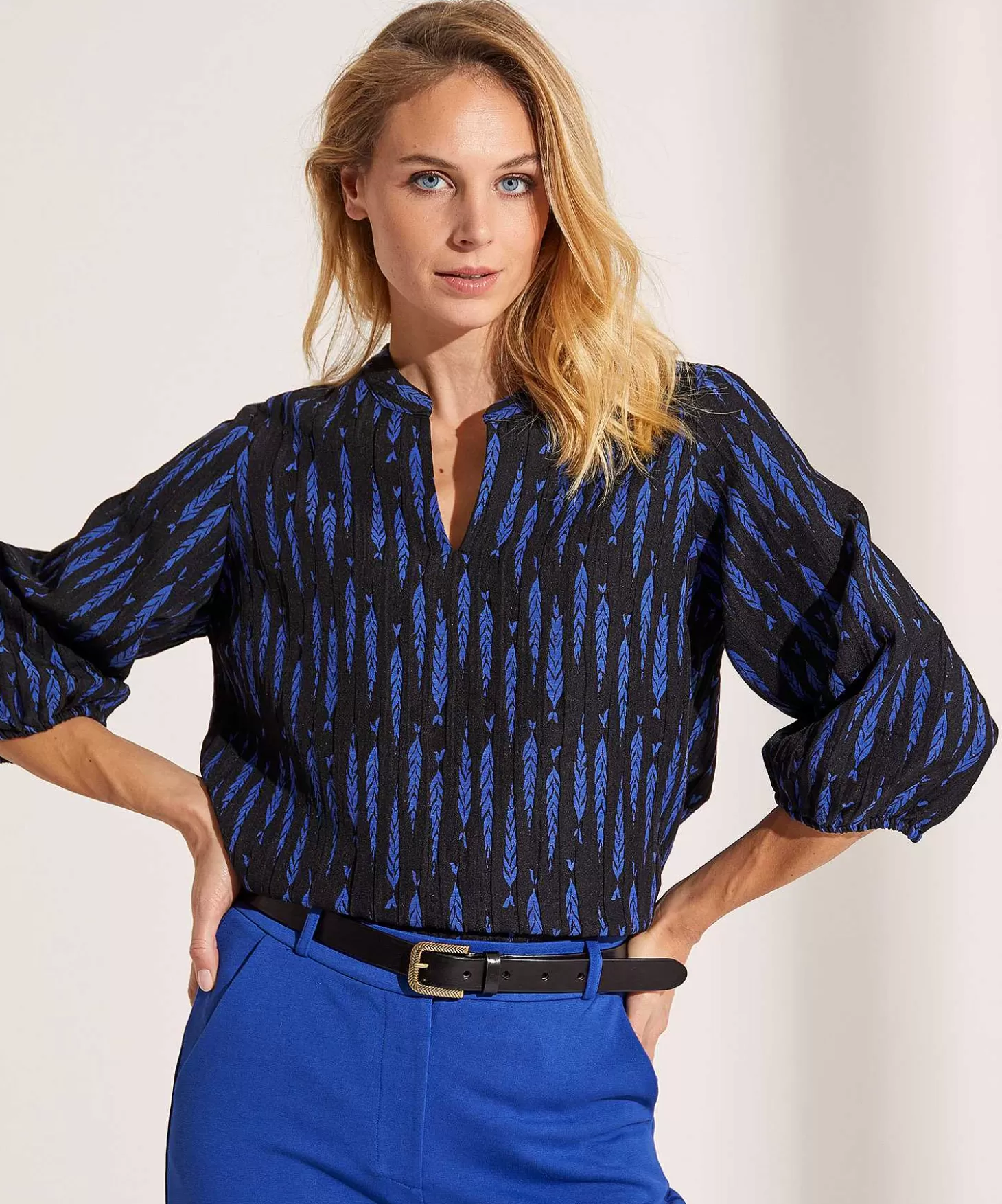 In Speelse Structuur Stof In Two Tone Is Deze Kyra Top Oogstrelend Mooi. Voel Je Haar Zwarte 3D Plooitjes Naast Helderblauw Plat Halmpatroon? Eve Heeft Een Tuniekhals, Korte Coupenaden, Een Subtiele A-Lijn Met Splitten Bij De Zoom Én Een 3/4E Ballonmouw. Je Draagt Dit Korte Model Met Een Pantalon Of Vegan Leren Broek + Loafers Naar Je Werk Of Een Feestje, Maar Ook Met De Kyra Rok Bowien En Laarsjes Ben Je Picture Perfect. Samenstelling: 48% Polyester, 29% Katoen, 22% Viscose, 1% Elastan.