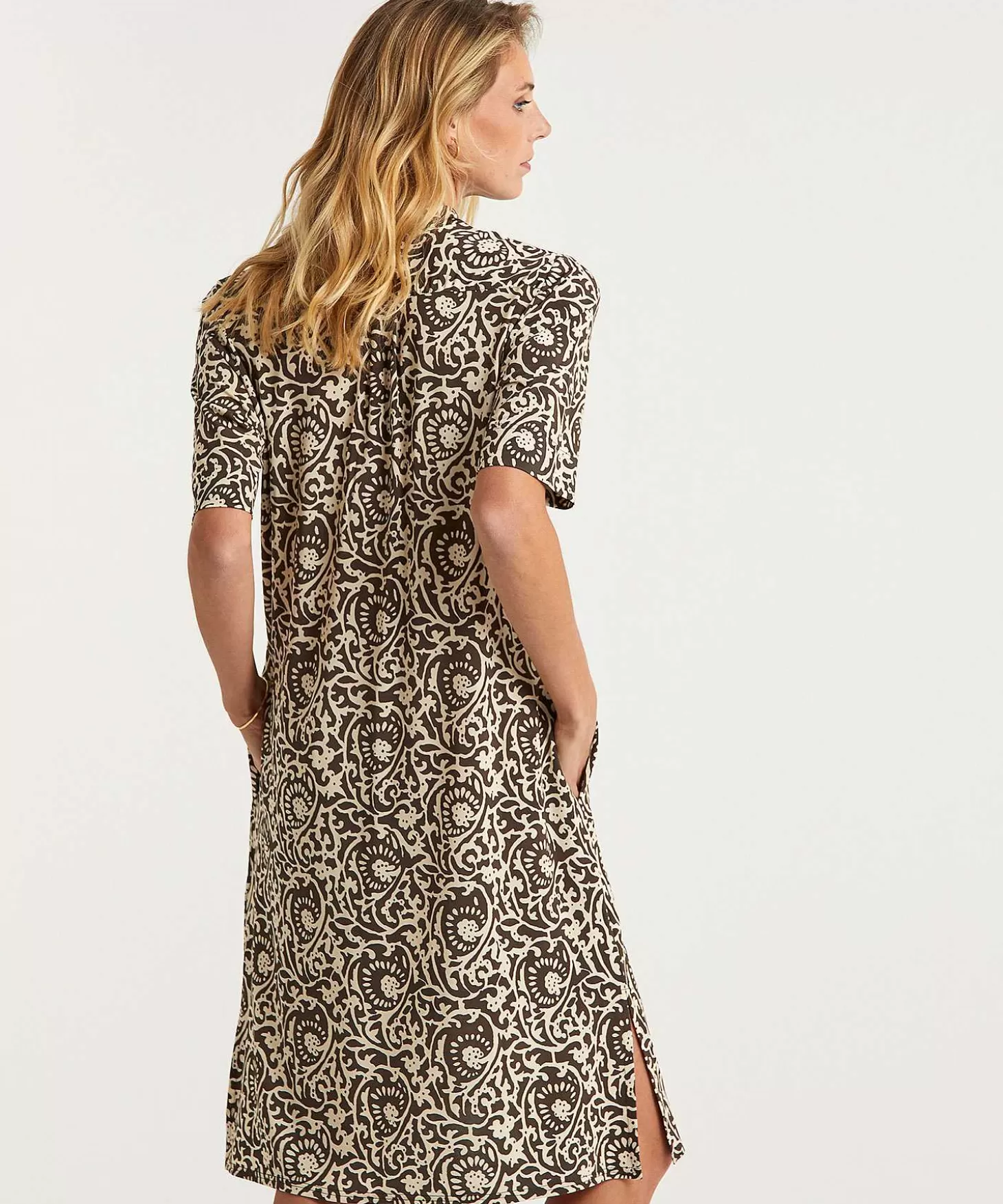 Deze Slinky Lasalle Jurk Flirt Via Haar Printjes Met Verre Oorden. Waar De Marine/Witte Versie Oriëntaals Minimalisme Uitstraalt, Kiest De Taupe/Beige Jurk Voor Maxi-Paisley – Welke Wordt Jouw Favoriete Zomerjurk? Met Haar Soepele (Slinky) Materiaal, Opstaande Boordje, V-Hals Met Overslag, Kort Mouw En Pas Achter + Plooitjes Valt Ze Losjes Om Je Heen. Daarnaast Heeft Ze Verborgen Zakken En Zijsplitjes Bij De Zoom.