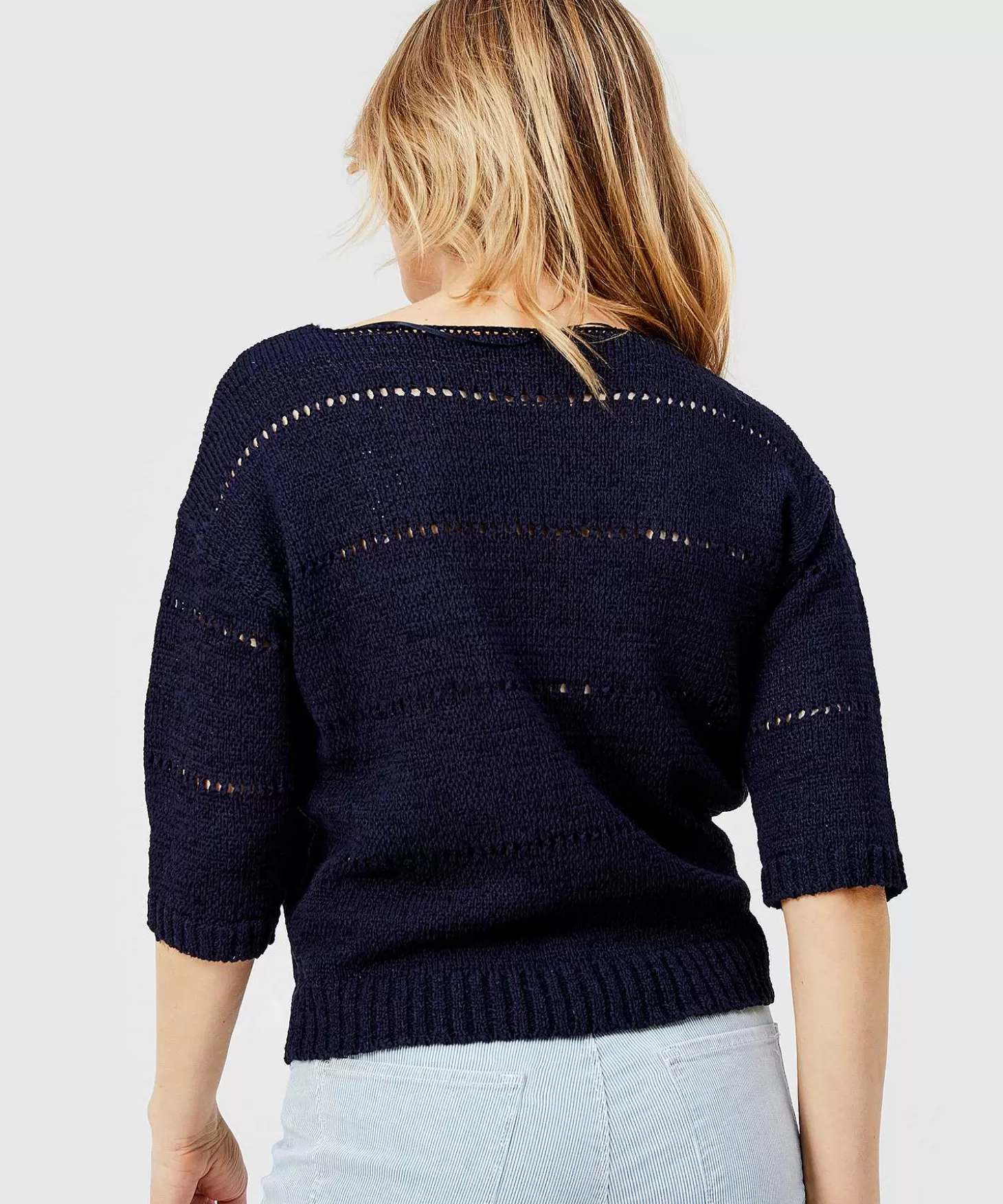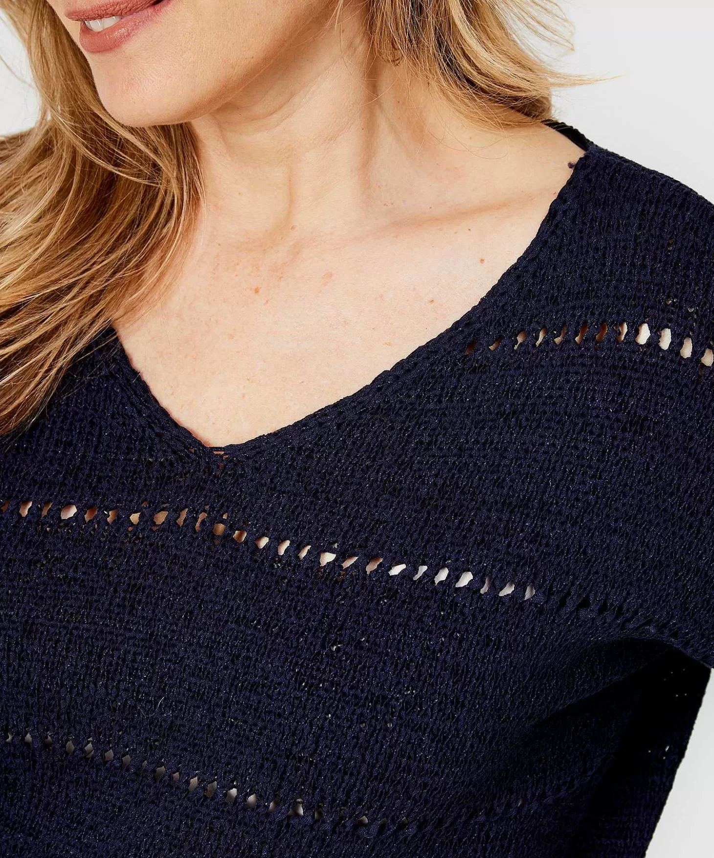 Geen Zomer Zonder Truitjes In Tape Yarn, Ofwel Lintgaren. Dit Nieuwste Model Van Heeft Een Vrouwelijk V-Halsje, 3/4 Mouwen En Ajourgaatjes In Horizontale Banen. Pak Zo’N Lintgaren Truitje Als Vervanger Van Je T-Shirt En Zie Hoe Je Outfit Een Rijkere Uitstraling Krijgt. Kortom, Echt Een Waardevolle Aanvulling Van Je Garderobe. Ze Komt In Diverse Kleuren, Waaronder Marine, Vergrijsd Groen En Een Warme Zandkleur. Samenstelling: 67% Katoen, 33% Polyester.