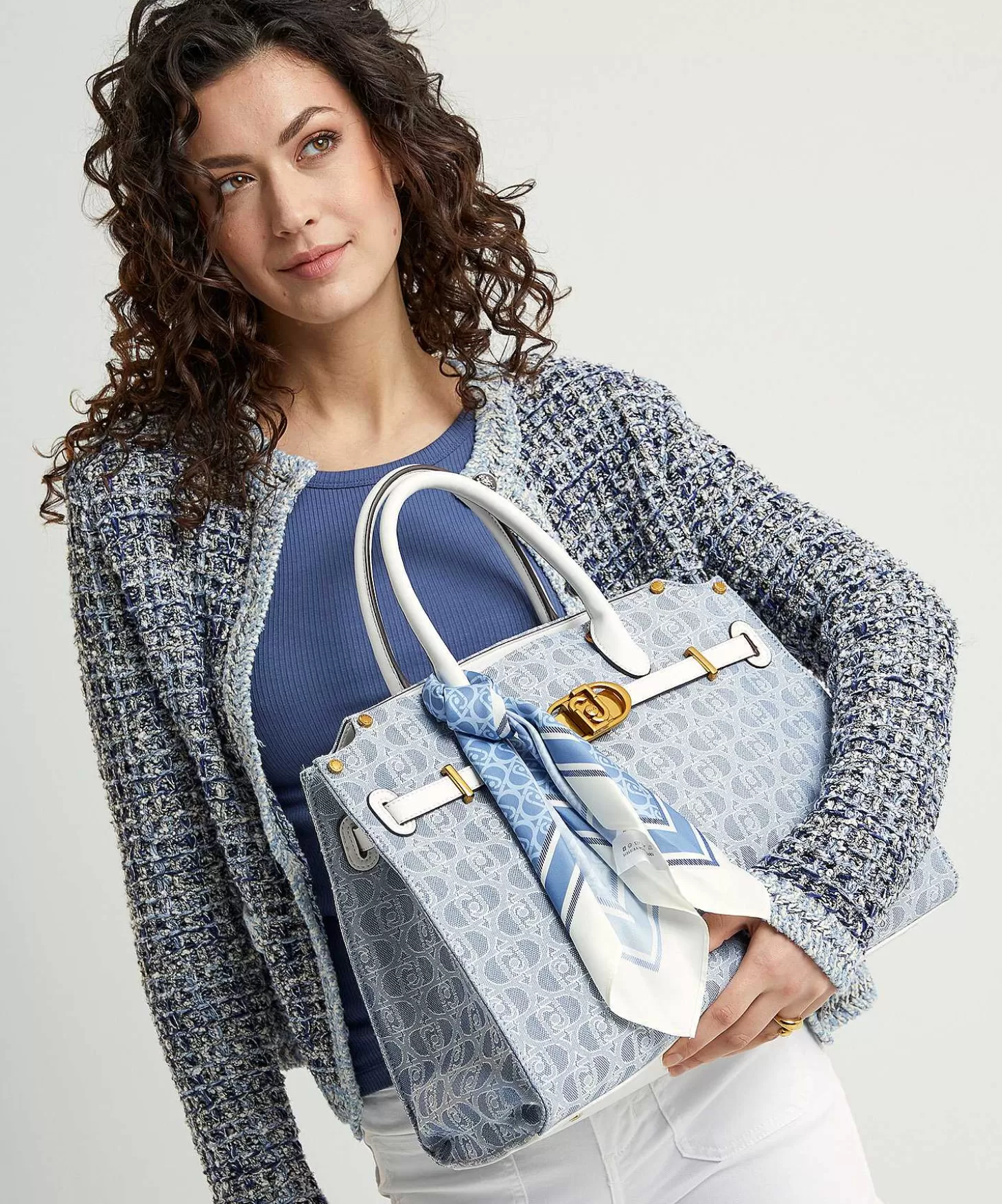 Oh La La! Deze Liu Jo Handtas Met Logo-Patroontje Straalt Pure Luxe Uit. Flirtend Met High-Fashion (Couture!) Ademt Ze Tijdloze Klasse En Ze Zit Vol Met Sublieme Details. Zie Je Haar Silky Sjaaltje Als Extra Accessoire, Kleurpalet In Vergrijsd Blauw Met Wit En Goudkleurige Details? Naast Een Decoratieve Logo-Gesp Heeft Ze Een Royaal Formaat En Stevige Hengsels. Aan De Binnenzijde Heeft Ze Een Praktisch Afsluitbaar Ritsvak En Ze Is Voorzien Van Magnetische Drukkers. Wat Wil Je Nog Meer? Deze Perfecte Handtas De Jouwe Maken. Afmetingen: Ca. 30 X 40 Cm.
