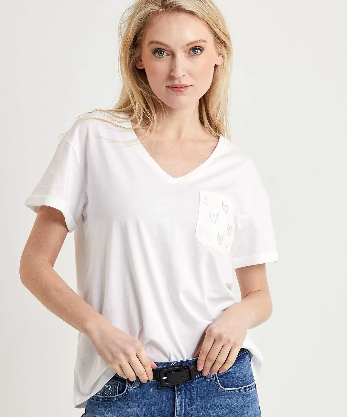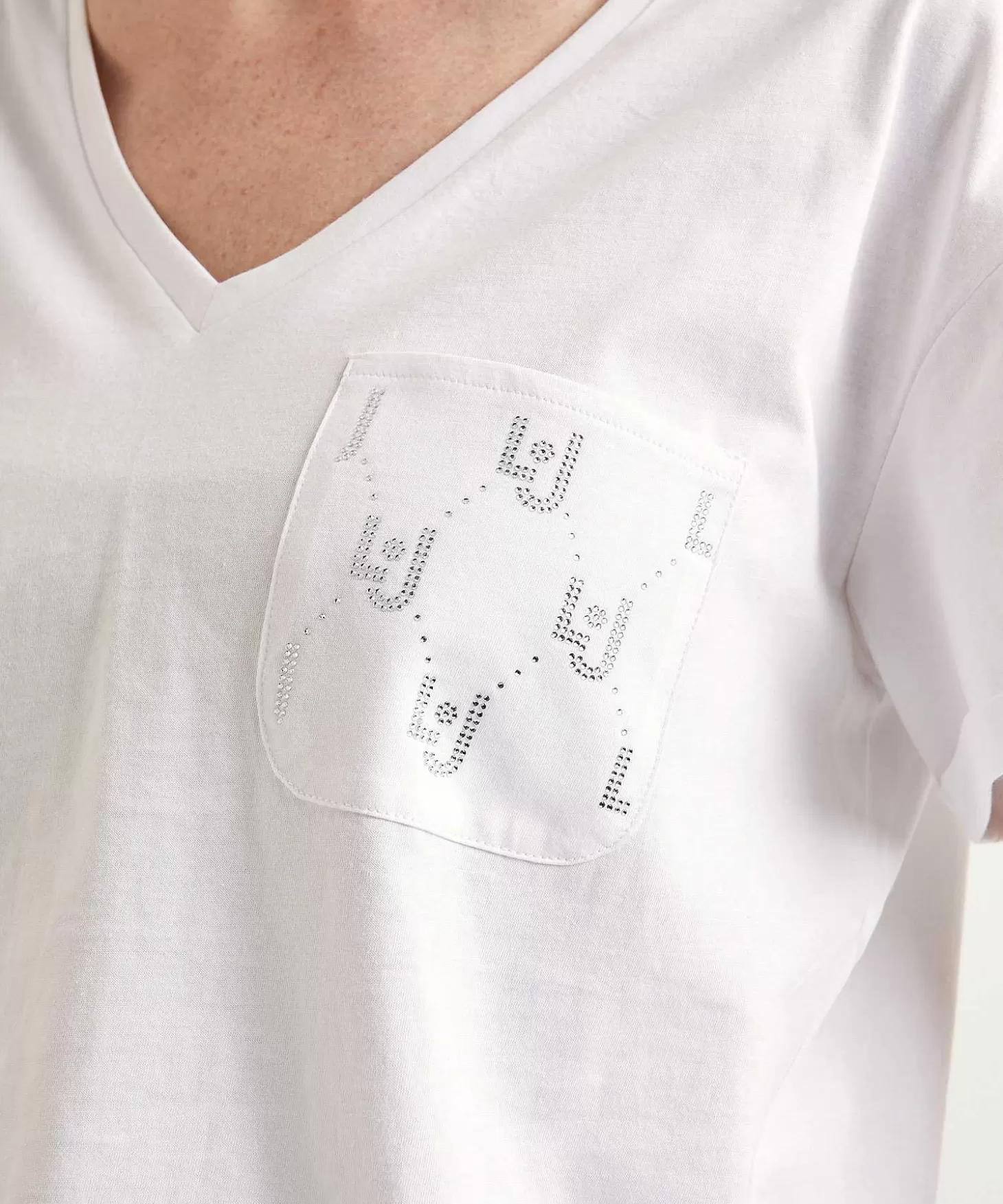 Fijn Shirt Om Eindeloos Mee Te Variëren Uit De Collectie Van Liu Jo. Het Rechtvallende Shirt Heeft Korte Mouwen Met Vaste Omslag En Een Ruime V-Hals. Subtiel Wordt De Aandacht Getrokken Naar De Verfijnde Logo Letters In Glinsterende Strass Steentjes. Draag Dit Shirt Op Je Jeans Of Onder Je Blazer. Samenstelling: 100% Katoen.