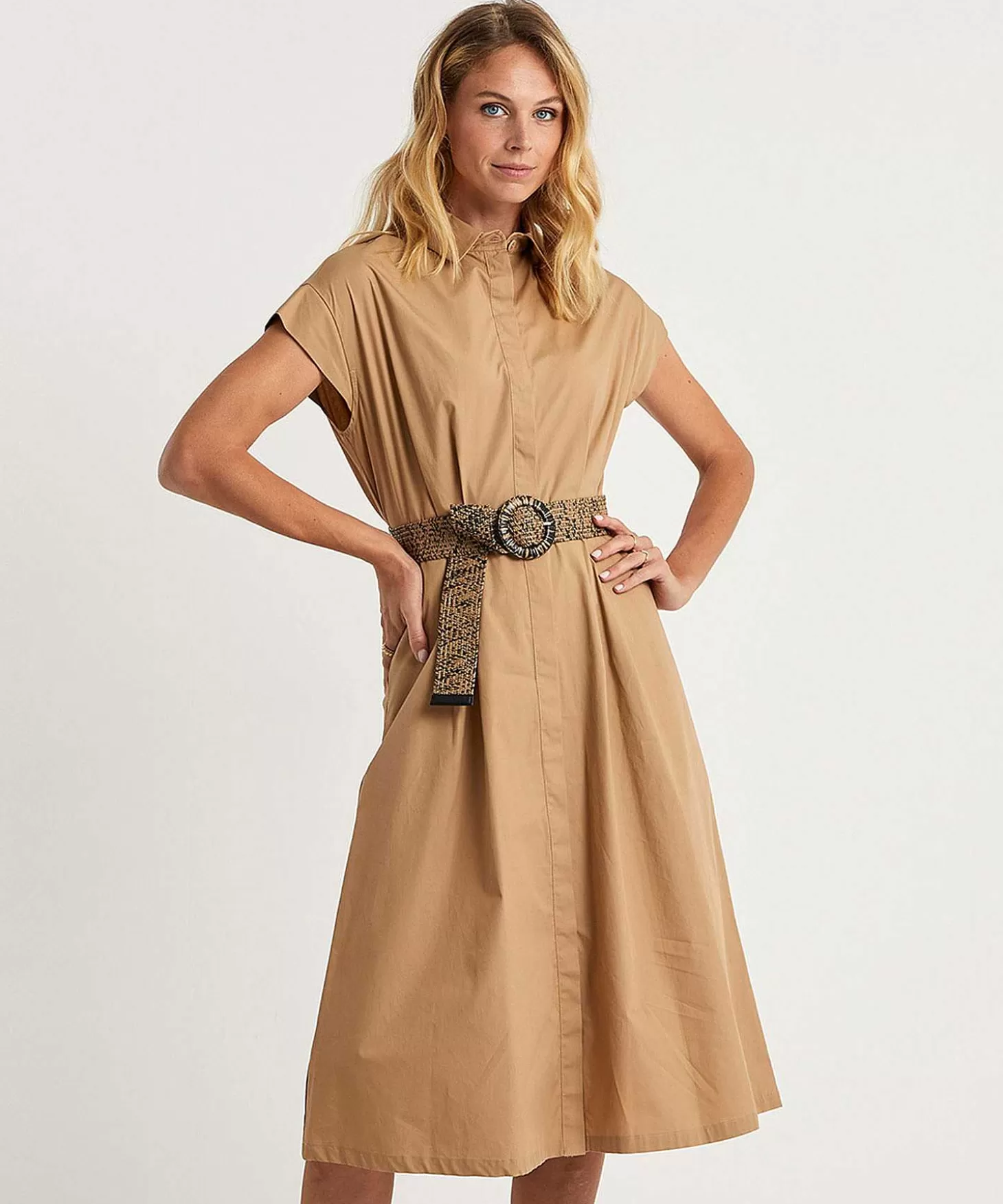 Poplin Meets Hourglass Met Deze Lui Jo Jurk In Fijne Poplin. Dankzij De Afneembare Ceintuur Creëer Je In Een Handomdraai Een Geaccentueerde Taille En Haar Neutrale Camelkleur Maakt Haar De Allrounder Binnen Jouw Garderobe. Wat Een Feminien Blousejurk Met Haar Kraagje, Verborgen Knoopjes, Korte Kapmouwtje, Platte Plooien, Slanke Taille En Uitwaaierende Rok Tot Halverwege De Kuit. En Ze Heeft Verborgen Zakjes!