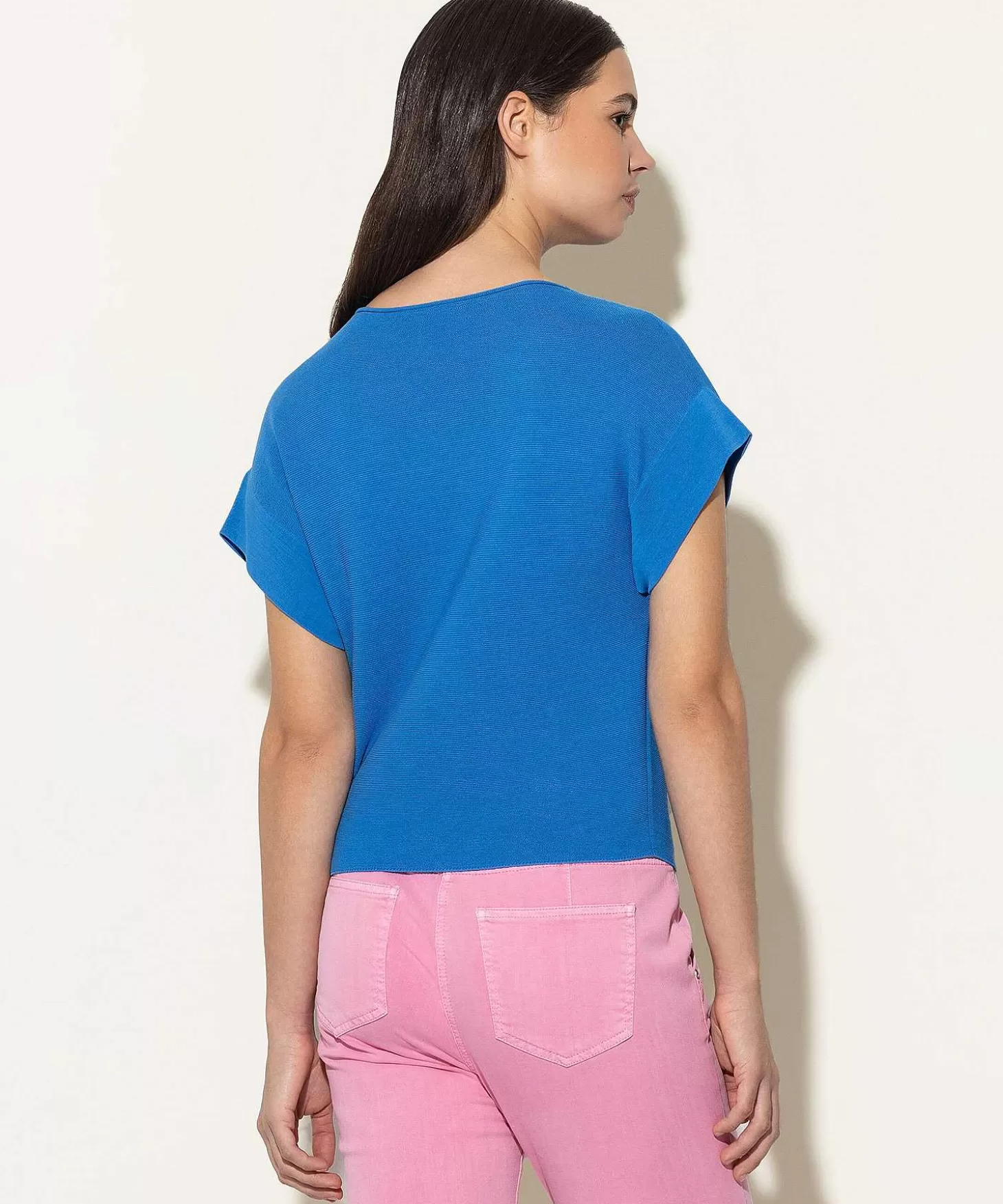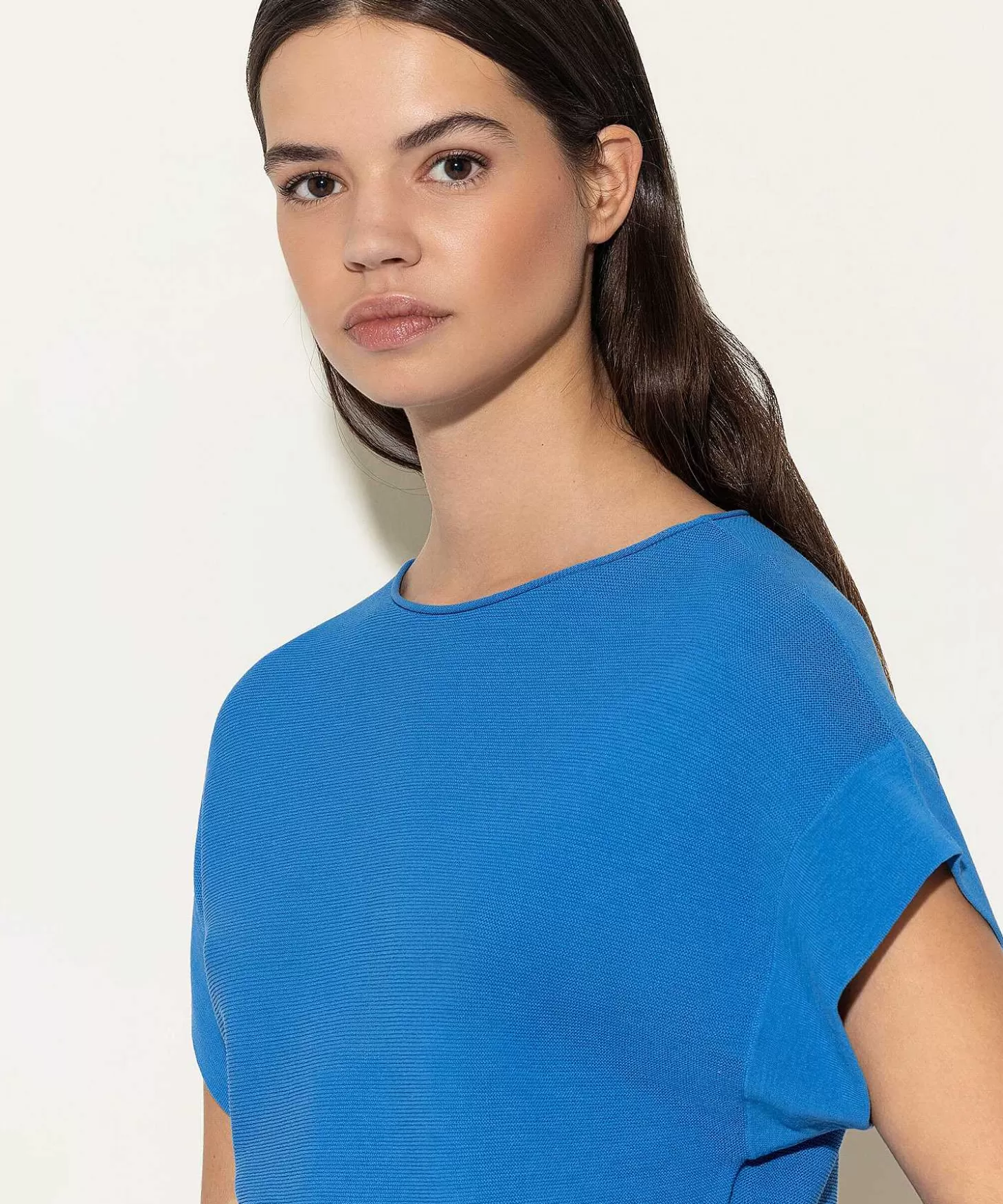 Fijn Gebreid En In Luchtige Katoenmix Is Dit Luisa Cerano Truitje Minimalism & Colourblock Tegelijk. Uit De Colour Play Collectie Doet Ze Het Thema Eer Aan: In Stralend Skyblue En Droog Breisel Met Rolboordje Bij De Hals En Een Korte Aangebreide Mouw Past Ze In Vele Outfits.