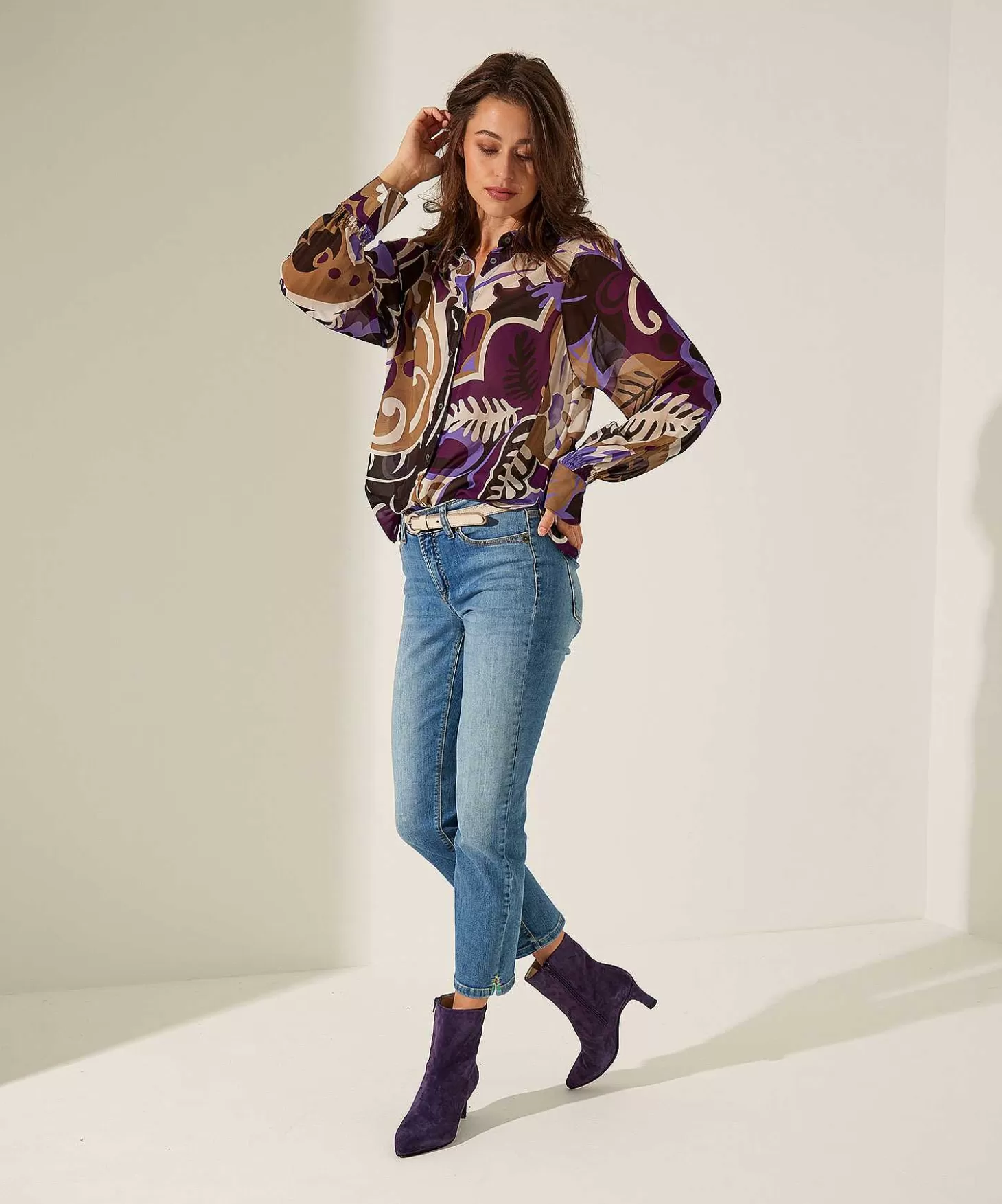 Uit Het Purple Rain Thema Heeft Deze Voile Luisa Cerano Blouse Met Flowerprint Absoluut Flower Power. Semitransparant En Helemaal In 70’S Kleuren (Lichtpaars, Donkerpaars, Donkergrijs, Donkercamel En Ecru) Danst Ze Luchtig Om Je Lijf. Zie Je Haar Puntkraagje, Smockdetail Bij De Manchet En Rechte Zoom Met Zijsplit? Je Draagt Haar Met De Luisa Cerano Velvet Flared Broek En Laarzen Voor De Ultieme Vintage-Inspired Look, Maar Ook Met De L.C. Wide Leg Pantalon En High Heels Ben Je Party- En Officeproof. Het Model Is 1.78M En Draagt Maat 36. Samenstelling: 100% Viscose.