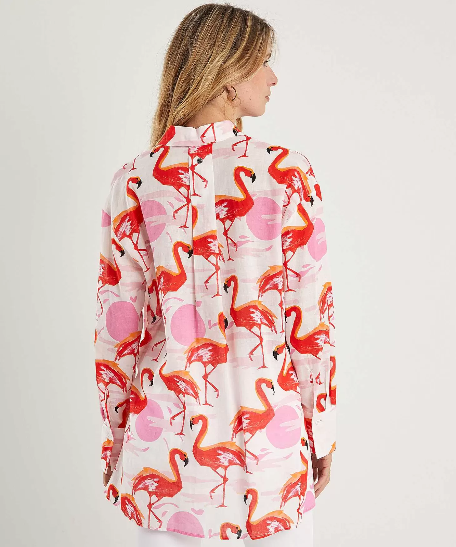 Deze Lange Marc Cain Blouse Combineert Een Kleurrijke Flamingo Print Met Cotton Voile. Laat De Zomer Maar Komen! In Dun…