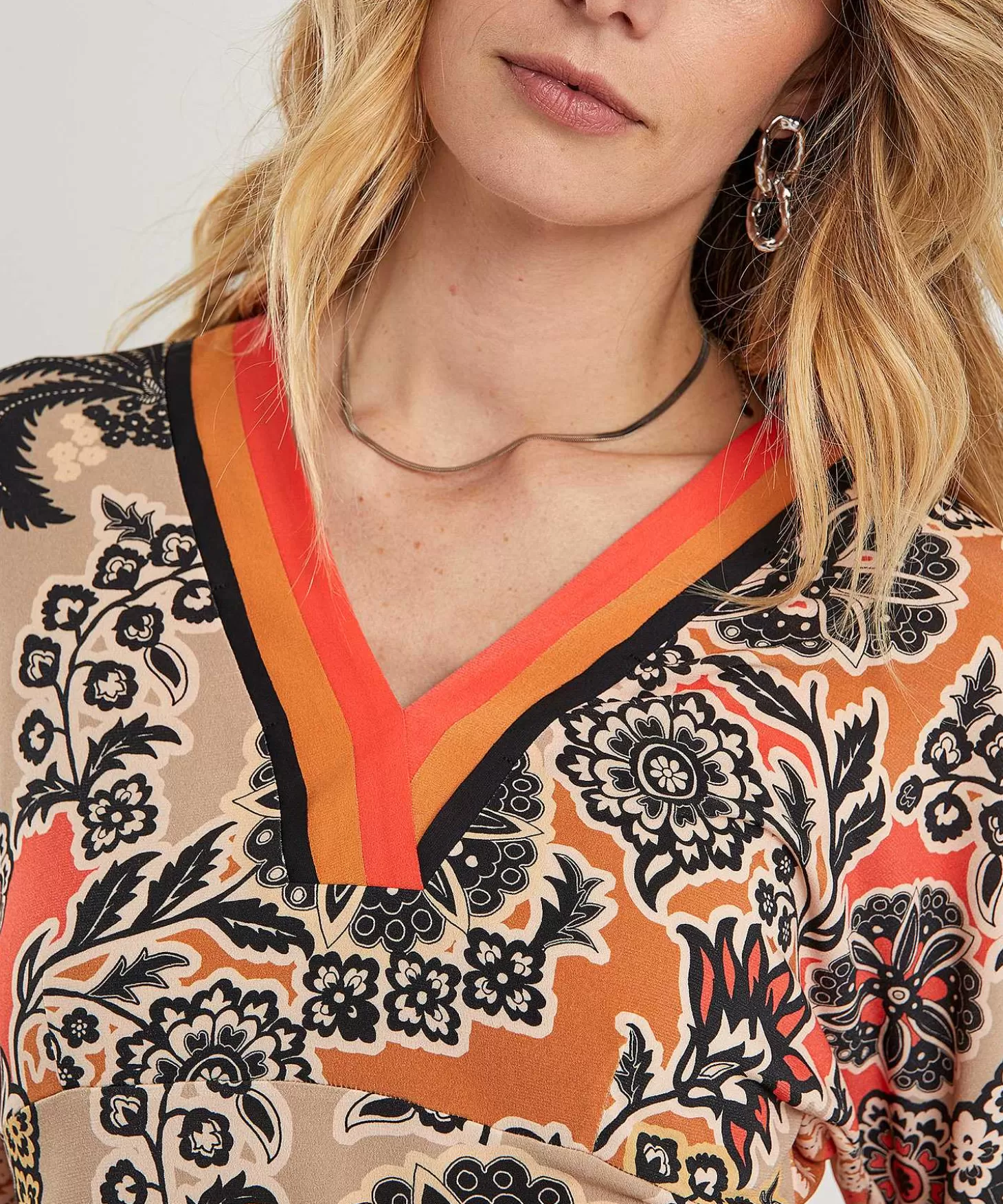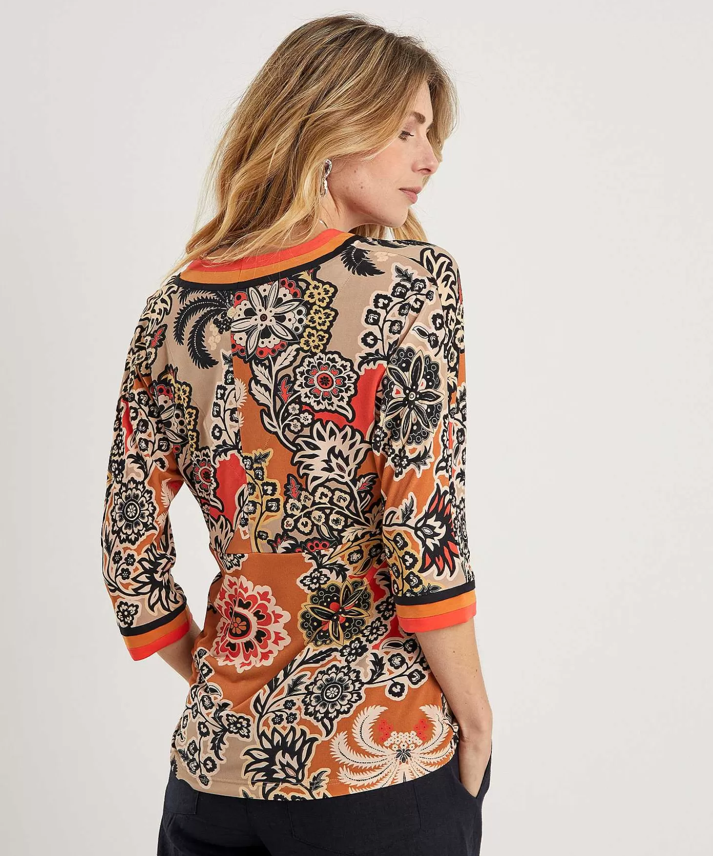 Retro Meets Kimono Met Deze Slinky Marc Cain Top In Kimono Model. Wat Een Sprekende Retroprint Van Bloemen En Strakke V-Hals Omlijsting In Driekleur, Terugkomend In De Manchet Van De ¾E Aangeknipte Mouw. In Soepel Slinky Materiaal Met Lichte Glans En Een Warm Kleurpalet + Zwart Omlijst Bloempatroon Valt Deze Top Relaxt Aansluitend En Heeft Ze Een Hoge Taillelijn Tot Onder De Borst.