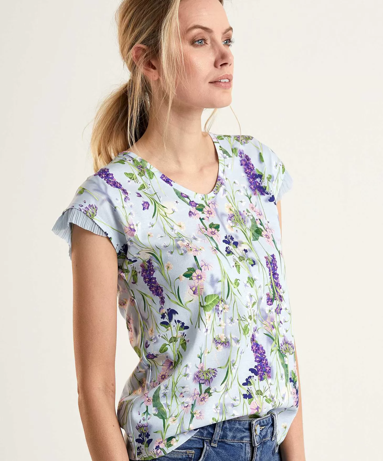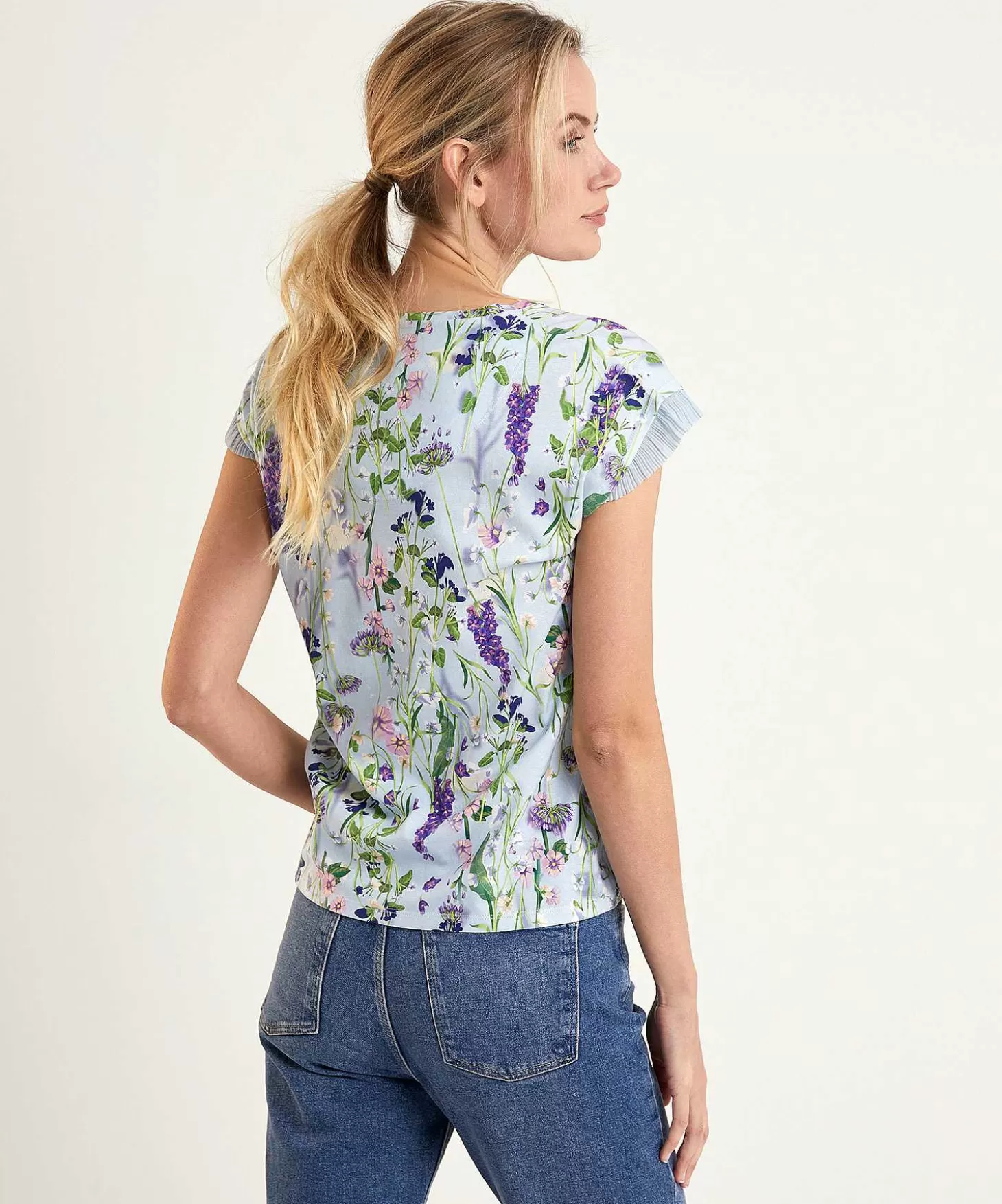 Elegant En Gracieus Dat Is Marc Cains Thema: Swan Opera. Een Lieflijke Combinatie Van Bloemen In Zachte Tinten Op Een Lichtblauwe Ondergrond Vind Je Terug Op Dit Shirt Met Ronde Hals En Geplisseerd Kapmouwtje. Combineer Met De Zachte Tinten Als Lila, Roze Of Zand Of Kies Juist Voor Net Wat Meer Contrast Door Donkerblauw Of Paars Toe Te Voegen. Kies Voor Een Wide Leg Broek Of Juist Een Jeans! Hakken Of Sneakers Maken De Look Af. Samenstelling: 92% Katoen, 8% Elastan.
