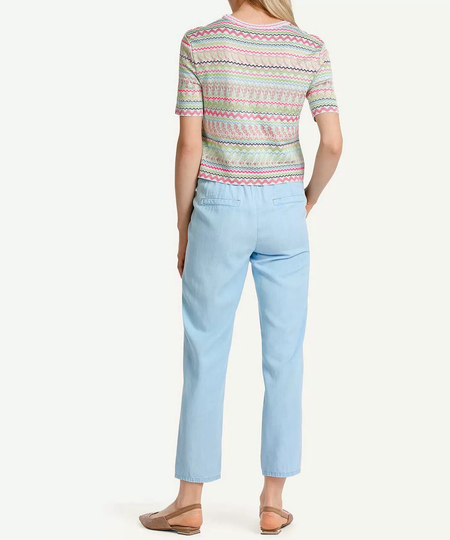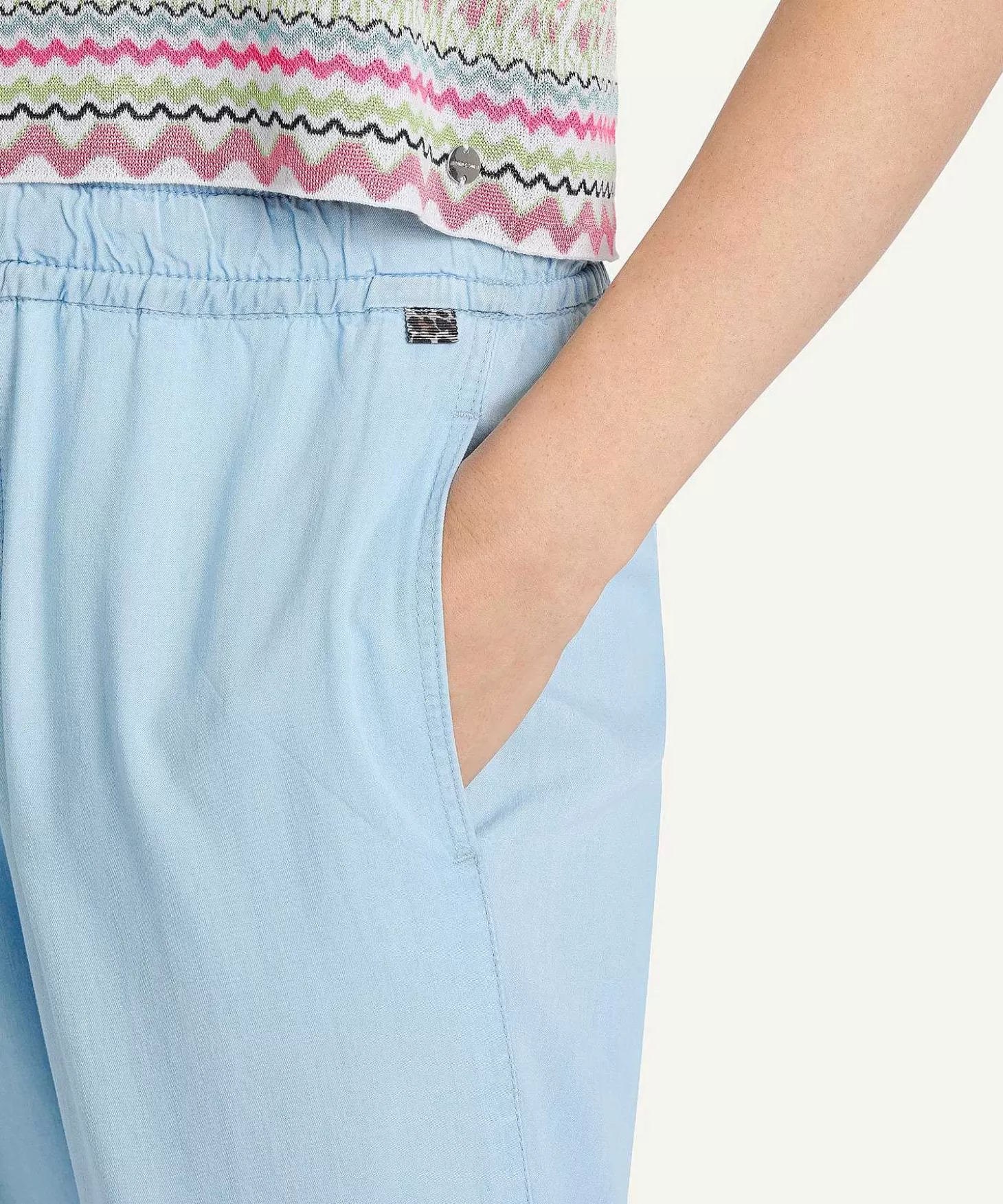 De Marc Cain Broek Rivera Is Een Luchtige Zomer ‘Chino’ In Lyocellmix. In Los En Sportief Model Met Haar Elastische Tailleband + Strikkoord, Steekzakjes En Paspels Achter Past Ze In Vele Outfits. Soepel En Met Taps Toelopend Pijpje Komt Ze In Neutraal Lichtblauw (Blue). Dankzij Haar Duurzame Materiaal Draag Je Zo Je Modesteentje Bij Aan Een Groenere Wereld.