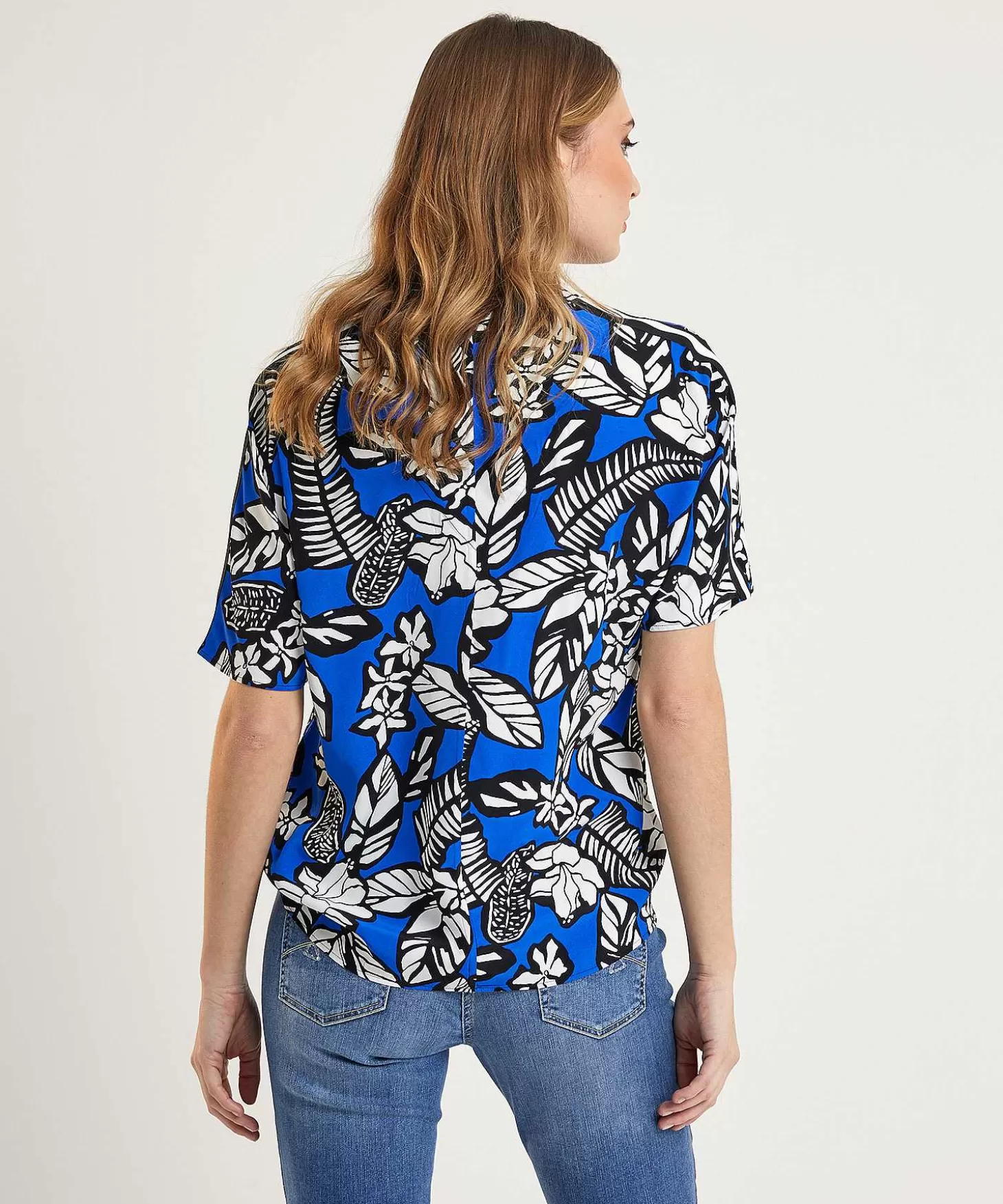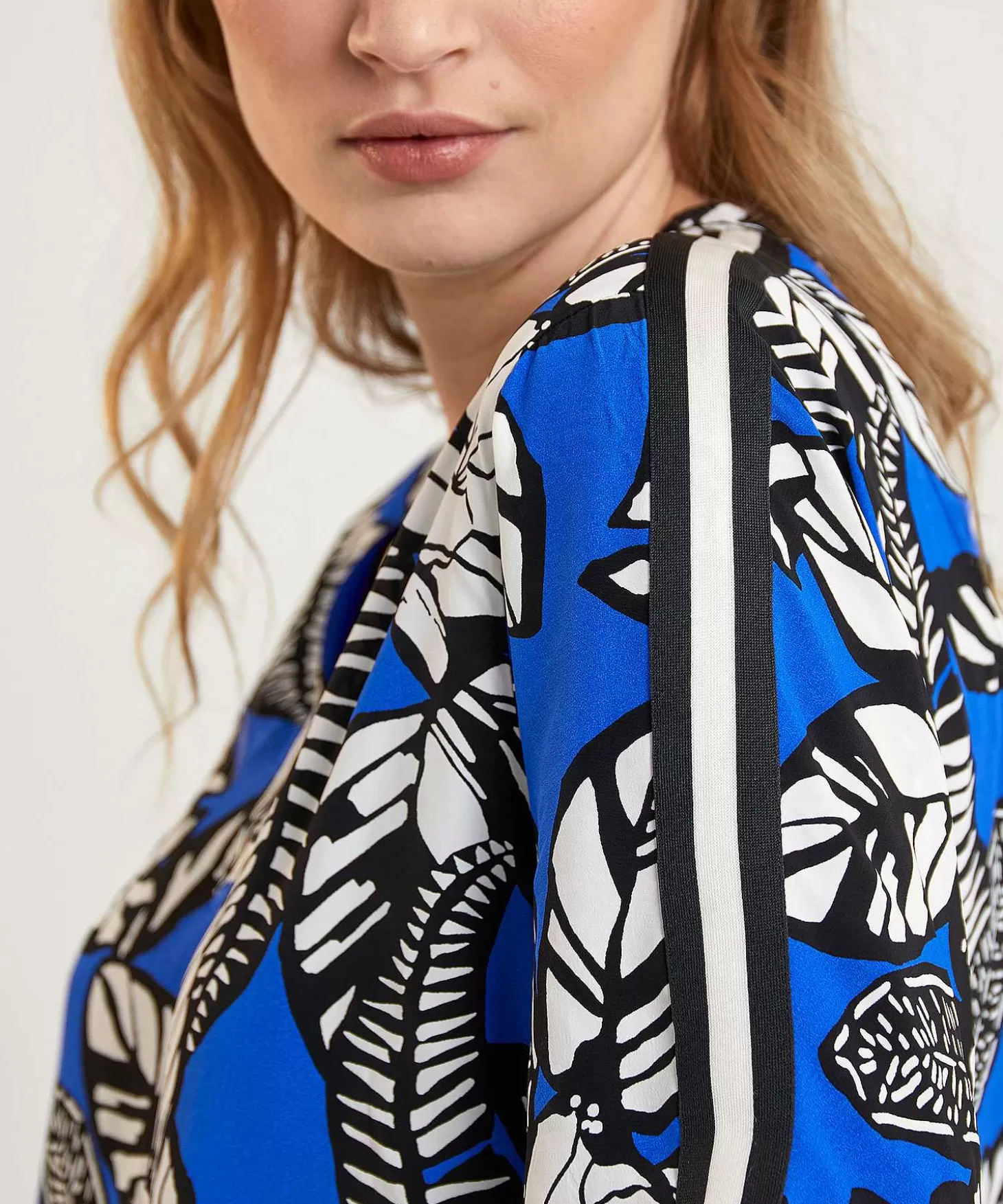 Met Haar Contrastrijke Bladprint In Oceaanblauw, Zwart En Wit Is Deze Marc Cain Blouse Ware Eye-Candy. Voel Je Haar Luchtige Matglanzende Viscose En Zie Je Haar Dubbele V-Hals En Streepbies Vanaf De Hals Langs De Mouw? In Een Los Model Met Een Iets Langer Achterpand Combineert Ze Perfect Met De Marc Cain Sports Plissé Rok En Loafers. En Wat Dacht Je Van De Match Met Een Wide Leg Jeans Of Smalle Broek + Sneakers? Uit Het Thema: Speed Up! Samenstelling: 100% Viscose ( Enka®).
