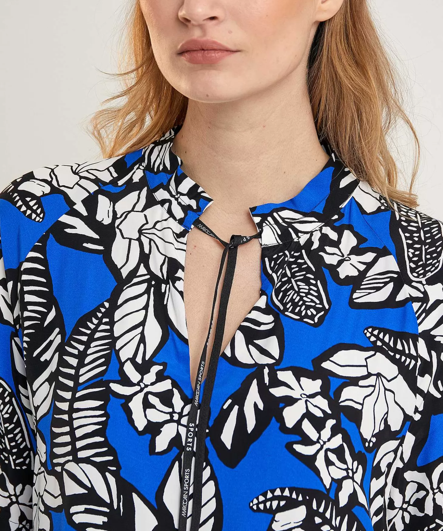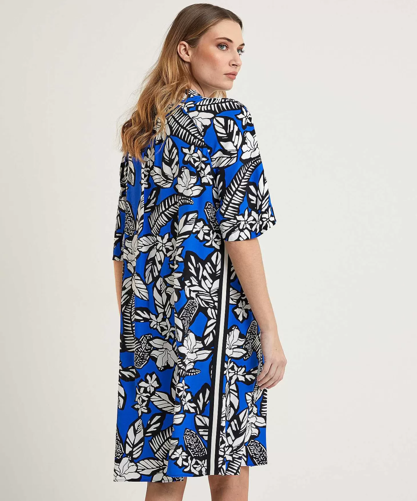Deze Marc Cain Sports Jurk Betovert Direct Met Haar Contrastrijke Bladprint. In Oceaanblauw, Zwart En Wit Is Dit Een Classy & Sporty Aanwinst Op Jouw Garderobe. Voel Je Haar Soepele Matglanzende Viscose En Zie Je Haar Kniphals Met Striklinten De Streepbies In De Zijnaad? In Los A-Lijn Model Past Ze Vele Figuurtypes (De Zandloper Draagt Er Een Wikkelriem Bij) En Ze Combineert Geweldig Met Vele Soorten Schoentjes. Van Sneakers, Laarsjes, Loafers Of High Heels – Speed Up! Your Outfit Was Zelden Zo Stijlvol. Uit Het Thema: Speed Up! Samenstelling: 100% Viscose ( Enka®).