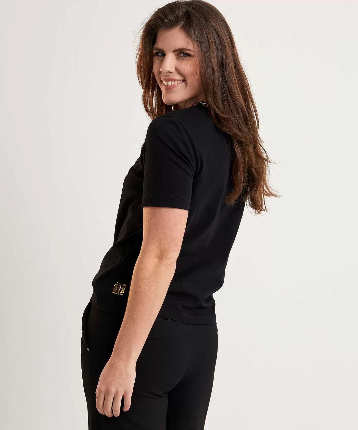 Walk On The Leoside Of Life Zegt Dit Marc Cain Sports Shirt Met Animal Biesje. Met De Versierde Hals En De Goudkleurige Folieprint Geeft Dit Losse Model Elke Outfit Sportieve Vibes. Draag Haar Met De Marc Cain Sports Scuba Broek Jungleprint Foshan En Sneakers Op Citytrip, Maar Ook Met Het Marc Cain Sports Kort Jack, Cargo Broek Rieti En Boots Ben Je Overal Picture Perfect. In Klassiek Zwart Of Offwhite Is Ze Tijdloos De Beste En Ze Past In Elke Outfit. Uit Het Thema Animal Crossing. Rethink Together. Samenstelling: 100% Katoen.