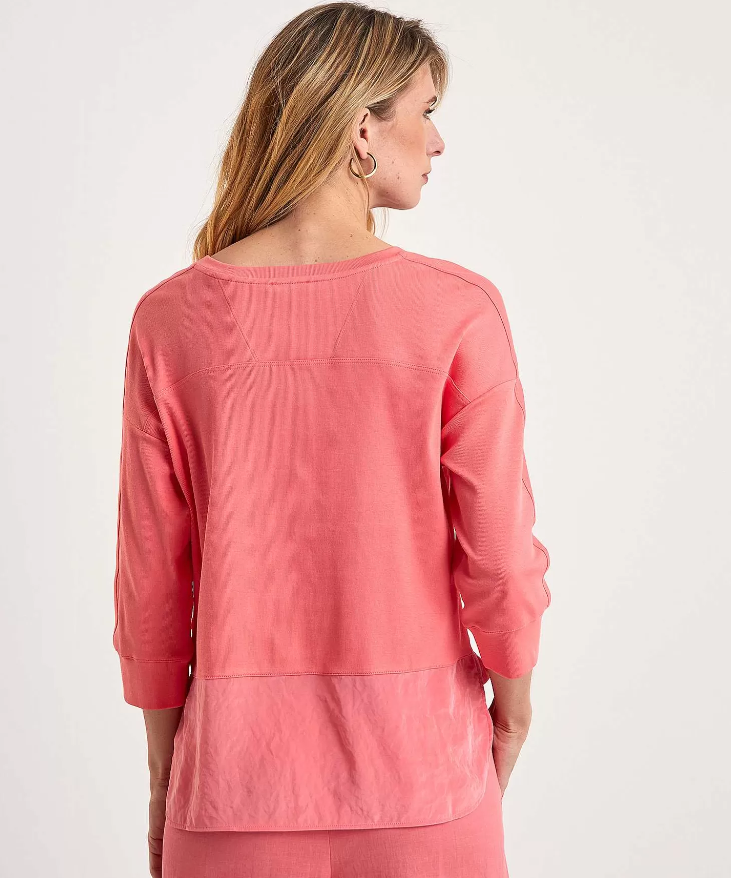 Silky & Sporty Mag Dit Marc Cain Sports Shirt Met Silky Voorpand Niet In Jouw Actieve Garderobe Ontbreken. Voel Je Haar Luchtige Parachutestof Met De Looks Van Zijde Gecombineerd Met Fijne Ribjersey En Zie Je Haar Subtiele Details? Naast Verschillende Siernaden Met Overlock-Stiksel Heeft Ze Een Ronde Zoom Met Zijsplit En Een Iets Langer Achterpand Met Brede Strook Silky Stof Onderaan. De 3/4E Mouw Is Sportief Laag Ingezet En Je Combineert Deze Top In Fris Koraal Met Veel. Zowel Met Een Jeans, Cargo Of Wide Leg Broek Als Met De Matching Silky Rok + Sneakers, Loafers Of Sandaaltjes. Waar Ga Jij Heen Met Deze Musthave Van Marc Cain? Uit Het Thema: Summer Pics. Samenstelling: 94% Katoen, 6% Elastan. Voorkant: 59% Polyester, 41% Gerecycled Polyester.