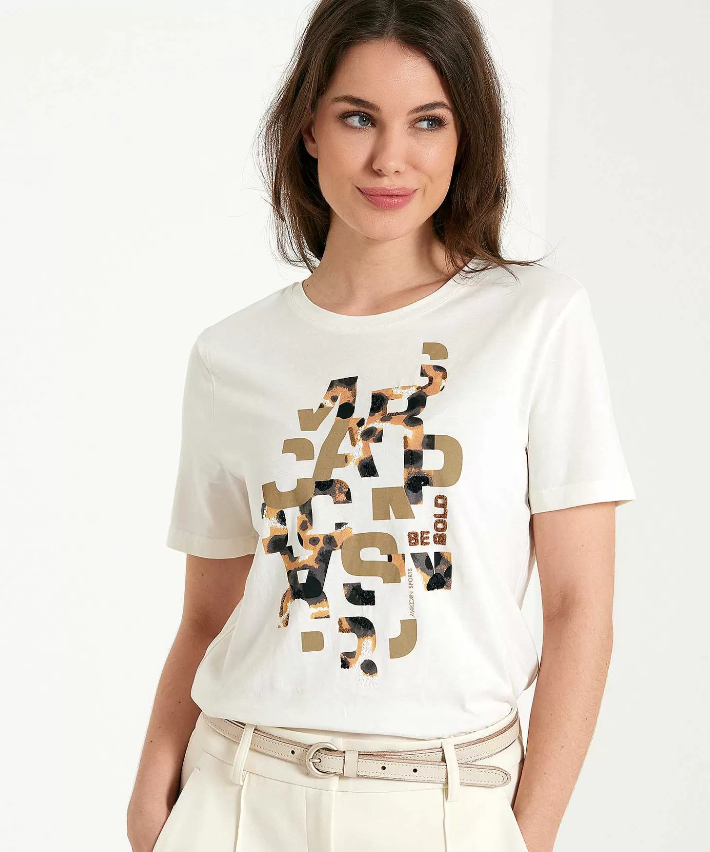 Fluweelzacht En Uitgesproken Springt Dit Marc Cain Sports T-Shirt Letter Voor Letter Jouw Garderobe In. Wat Een Sportief Model In Streelzachte Ecu-Kleurige Katoen En Wat Een Levendige Letteropdruk In Animalpatroon, Borduursel En Pailletten. In Camel, Taupe, Offwhite, Grijs En Zwart Past Ze Bij Veel Uit Jouw Kledingkast. Match Haar Met Een Wollig Vest, Een Jeans + Boots Op Citytrip. Maar Ook Met Een Blazer, Scuba Broek Of Pantalon En Laarsjes Ga Je Klassiek Sportief Op Modepad. This One Is A Keeper! Samenstelling: 100% Katoen.