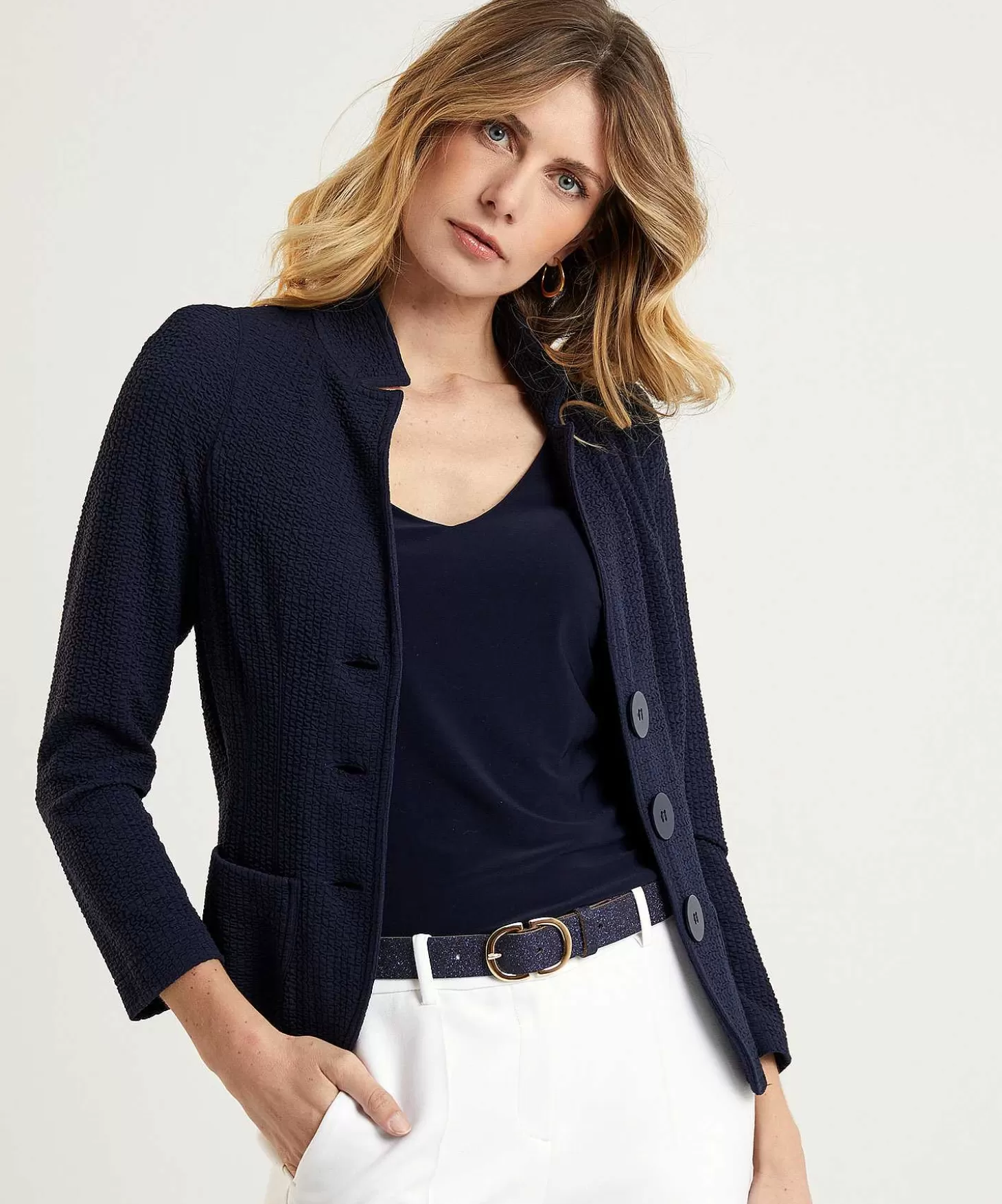 Met Haar Fijne Structuurstof Is Deze Ml Collections Blazer Een Tijdloze Aanwinst Op Jouw Garderobe. Voel Je Haar Stretchy Materiaal En Aansluitende Pasvorm En Zie Je Haar Neutrale Marine Of Witte Kleur? Dit Merk Staat Bekend Om Haar Perfecte Pasvorm, Getailleerde Modellen En Verrassende Materialen, Kleuren En Texturen. In Een Blazer Van Ml Collections Ben Je Altijd Goed Gekleed. Karakteristiek Zijn De Doorgestikte Revers, Figuurnaden, Royale Knopen En Praktische Zakjes, Net Als De Schoudervulling En De Stretchy Stof (Ongevoerd). Je Combineert Haar Met Een Blouse, Pantalon En High Heels Naar Een Feestje. En Wat Dacht Je Van De Match Met Een Streepshirt, Een Jeans En Loafers (Of Sneakers) Op Citytrip? Samenstelling: 70% Viscose, 30% Polyamide.