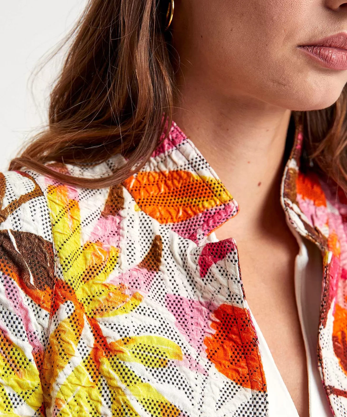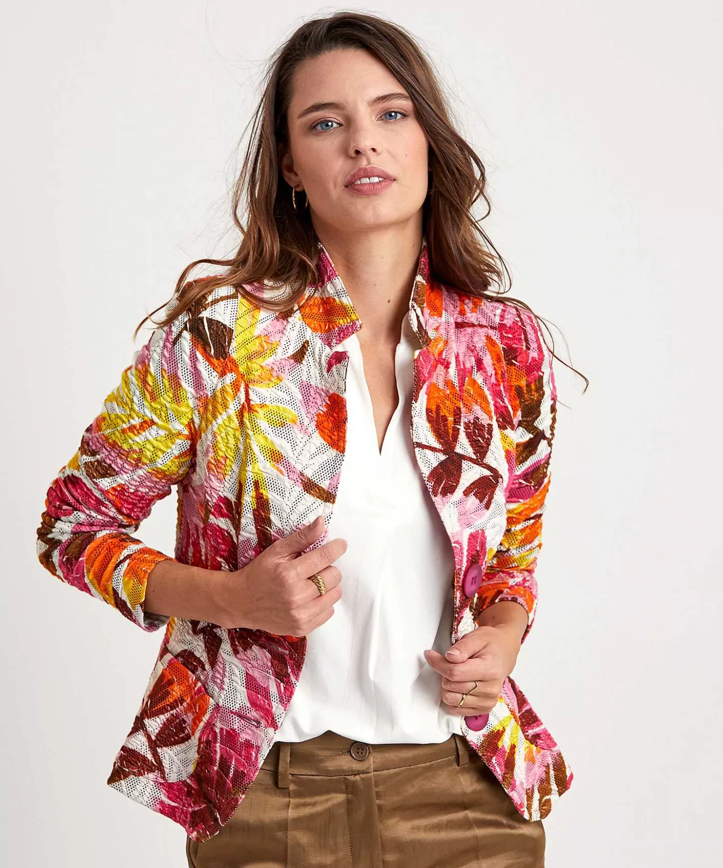 Deze Stretchy Ml Collections Blazer In Speelse Structuurstof Ademt Één En Al Zomer. Wat Een Vurige Bladprint In Rood/Pink En Geel Op Wit En Zie Je Het Schaduw Stippatroon? Ml Collections Staat Bekend Om Haar Getailleerde Fit, Feminien Figuurnaden En Karakteristieke Blazer Details. Naast Een Opstaande Reverskraag Heeft Ze Royale Knopen, Subtiele Schoudervulling En Opgestikte Zakjes En Ze Past Bij Veel. Je Draagt Haar Met Een Uni Hemdje, Een Rokje Of Pantalon En Loafers Of High Heels Naar Een Bruiloft Of Andere Party. Maar Ook Met Een Top, Een Jeans En Laarsjes Of Sneakers Ben Je Office- En Partyproof. Let Op: Deze Blazer Is Ongevoerd En Daardoor Klaar Voor De Lente En Zomer. Samenstelling: 62% Katoen, 26% Polyester, 10% Nylon, 2% Elastan.