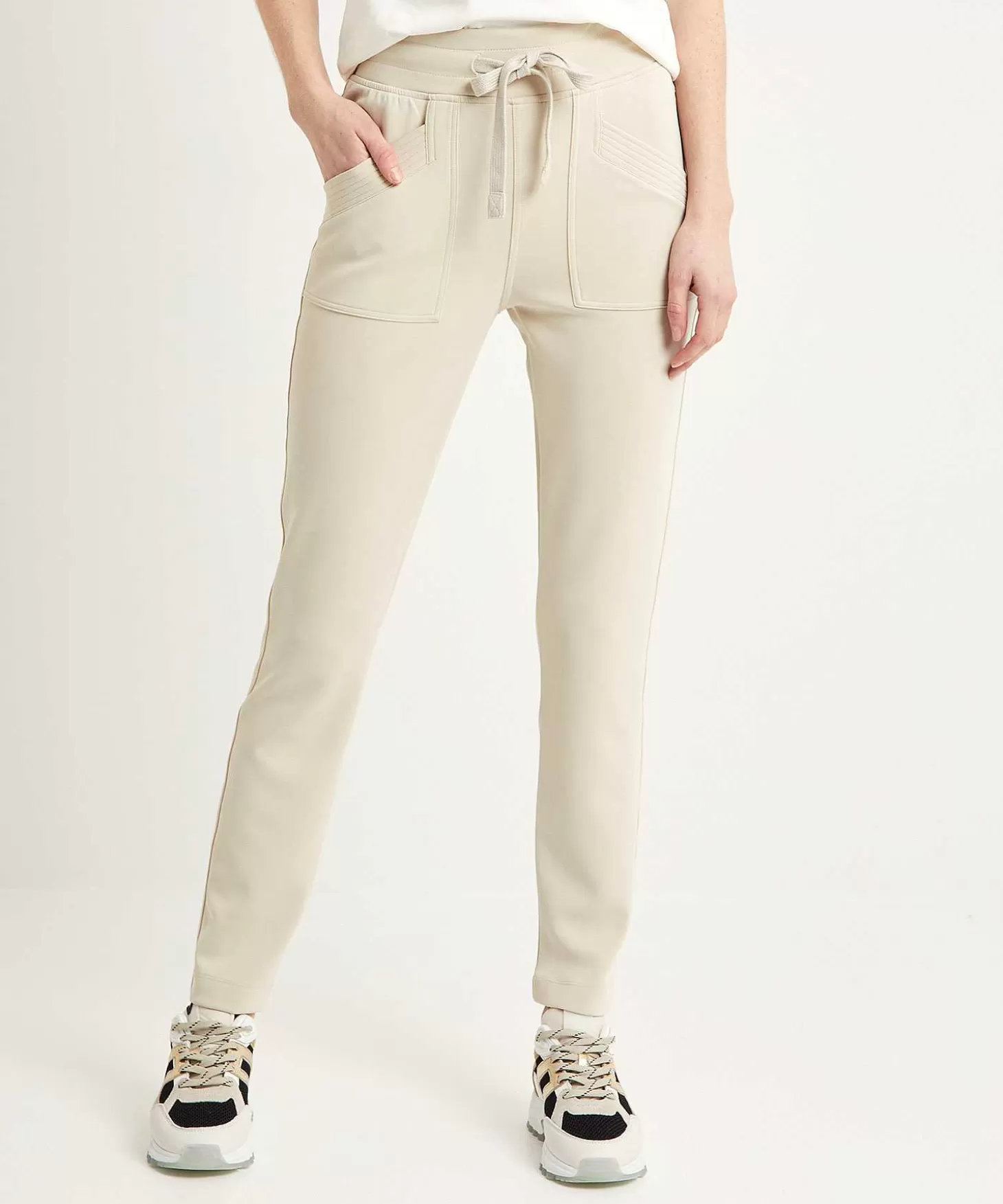 Felix Is De Perfecte Jogger Van Moscow Met Haar Fluweelzachte Soft-Feel. In Sportief Slank Gesneden Model Met Figuurnaden, Brede Stiklinten, Een Elastische Tailleband En Vierkante Steekzakken Met Doorgestikte Randen Komt Ze In Neutraal Zand Of Marine. Je Draagt Deze Jogpants Met Fijne Knitwear, Een Blouse + Blazer, Bretonse Streeptop Of T-Shirt. Sneakers, Loafers Of Laarsjes Eronder En Weg Ben Je. Samenstelling: 50% Modal, 45% Polyester, 5% Elastan.