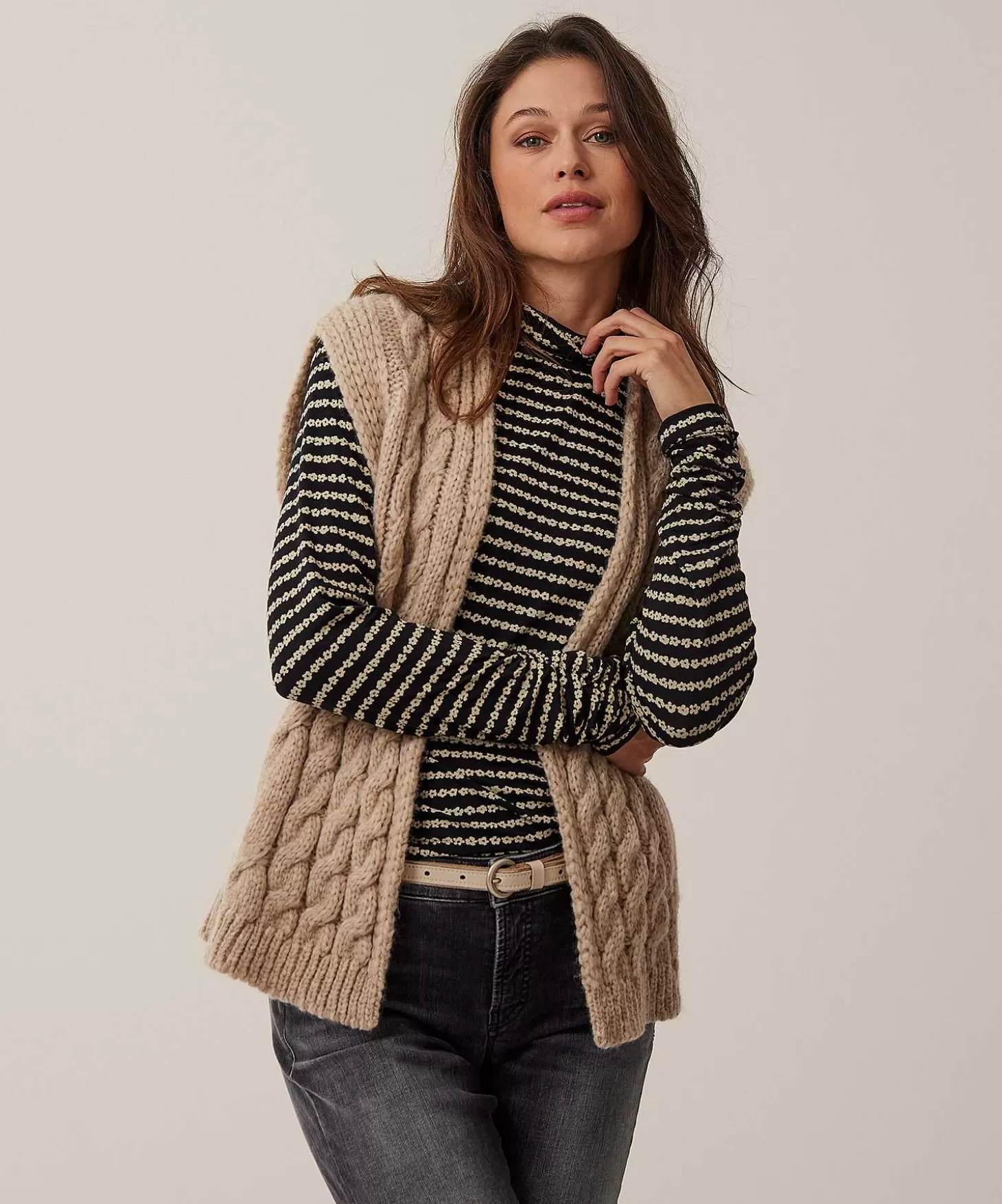 Kabels In Verschillende Diktes En Omvang, Daarmee Is Dit Streelzachte Mouwloze Vest Birma Van Moscow, Gebreid. De Kabel Is Tijdloos, Vanuit De Generatie Van Onze Oma’S Tot De Hedendaagse Uitvoering, Het Kan Allemaal. Het Warme Vest Uitgevoerd In Een Wolmix, Heeft Verlaagde Schouders Met Een Lichte Kapmouw. De Zachte Beige Kleur Laat Zich Graag Combineren Met Andere Natureltinten, Stem Je Broek En Top Daarop Af, Maar Kies Ook Voor Een Hagelwitte Blouse En Een Blauwe Jeans. Of Draag Dit Gilet Over Je Lange Jurk. Samenstelling: 55% Alpaca, 23% Zuiver Scheerwol, 22% Polyamide.