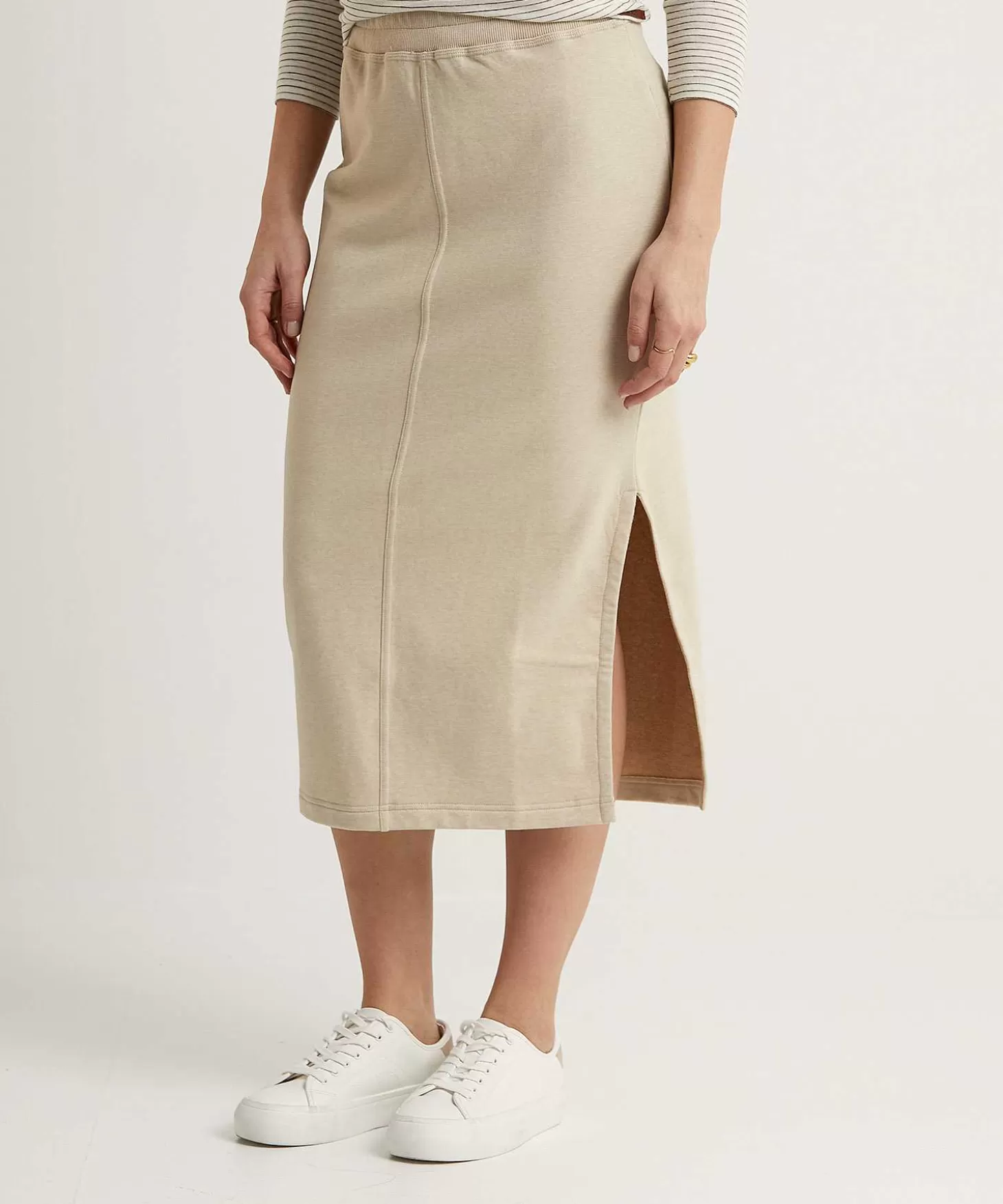 No Sweat Met Deze Moscow Sweatrok In Comfortabele Katoenmix. Zie Je Haar Neutrale Zandkleur En Haar Feminien Kokerrok Model Met Zijsplit? In Stretchy Jersey Met Een Elastische Tailleband En Verticale Deelnaden Voor Een Afslankend Effect Past Deze Rok In Vele Outfits. Met Haar Lengte Tot Ruim Over De Knie Matcht Ze Perfect Met Een Moscow Sweater Of T-Shirt + Sneakers Of Loafers. Chiara Is Definitely A Keeper. Samenstelling: 55% Katoen, 30% Polyester, 12% Polyamide, 3% Elastan.