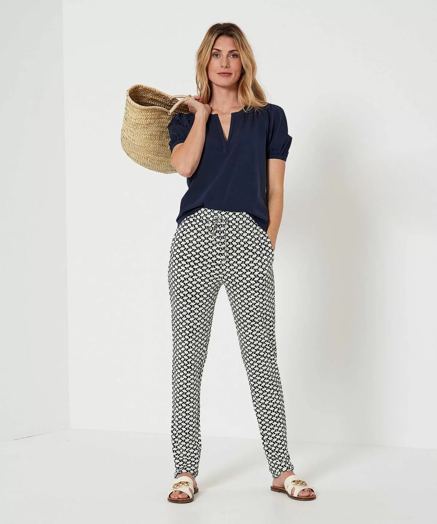 Slinky & Sporty Wordt Deze No Man’S Land Broek Jouw Zomerse Stapmaatje. Wat Een Speelse Grafische Print In Nachtblauw Op Ivoor En Wat Een Comfortabele Stretchy Fit In Slinky Materiaal. Zie Je Haar Elastische Tailleband Met Striklinten En Voel Je Haar Praktische (Verborgen) Steekzakjes? Je Draagt Deze Zwierige Broek Met Veel Uit Jouw Garderobe: Gecombineerd Met Een Blouse Of Top + Blazer En Loafers Op Je Werk Of Een Feestje. Op Vakantie Match Je Haar Met Een T-Shirt Of Zomerse Breisels En Sandaaltjes. Zeg Yes Tegen No Man’S Land. Samenstelling: 93% Viscose, 7% Elastan.