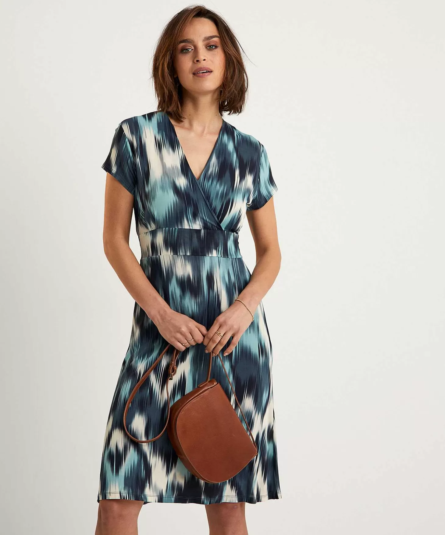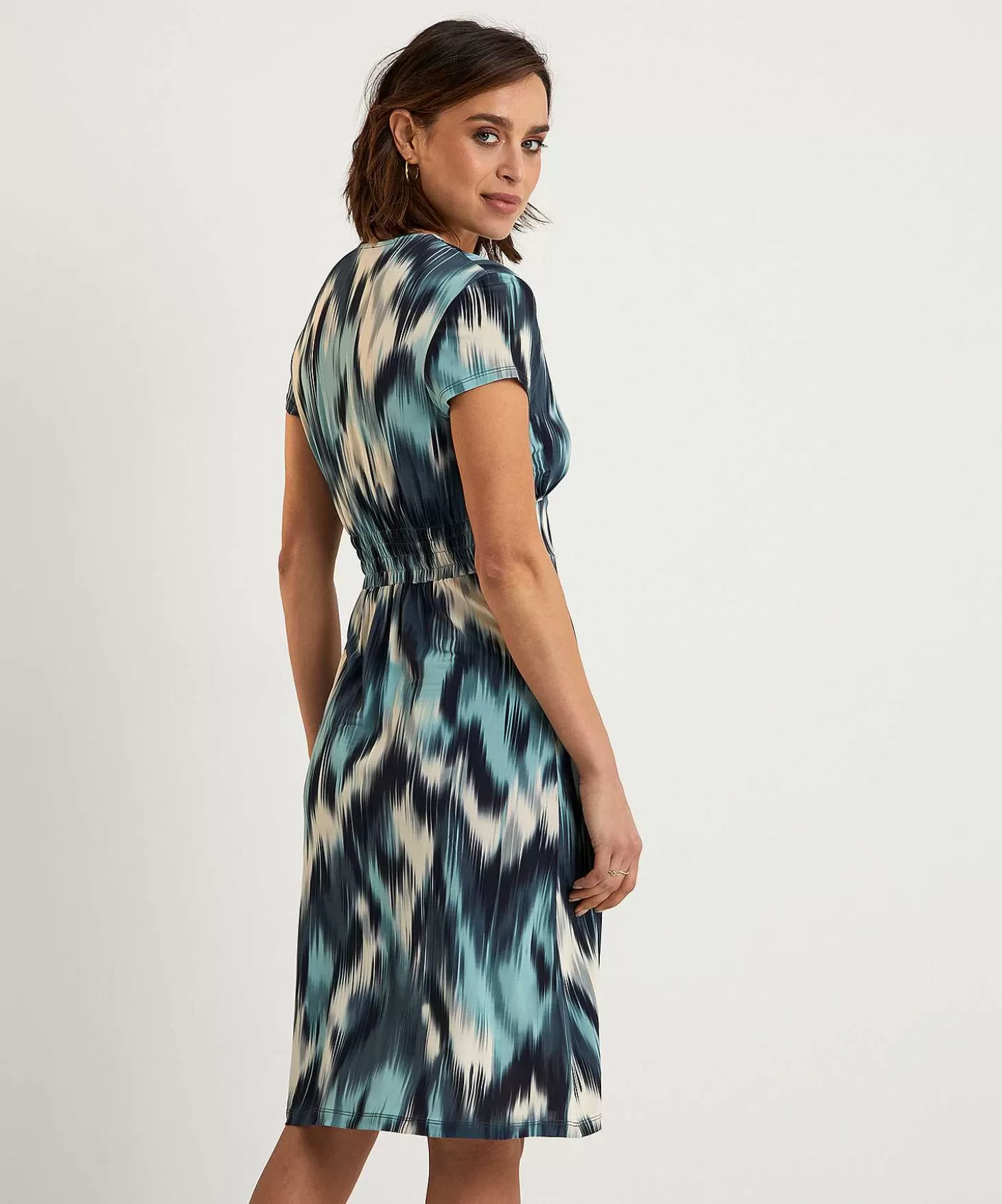 Tie-Dye Meets Slinky In Deze Soepele No Man’S Land Jurk Met Tie-Dye Print. Zie Je Haar Chique Kleurpalet In Offwhite, Licht En Donker Grijsgroen En Nachtblauw En Voel Je Haar Soepele Stretchy Materiaal? In Een Uitlopend (A-Lijn) Model Met V-Hals, Kort Mouwtje, Vaste Overslag En Hoge Taillelijn (Empire) Is Ze Super Feminien En Ze Draagt Heerlijk Met Hoge Temperaturen. Ze Heeft Achter Ook Nog Een Fraai Smockdetail Voor Een Zandlopereffect. Combineer Haar Met Een Loafer, Sleehak Of High Heel En Je Danst Zo Van Je Werk Naar Het Terras, Een Borrel Of Feestje. Samenstelling: 93% Viscose, 7% Elastan.