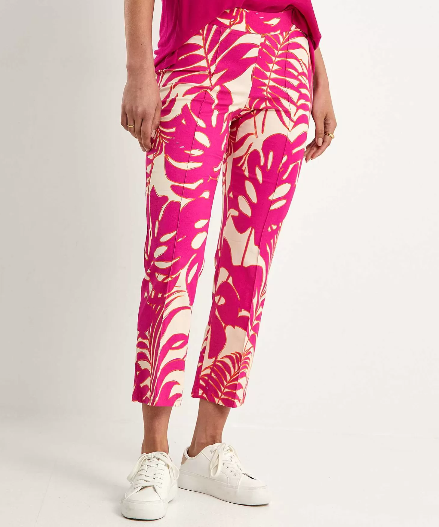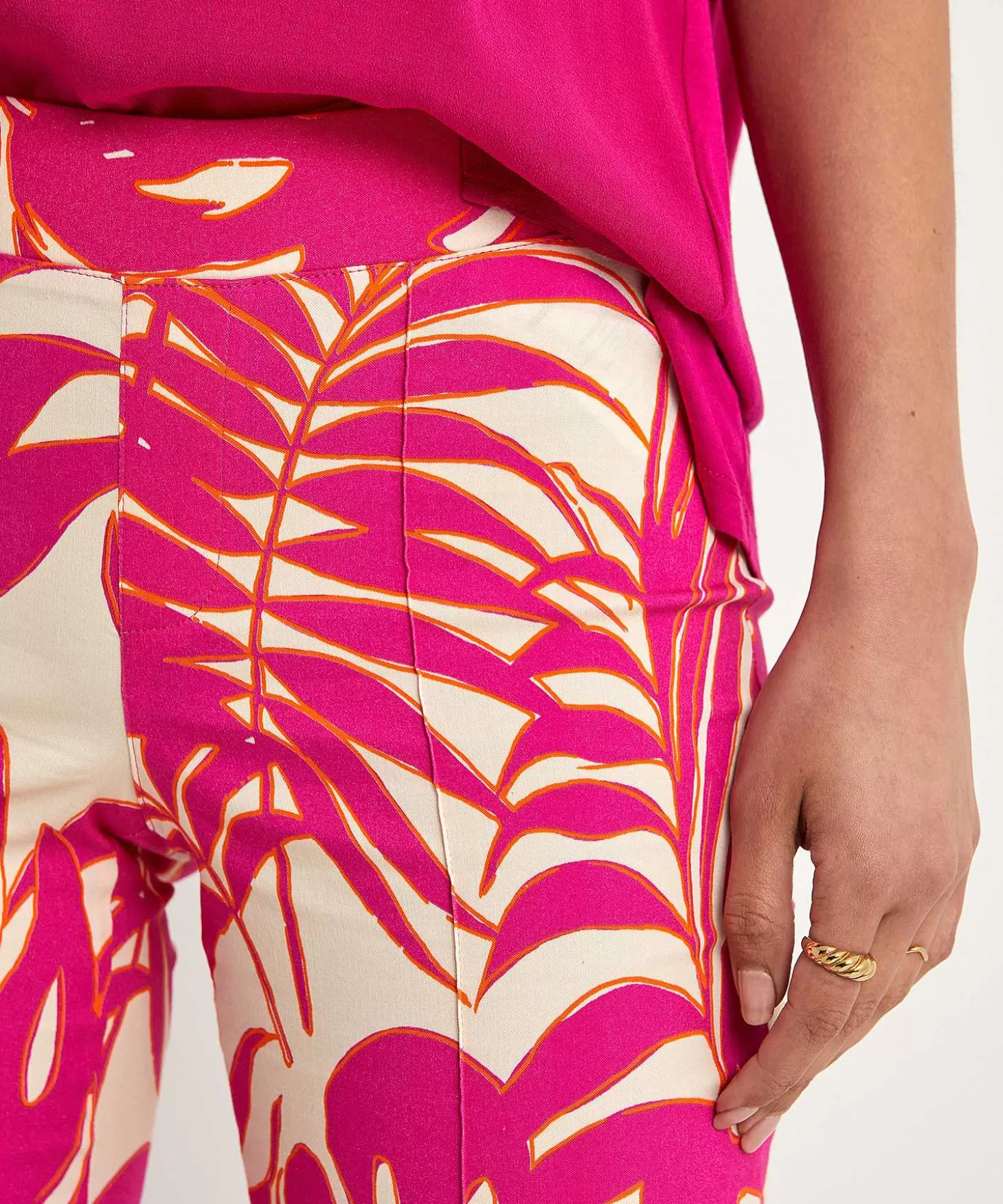 Met Haar Sportieve Cropped Lengte Is Deze Oui Broek Met Tropische Bladprint Ready For Summer. Voel Je Haar Stretchy Katoenmix? In Een Uitdagend Kleurpalet Van Pink Op Ecru Met Mandarin Accenten Geeft Deze Zomerboek Elke Outfit Sunny Vibes. Ze Heeft Een Elastische Tailleband, Doorgestikte Persvouwen En Haar Rechte Pijp Valt Ruim Boven De Enkel.