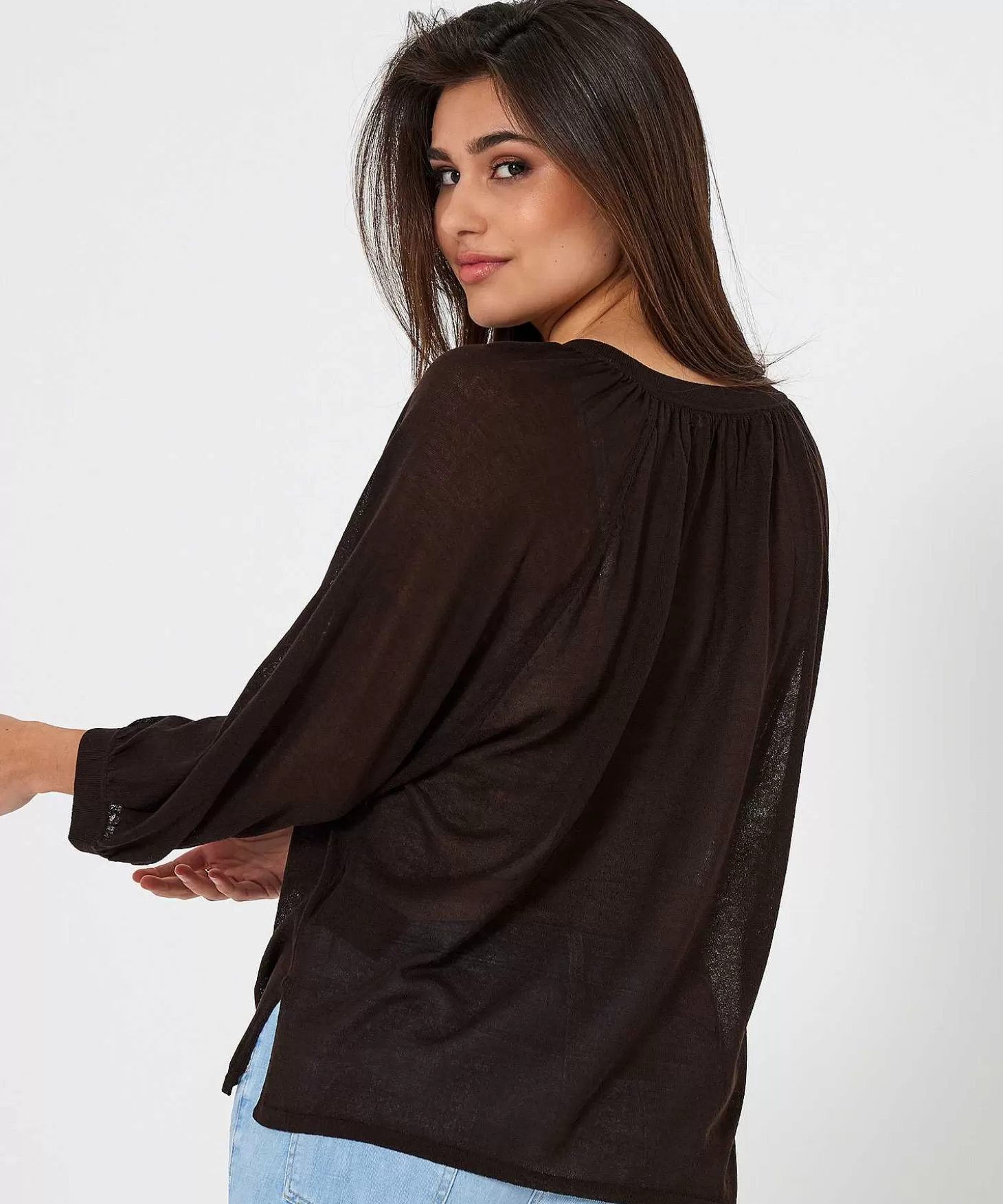 Met Haar ‘Droge’ Breisel Flirt Deze Jersey Top Van Oui Met Verve Met Een Truitje, Maar Ze Is Toch Echt Een Topmodel. Zie Je Haar Tuniekhals Met Knoopjes, 3/4E Raglanmouw In Ballonmodel En Losse Uitlopende Fit Met Zijsplitjes? In Semitransparante Donkerbruine Viscose Draagt Ze Zalig Luchtig En Had Ik Haar Plooitjes Al Genoemd Die Vanaf De Halslijn Naar Beneden Vallen? Je Draagt Haar Met Een Flared Jeans Of Wide Leg Broek + Sandaaltjes Voor De Ultieme Boho Look. Maar Ook Met Shorts Of Een Capribroek In Stralend Wit + Sneakers Ben Je City- En Beachproof. Samenstelling: 90% Viscose, 10% Polyamide.