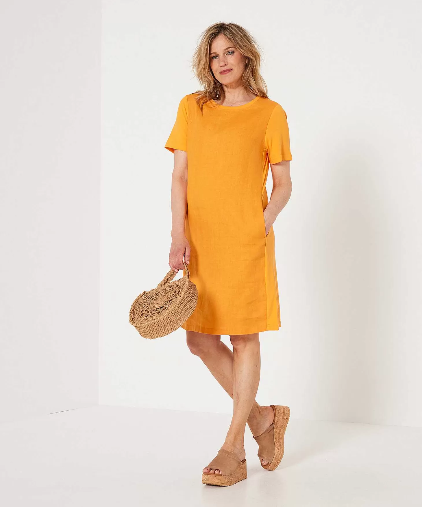 Let The Sun Shine & Hello Summer! Deze Linnen Oui Jurk Heeft Het Beste Uit Twee Materialen. Voel Je Haar Luchtige Linnen Voorpand En Comfortabele Achterpand Uit Jersey Katoen? In Zomers Mandarin Flirt Dit Ideale Zomerjurkje Met Tropische Kleurtjes Én Temperaturen. Zie Je Haar Ronde Hals, T-Shirt Mouw En Achterpand En Praktische Steekzakjes? Oh Nee, De Laatste Zijn Verborgen. Je Draagt Dit Losse Rechte Model Met High Heels En Rinkelende Sieraden Op Een Feestje Of Combineert Haar Met Een Printsjaaltje En Sandaaltjes Op Je Werk. En Wat Dacht Je Van Samen Met Sneakers En Een Denim Jasje Op Stedentrip? Oranje Is Absoluut Boven! Samenstelling: 100% Linnen. Achterkant: 100% Katoen.
