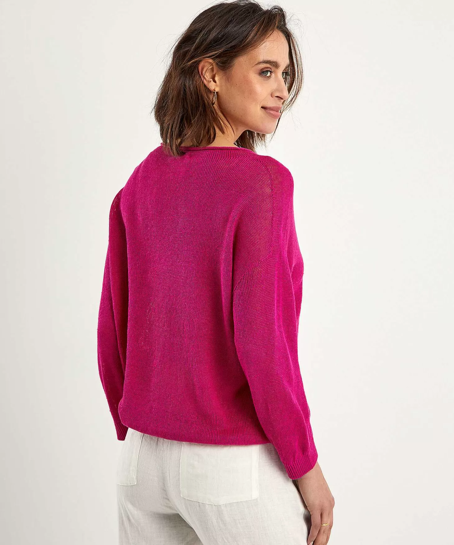 Dit Oui Truitje Van Puur Linnen Straalt Je Tegemoet In Deep Fuchsia. Met Haar Onregelmatige Fijne En Dunne Breisel (De Charme Van Linnen), Rolboordje, Laag Ingezette Lange Mouw En Wijde Fit Draagt Ze Heerlijk. Linnen Is Het Ideale Materiaal Voor Hoge Temperaturen En Deze Zomertrui Past Bij Veel.