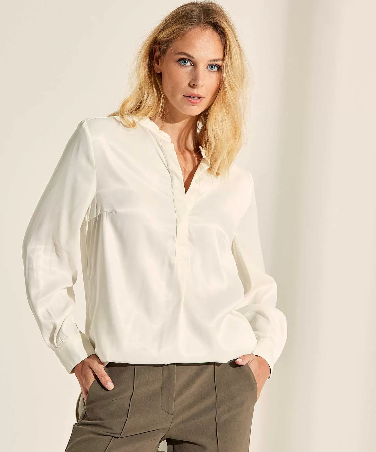 Silky Zacht, Vloeiend En Glanzend, Dat Zijn Zomaar Een Paar Steekwoorden Die Van Toepassing Zijn Op Deze Roomkleurige Tuniekblouse Uit De Collectie Van Oui. De Blouse In Een Rechtvallend Model Heeft Afgeronde Panden, Een Ronde Hals Die Sluit Met Een Deels Blinde Knoopsluiting. Een Klein Kraagje En Lange Mouwen Met Manchetten Met Knoopjes Maken Deze Blouse Af. Blouse Of Tuniek, In Ieder Geval Loopt De Knopenrij Niet Door Tot Onderaan De Blouse. Dat Maakt Dat Je Haar Zowel Stijlvol Chique Als Stoer En Sportief Kan Dragen. Geweldig Op Een Zwarte Pantalon Met Zwarte Blazer En High Heels, Maar Evengoed Geweldig Op Een Jeans Met Sneakers. En Wat Dacht Je Van Een Look In Alleen Maar Naturel Tinten? Samenstelling: 100% Viscose.