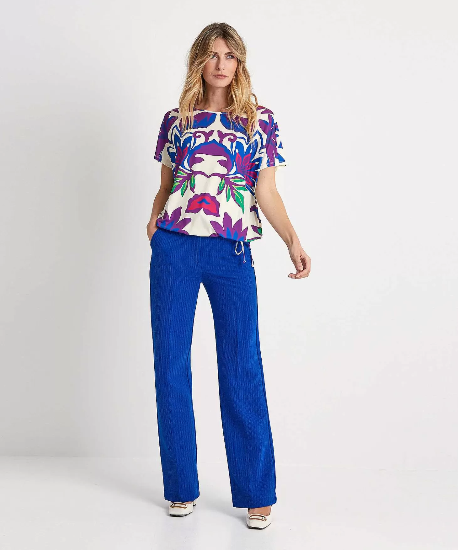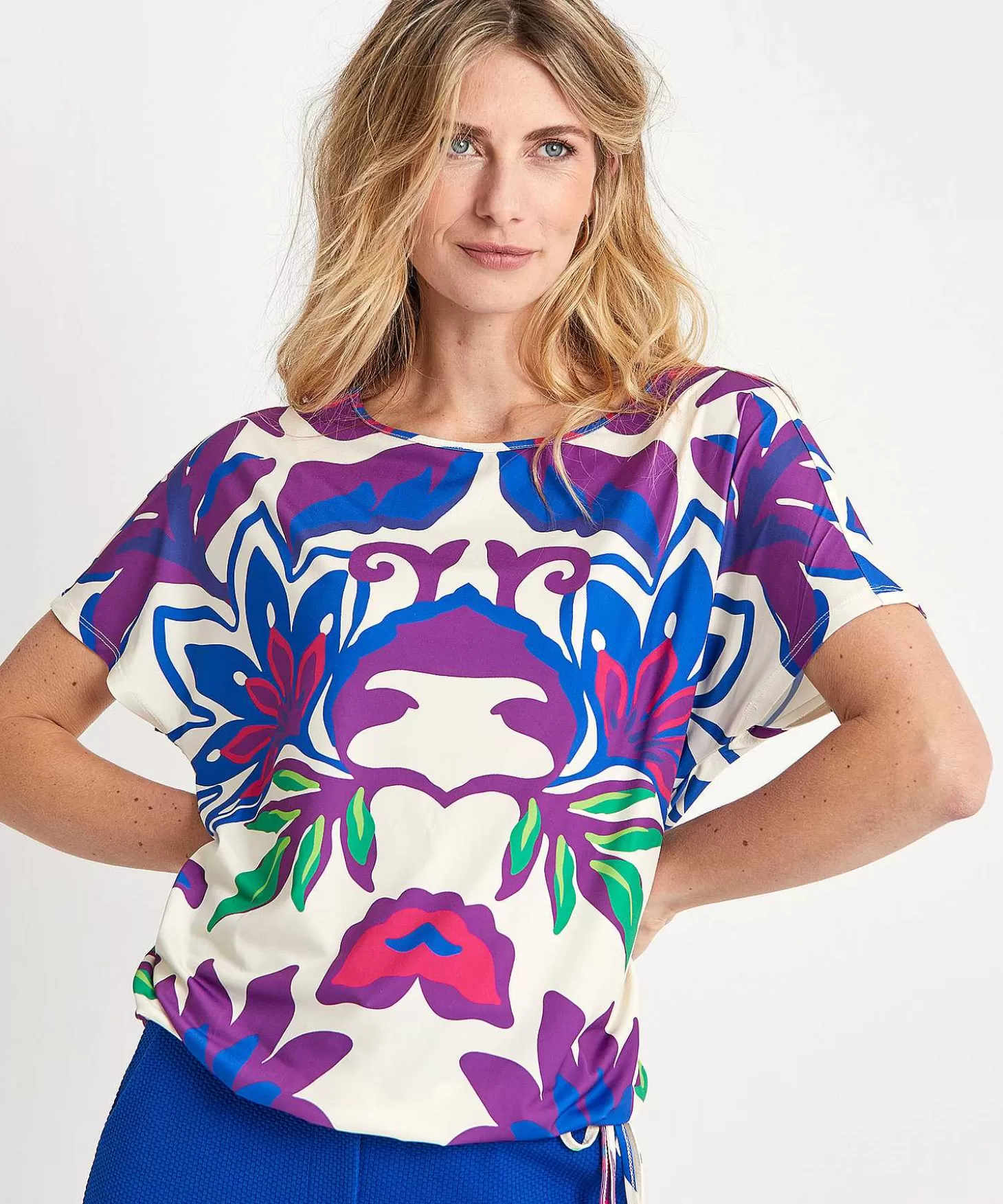Met Haar Big Flower Print Belooft Dit Oui Shirt Een Lange Zomer. Zie Je Haar Kleurrijke Bloemprint Op Ecru En Voel Je Haar Slinky Materiaal? Naast Een Wijde Hals Heeft Ze Een Kort Aangeknipt Mouwtje En Een Strikkoord In De Zoom Bij De Zijnaad, Zodat Je Dit Rechte Model Naar Wens Kunt ‘Croppen’. Je Draagt Haar Met Een Wide Leg Broek Of Jeans Met Sneakers Of Loafers En Wat Dacht Je Van De Match Met De Oui Plooirok En High Heels (Voor Een Suggestie Van Een Jurk) Voor Een Feestelijke Look? Samenstelling: 92% Polyester, 8% Elastan.
