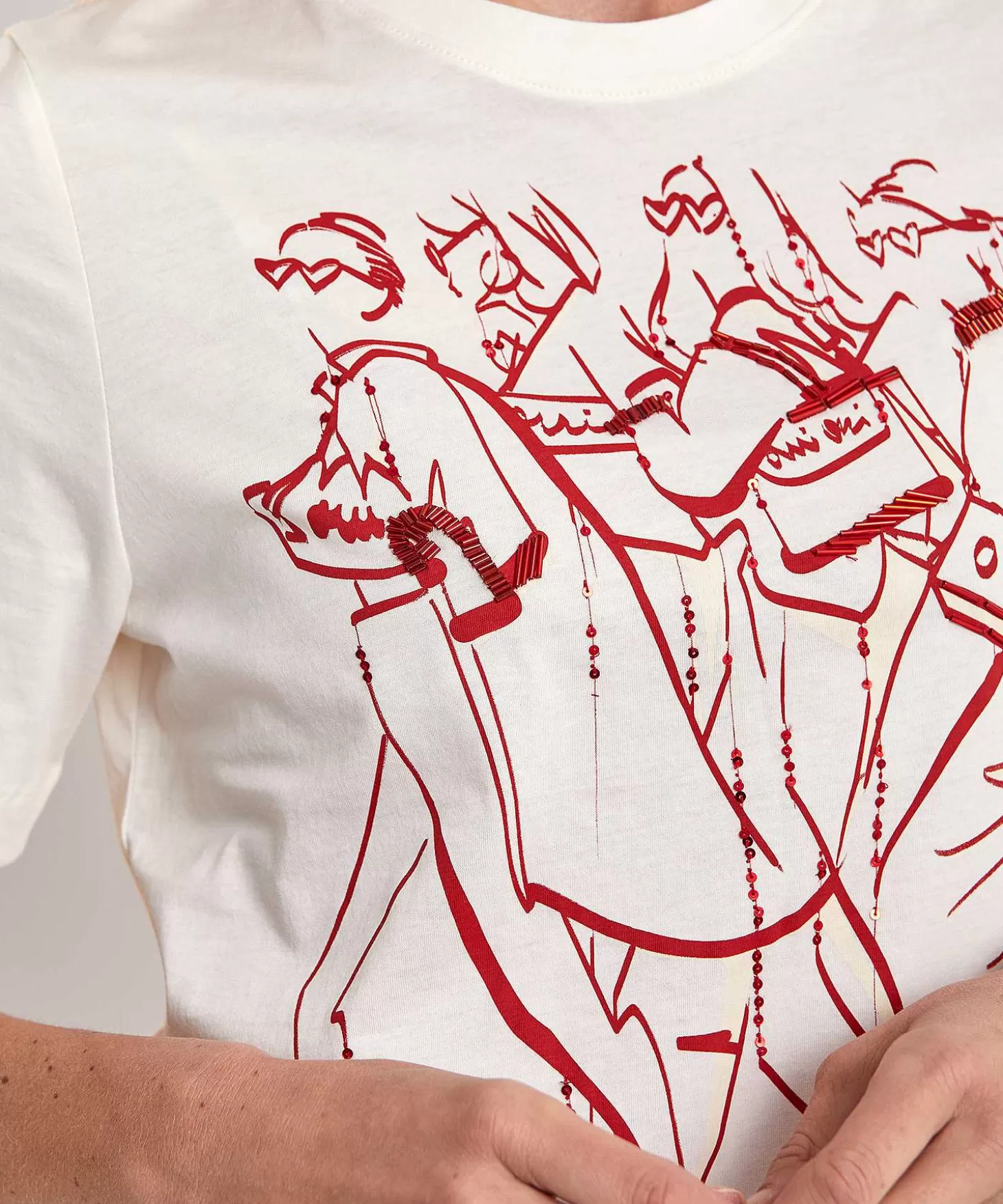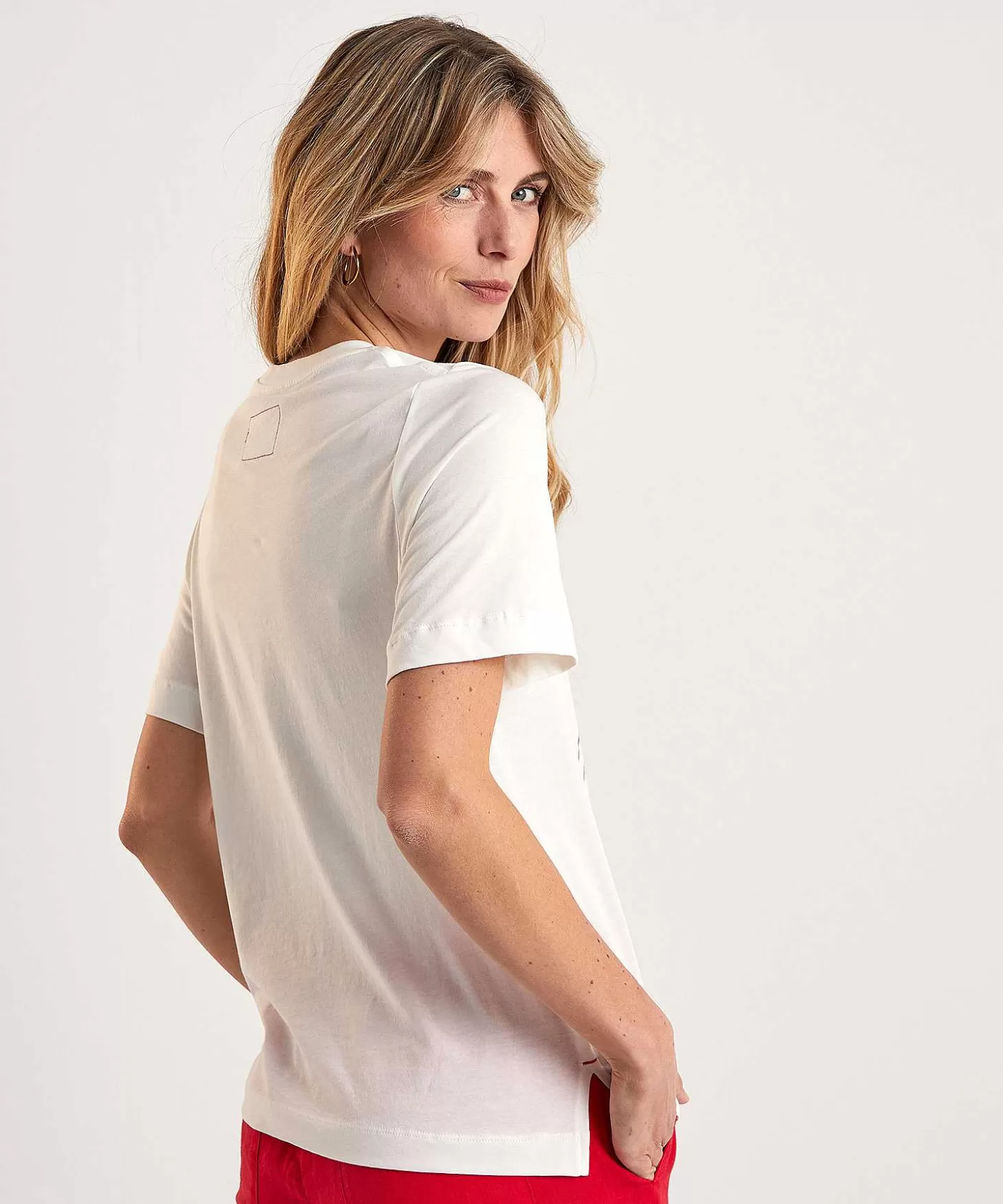 Met Haar Fashionprint + Kraaltjes Zegt Dit Oui T-Shirt Ja Tegen De Zomer. Wat Een Speels Model In Duurzame (Organische) Katoen En Zie Je Haar Illustratieve Print In Steenrood Met Glanzende Kralen? Haar Zomerse Offwhite Met Vlekjes Ecru Maakt Haar Een Ware Multimatcher Binnen Jouw Garderobe En Ze Past Perfect Bij Een Wide Leg Broek Of Jeans + Loafers Of Sneakers. Met Een Vestje Of Blazer + Rok Draag Je Haar Stijlvol Het Jaar Door En Met Haar Tijdloze Print Verveelt Ze Nooit. Samenstelling: 100% Biologisch Katoen.
