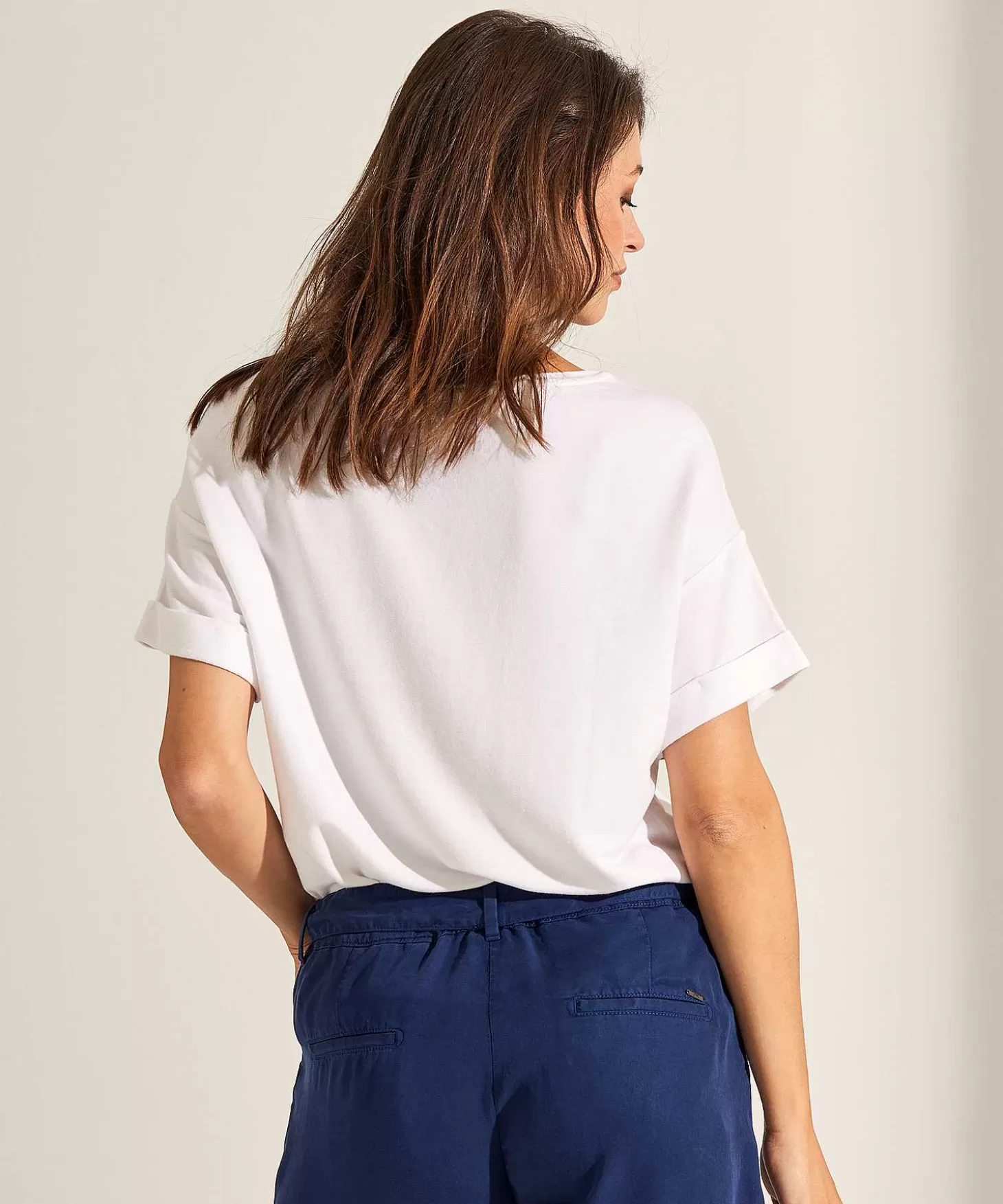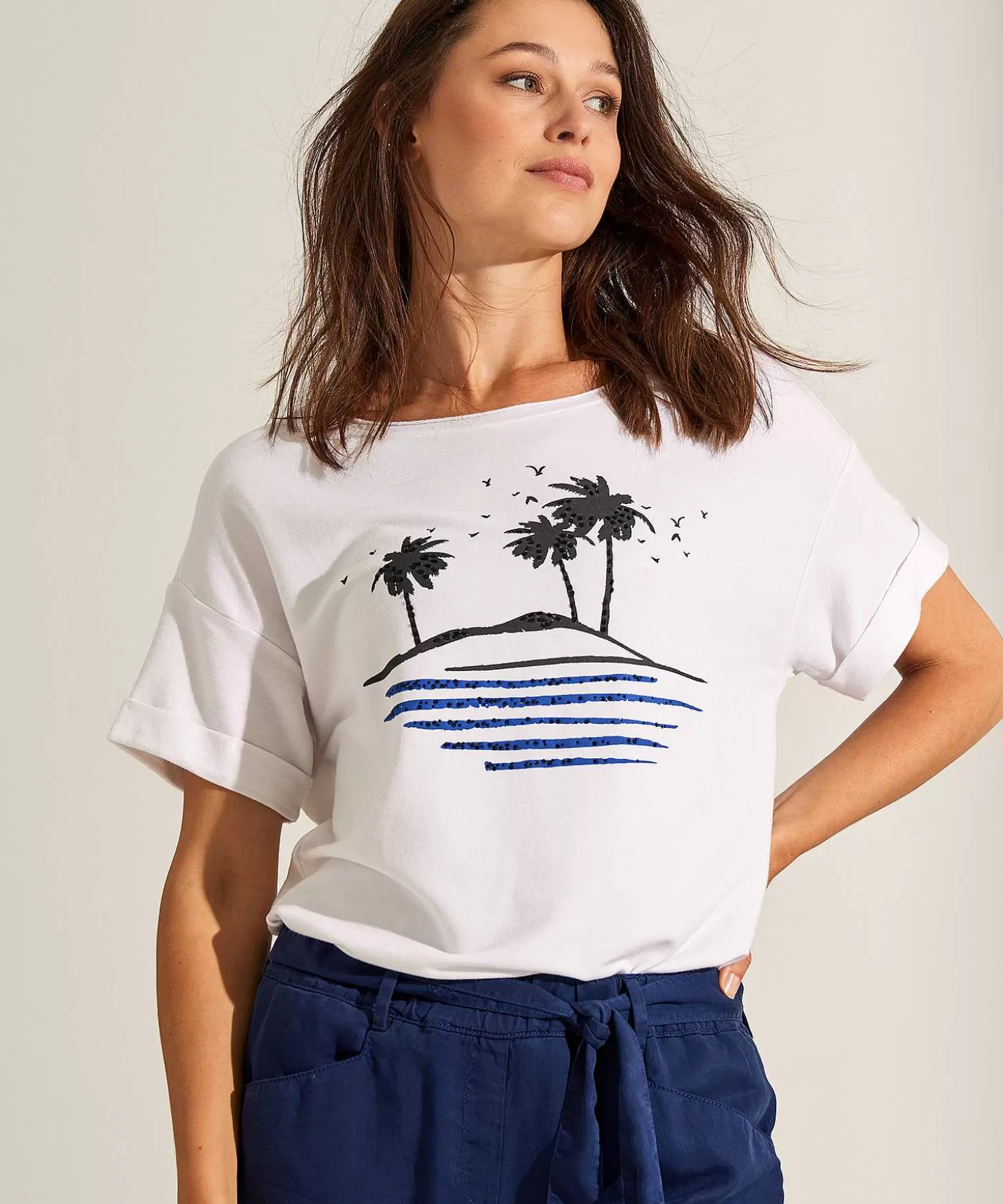 Nothing Beats A Classic T En Dit Oui T-Shirt Met Palmbomen Aan De Oceaan Belooft Een Lange Zomer. Zie Je Haar Sparkling Studs Én Kraaltjes, Oceaanblauwe Golfjes, Wuivende Palmen En Meeuwenzwerm? Met Haar Streelzachte Witte Modal/Katoenmix, Laag Ingezette Mouwtje Met Vaste Omslag En Zijsplitjes (En Langere Achterpand) En Tropische Print Is Ze Een Ware Zomergast. Draag Haar Met Een Palazzo, (Capri)Jeans, Shorts Of Printbroek Met Sneakers Op Sportieve Vakantie-Avonturen. Maar Ook Met Een Sweatrok En Loafers Of Met Een Wide Leg Broek + Vestje En Sandaaltjes Ben Je Party- En Officeproof. Samenstelling: 70% Modal, 25% Katoen, 5% Elastan.