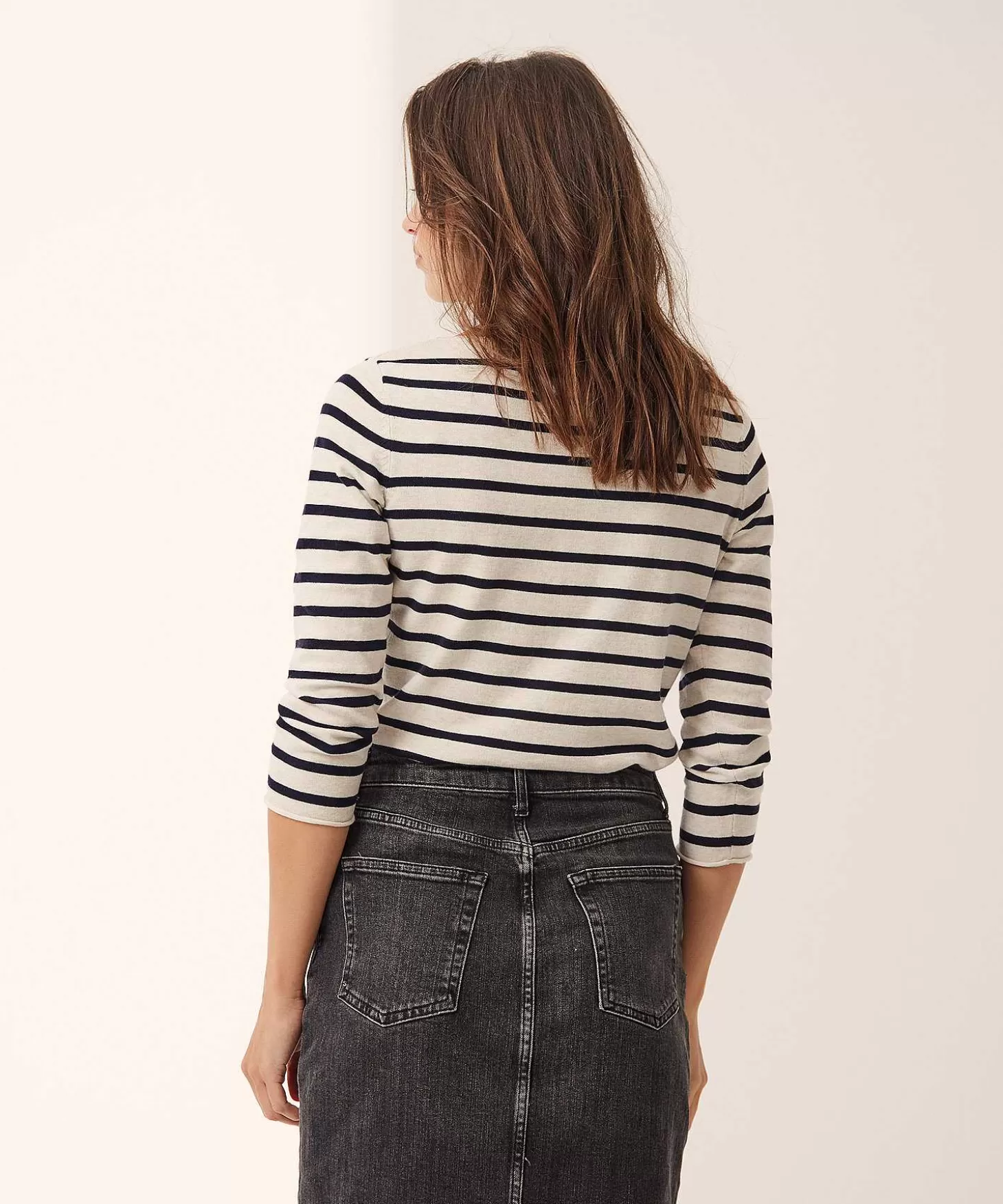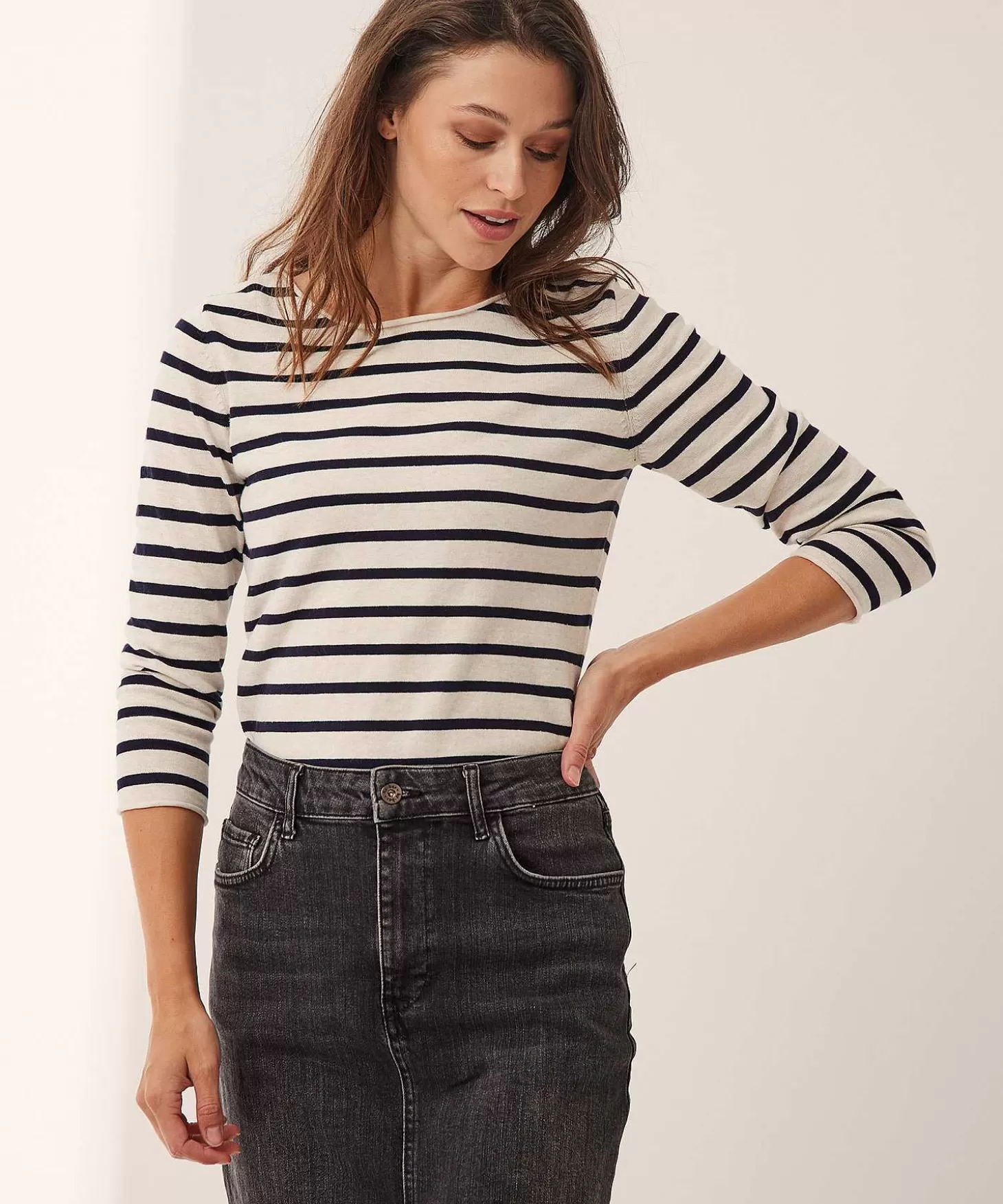 Zeg Oui Tegen De Bretonse Streep Met Deze Tijdloze Trui. In Offwhite Met Een Nachtblauw Streepje, Een Boothals En 3/4E …