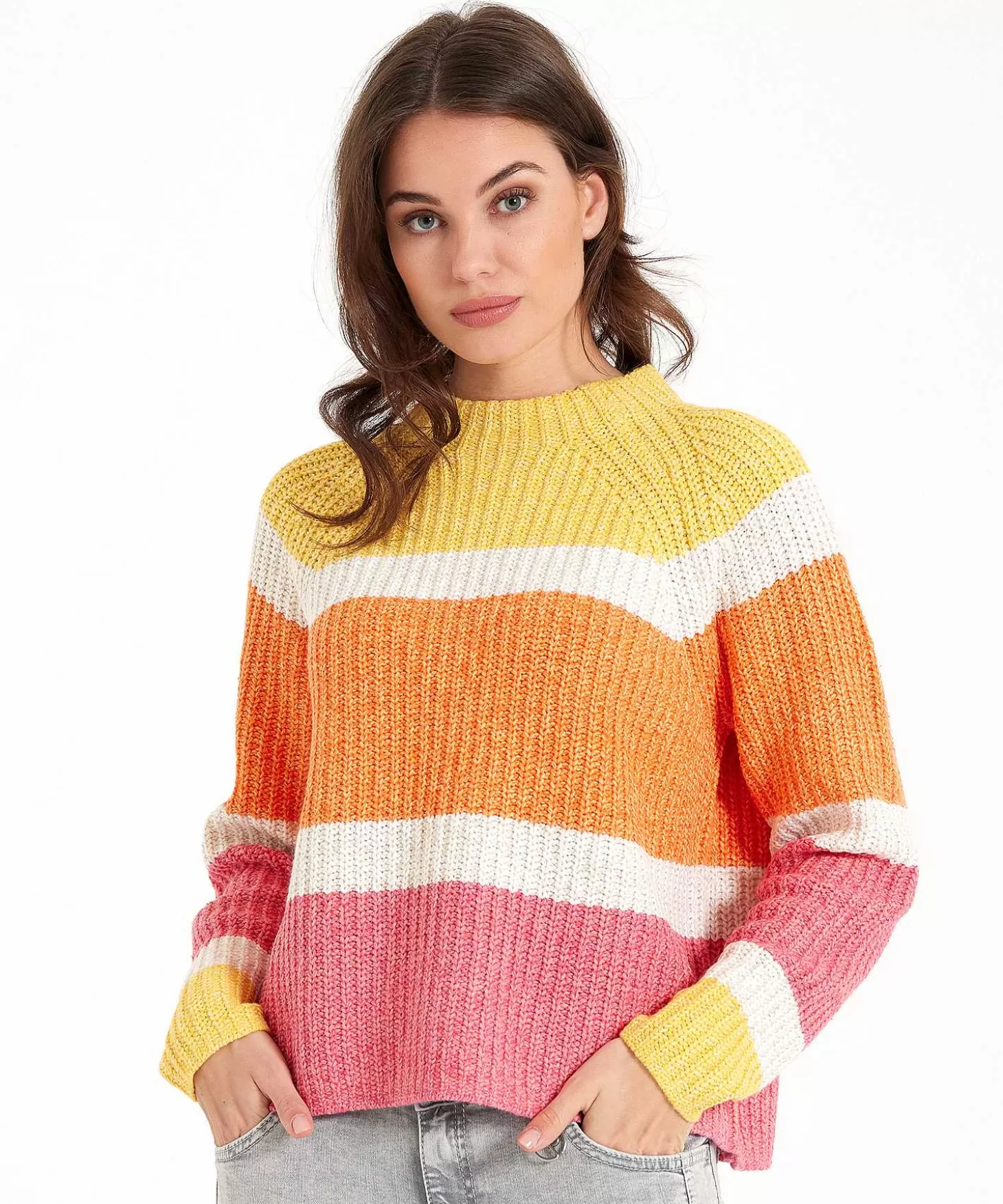 Colorblock Vrolijk Steelt Deze Oui Trui Direct Jouw Hart. Wat Een Sportief Model Met Haar Strepen In Geel, Oranje En Ro…