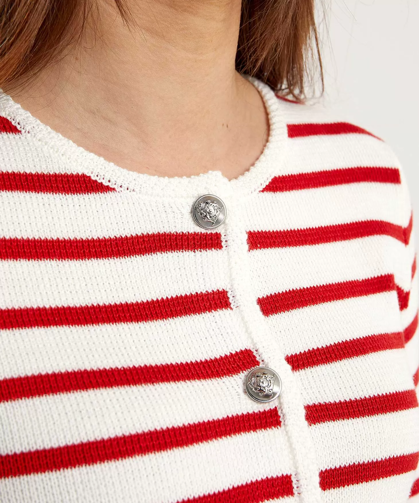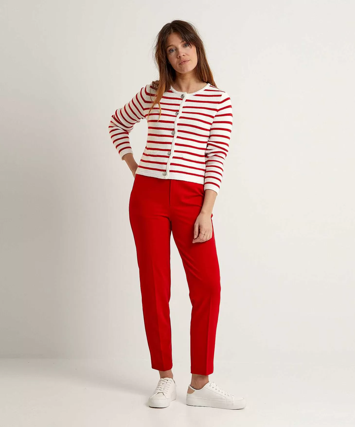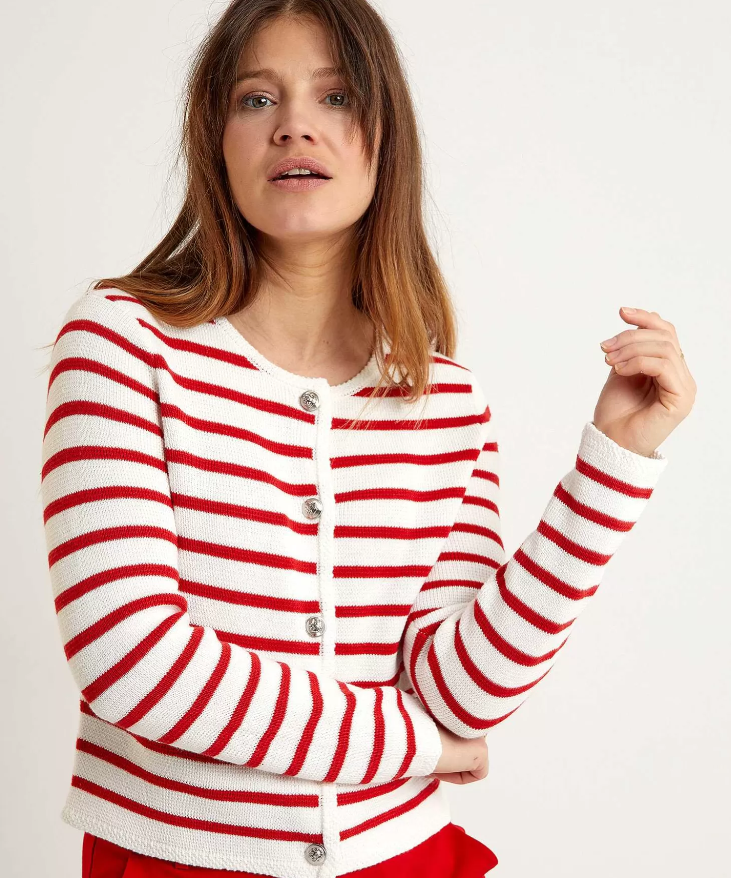 We Love Stripes En Dit Oui Vest Is Er Vol Van. Wat Een Klassiek Model Met Haar Ronde Hals, Bretonse Streepje En Metalen Knoopjes En Voel Je Haar Luchtige Katoenmix? In Denimblauw/Wit Of Rood/Wit Ademt Ze Een En Al Maritieme Sferen En Ze Past Bij Veel. Je Draagt Haar Met Een Pantalon En Loafers Naar Je Werk Of Feestje Of Met Een Jeans En Sneakers Op Stedentrip. Maar Ook Een (Denim) Rok En Mocassins Kan Ze Aan. Samenstelling: 50% Katoen, 50% Polyacryl.