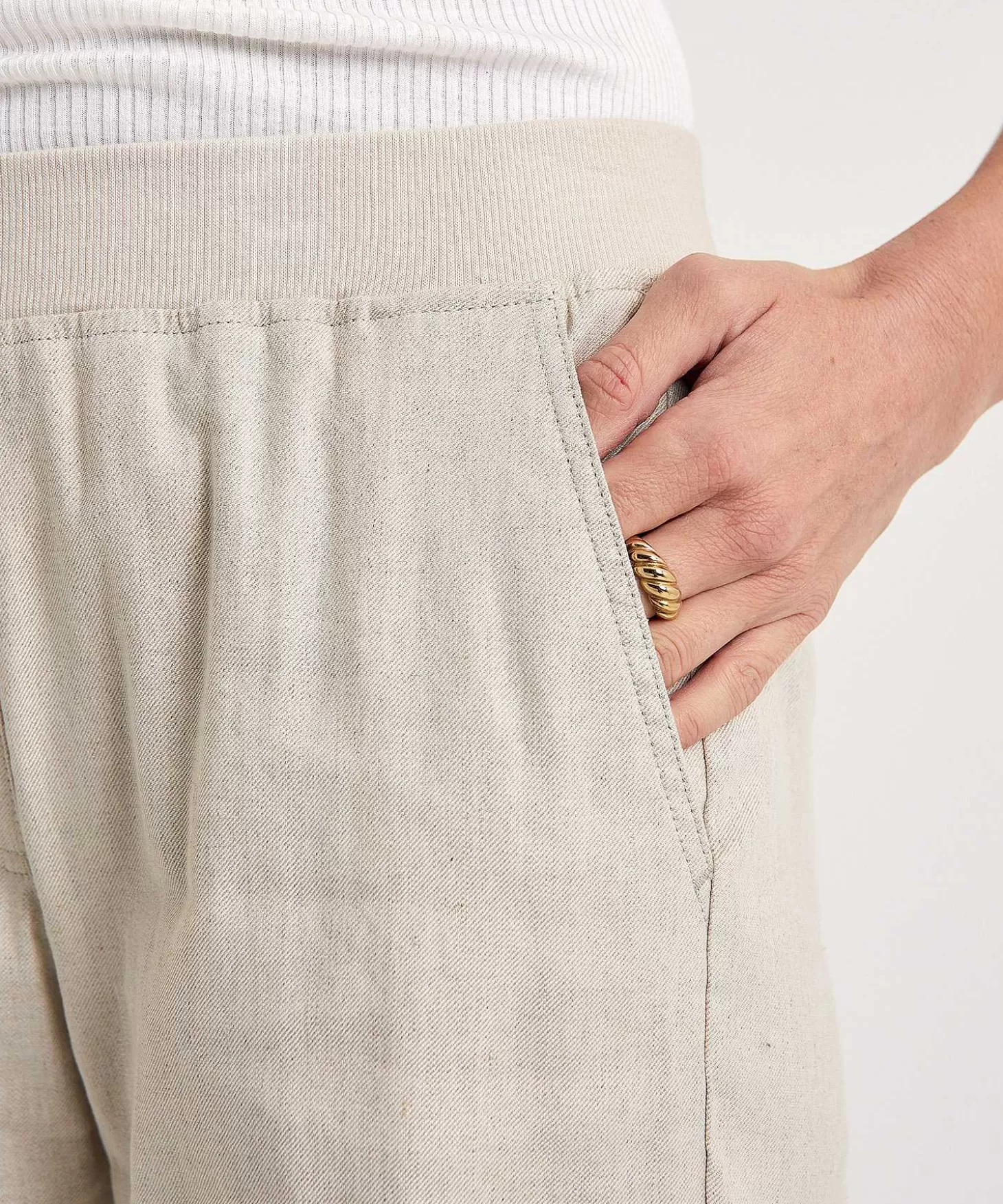 Pam Is Een Zomerse Palazzo Broek Van Raphaela By Brax In Linnenmix. Voel Je Haar Stevige Maar Soepele Weefsel En Zie Je Haar Elastische Tailleband, Steekzakjes En Paspelzakjes Achter? In Neutrale Zandkleur Past Ze Overal Bij En Dankzij Haar Palazzo Model Draagt Ze Luchtig En Ze Heeft De Looks Van Een Pantalon. Je Draagt Haar Met Knitwear, Een Linnen Blouse Of Top Of Een T-Shirt + Loafers, Sandaaltjes, Sneakers Of High Heels. Normal Waist. Samenstelling: 61% Linnen, 18% Viscose, 18% Katoen, 3% Elastan.