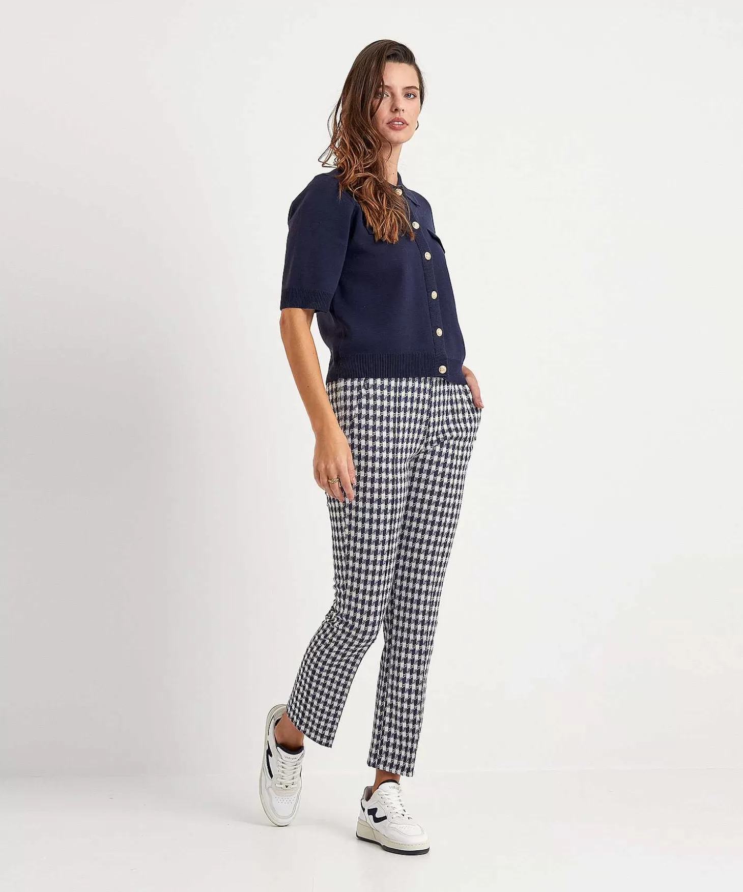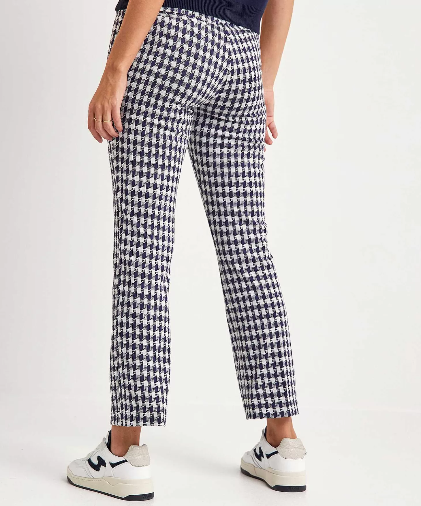 Come Check This, Want Deze Raphaela By Brax Super Slim Broek Combineert Een Klassiek Ruitje Met Een Sportieve Fit. Voel Je Haar Soepele Jersey En Zie Je Haar Pied-De-Poule Ruitpatroon In Marine En Offwhite? Met Een Elastische Tailleband, Ritszakjes, Doorgestikte Persvouwen En Paspelzakjes Achter Is Dit Model Van Alle Modemarkten Thuis. Je Draagt Lillyth Check Met Een Blouse + Blazer, Knitwear Of Een Sweater + Laarsjes, Sneakers Of Loafers. Dankzij Haar Kortere (Cropped) Lengte Geeft Ze Elk Outfit Een Pittige Twist…Eh Ruit. Samenstelling: 70% Viscose, 28% Polyamide, 2% Elastan.