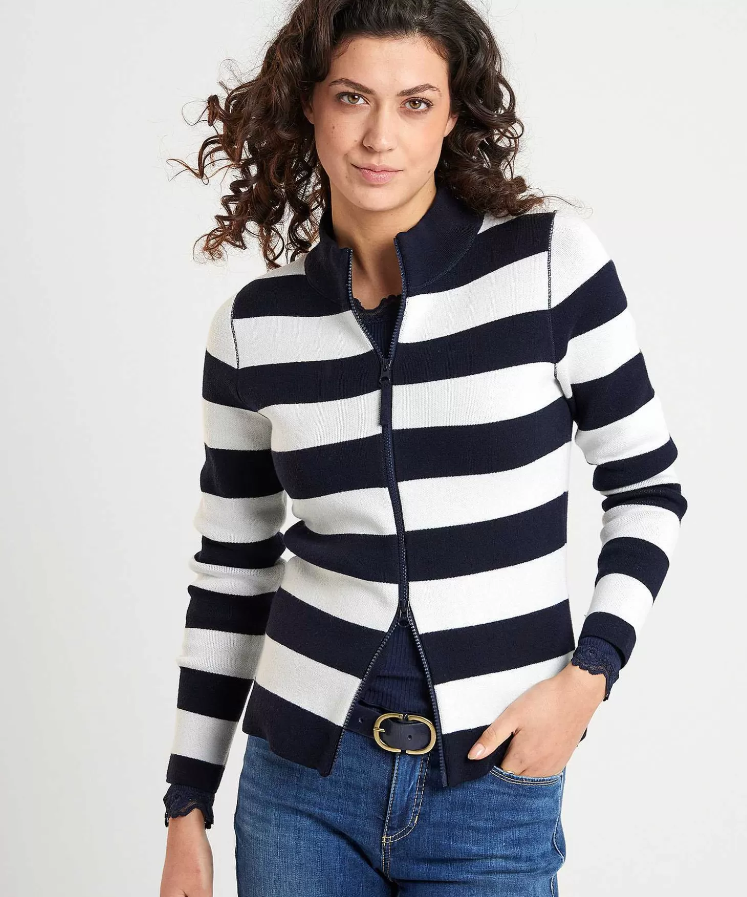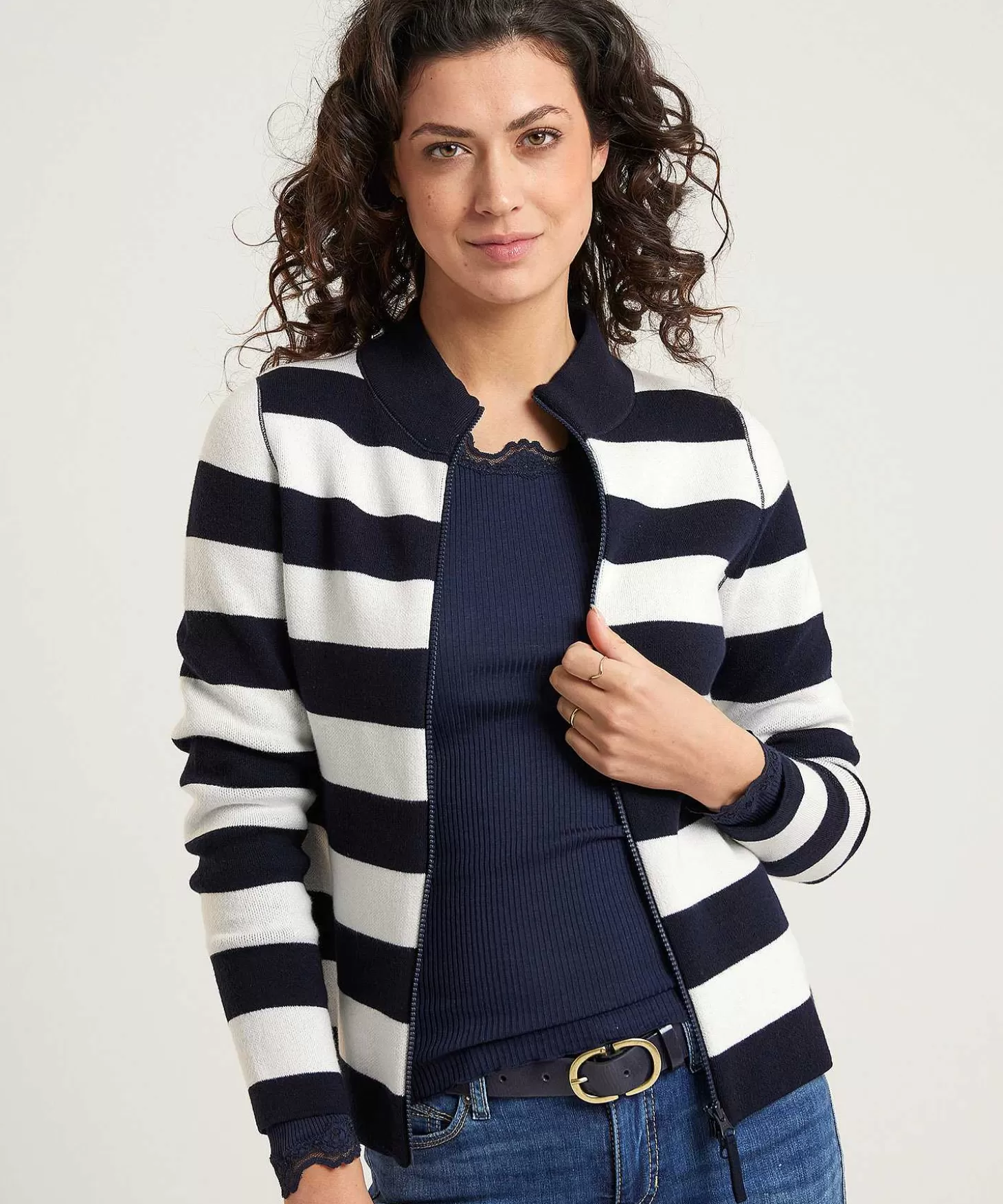 Met Marine/Witte Blockstripe Wordt Dit Ritsvest Jouw Nieuwe Favoriet. Voel Je Haar Aangename Katoenmix En Zie Je Haar Comfortabele Opstaande Boordje En Twoway-Zipper? Dankzij Haar Superfijne (En Stretchy) Jacquard Breisel Draagt Ze Niet Alleen Heerlijk, Rol Ook Vooral Haar Mouwtje Om Of Draag Haar Open En Toon De Contrasterende Binnenzijde. Je Draagt Dit Vest In Vele Outfits, Zoals Met Een Blouse En Pantalon + Loafers Naar Je Werk Of Een Feestje. Maar Ook Met Een Fijne Streeptop (Voor Nog Meer Maritieme Vibes) En Een Jeans + Sneakers Is Het Sportief Cityhoppen. Van Deze Musthave Ga Je Veel Plezier Beleven, Mark My Striped & Knitted Words. Samenstelling: 80% Katoen, 17% Polyamide, 3% Elastan.