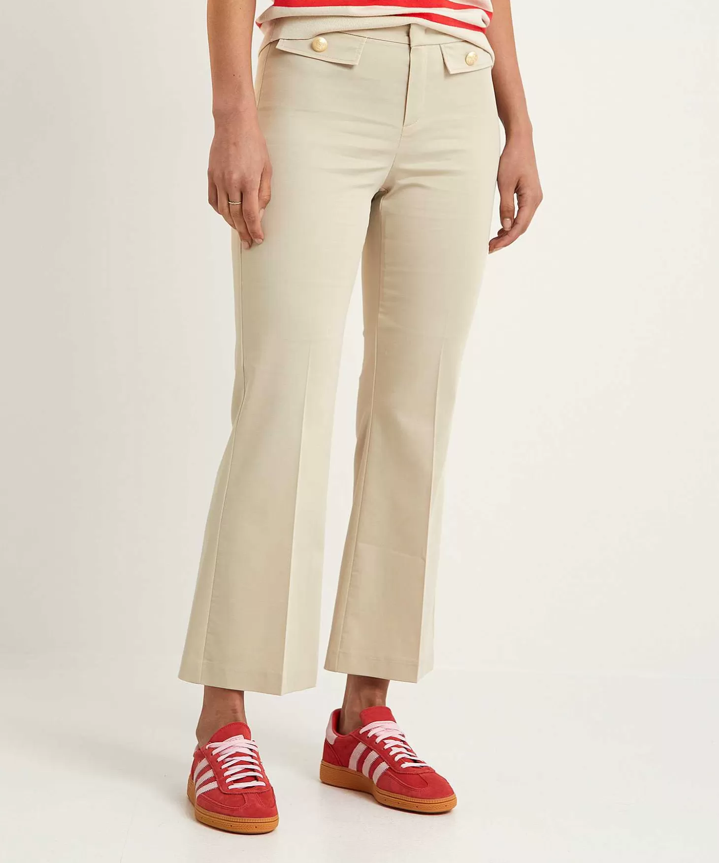 Alisa Is Een Chique Rosner Broek In Sportief Kick Flare Model. Naast De Looks Van Een Pantalon Met De Klassieke Sluiting, (Fake) Klepzakjes, Persvouwen En Paspels Achter Heeft Ze Een Kortere Uitlopende Pijp. In Neutraal Zand Of Zwart Geeft Ze Elke Outfit Sportieve Klasse En Dankzij Haar Lichte Strtechy Katoenmix Draagt Ze Comfortabel En Luchtig.