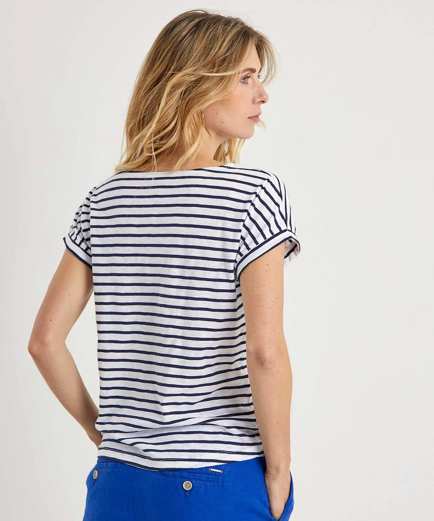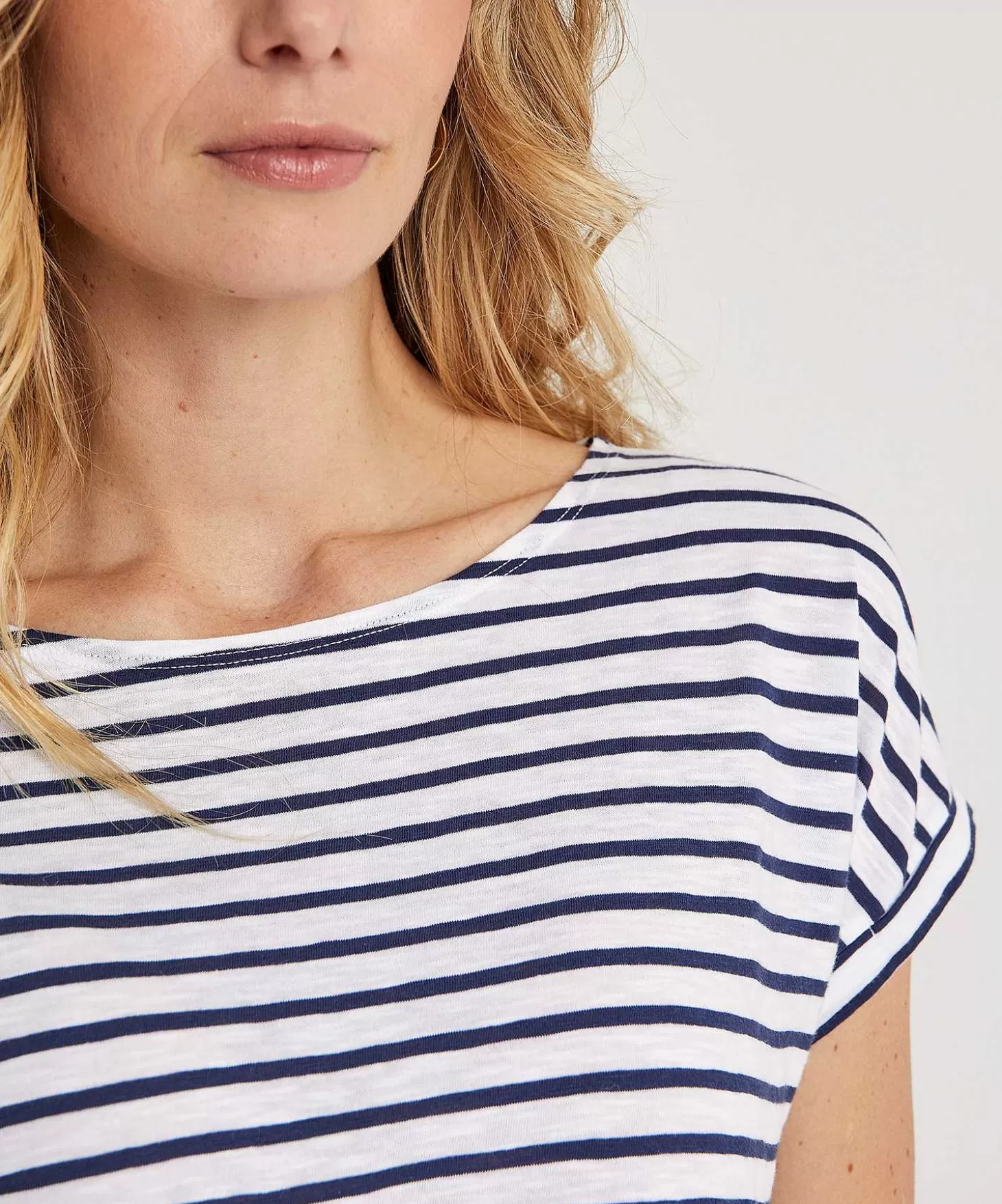 Dit Shirt Met Bretonse Streep Mag In Geen Enkele Garderobe Ontbreken. Van Luchtige Witte Katoen Met Een Donkerblauw Streepje En Een Kort Aangeknipt Mouwtje Met Vaste Omslag Past Ze Overal Bij. In Zachte Katoen En Met Een Relaxt Lichaamsvolgend Lijntje Is Ze Helemaal Summerproof.