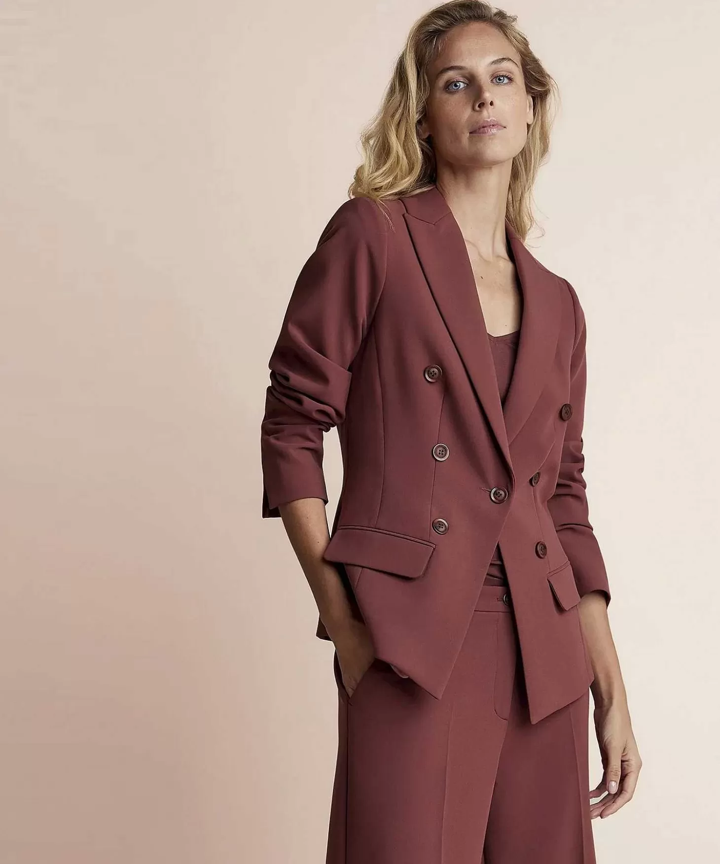 Deze Summum Blazer Met Sierknopen Is Pas Echt Het Summum. Zie Je Haar Geraffineerde Zandloperpasvorm En Chique Donkerterra Kleur? Optisch Double-Breasted, Maar Met Één Knoop Sluitend + Brede Revers, Valt Ze Feminien Om Je Lijf. Zie Je Het Splitje Bij De Manchet En Middenachter En Voel Je Haar Stevige Maar Soepele Materiaal. Je Draagt Deze Beauty Met Een Meshshirt En De Bijpassende Summum Wide Leg Broek + High Heels Naar Kantoor Of Een Feestje. Maar Ook Met Een Crispy Witte Blouse, Een Jeans En Laarsjes Oog Je Minimal Chic. Samenstelling: 71% Polyester, 22% Viscose, 7% Elastan. Voering: 100% Acetaat.