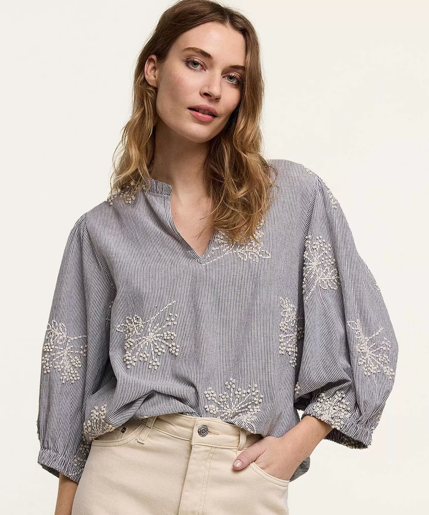 Deze Geborduurde Summum Blouse Combineert Bloemen Met Streepjes. Met Haar Halflange Ballonmouw, Offwhite Borduursel En Fijne Streepje Is Ze Sportief En Romantisch Tegelijk. Langs De Tuniekhals Heeft Ze Een Opstaand Geplooid Boordje En Ze Heeft Elastiek In De Zoom Voor Een Puffy Effect.