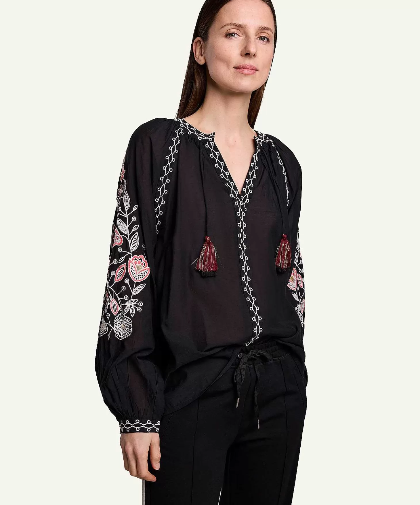 Deze Summum Blouse Met Embroidery Is Écht Het Summum. Wat Een Oogstrelend Geborduurd Bloempatroon Op Zwart Of Offwhite En Zie Je Haar Feminien Details? Met De Karakteristieke Summum Ballonmouw, Fijne Plooitjes En Het Borduursel Langs De Raglanaanzet, De Hals En De Sluiting Middenvoor Is Ze Een Lust Voor Het Oog. Tel Daar De Relaxte Wijde Fit, De Strikkoordjes Met Kwastjes En Het Borduursel Bij Op En Je Bent Verkocht. De Toefjes Sprankelend Goud Her En Der Maken Haar Nog Feestelijker. Je Draagt Deze Blouse Met Een Smalle Jeans En Laarsjes Of Met Een Wide Leg Pantalon En High Heels Overal Naar Toe Waar De Dresscode Joie De Vivre Is.