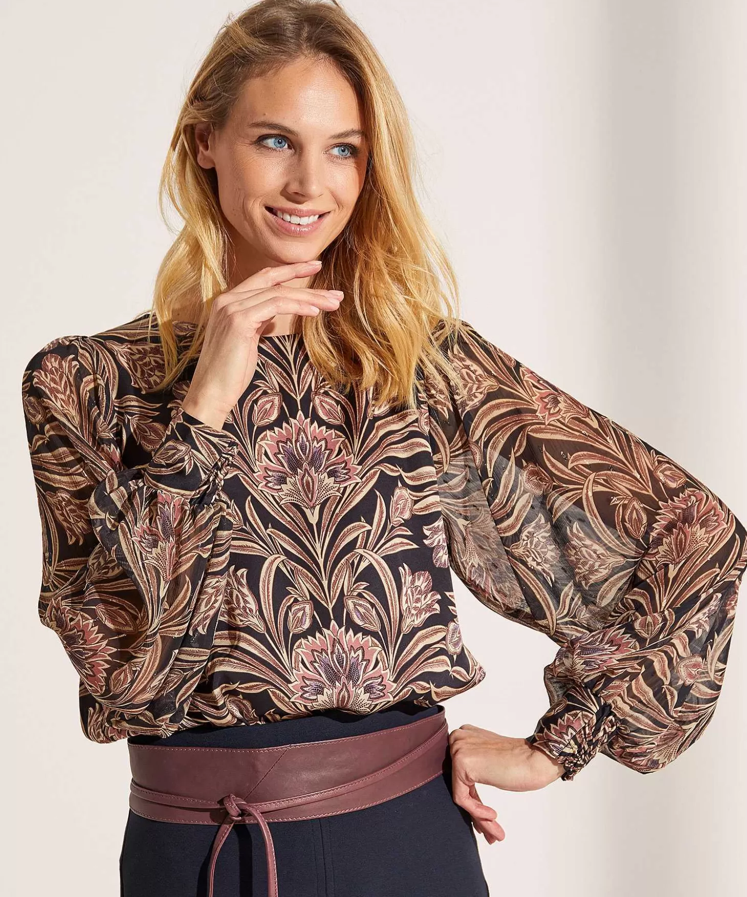 Een Bloemenpatroon In Warme Tinten Als Rozerood En Beige, Gestrooid Op Een Ondergrond Van Zwart. Deze Blouse Van Summum Zorgt Dat De Details Het Verschil Maken. De Ballonmouwen Met Gesmockte Manchet Zijn Transparant En Hebben Een Goudkleurig Lurexdraadje Ingeweven. Het Voor- En Achterpand Zijn Van Zijdezachte Licht Glanzende Satijn. De Blouse Heeft Onderom Een Deels Gesmockte Rand En Valt Daardoor Prachtig Op De Band Van Je Wideleg Pantalon Of Rok. Draag Op Zwart Of Kies Voor De Cherry-Bruinrode Kleur. Samenstelling: 100% Viscose.