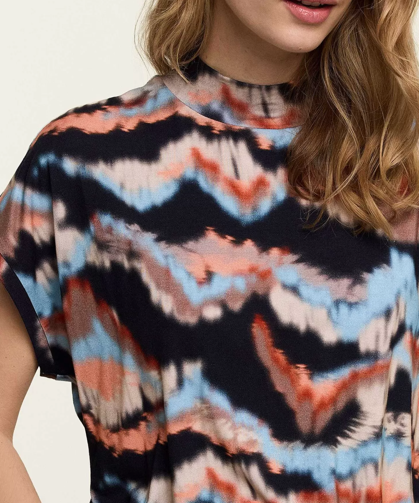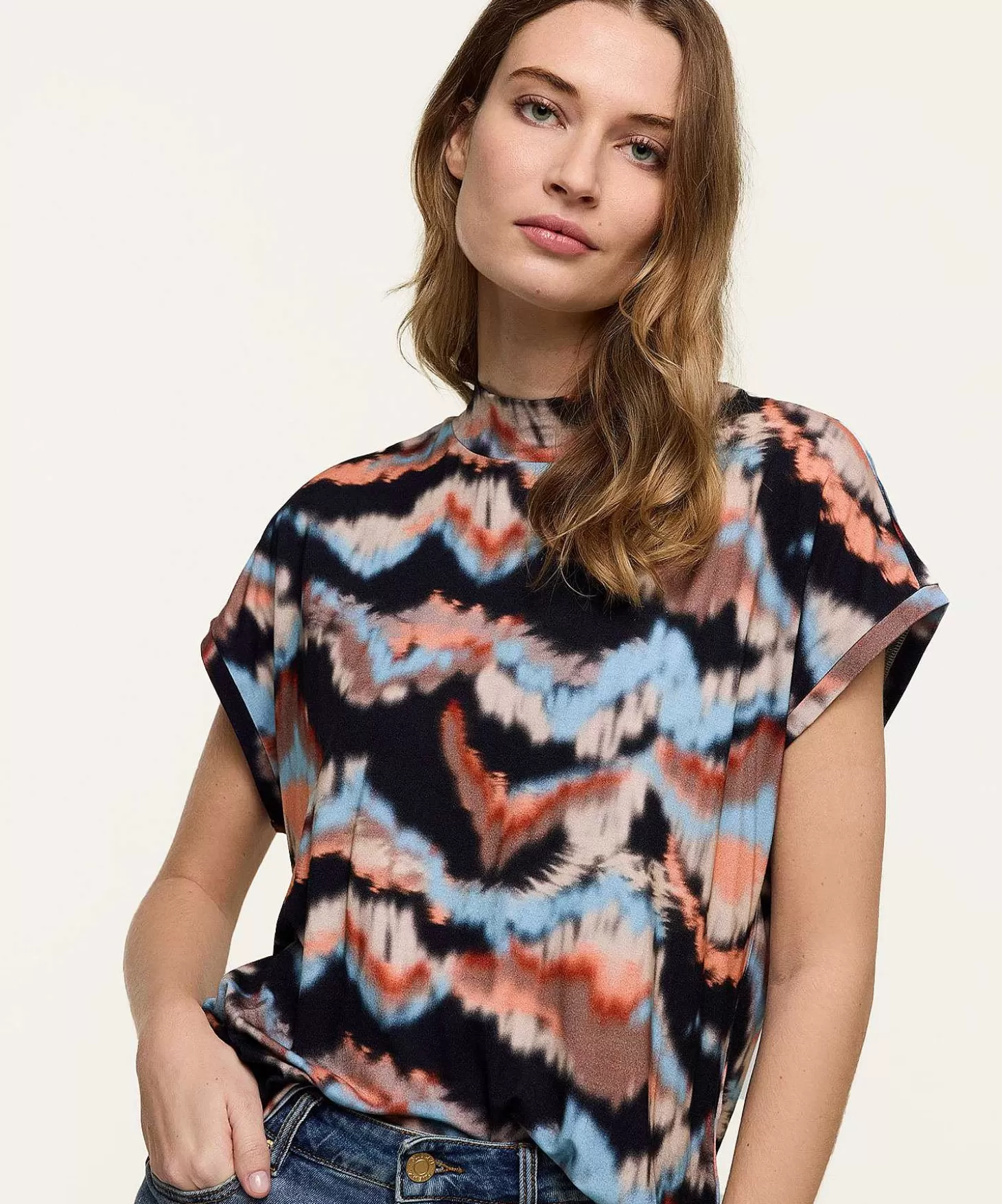 Tie-Dye Meets Jersey Met Dit Summum Colshirt Met Tie-Dye Print In Chique Kleurenpalet. Voel Je Haar Soepele En Stretchy Viscose En Zie Je Haar Turtleneck En Korte Aangeknipte Mouw. Je Draagt Dit Losse Model Met Een Palazzo Of Cargo Broek, Jeans Of Denim Rok + Loafers, Sneakers, Sandaaltjes Of High Heels En Ze Past Ook Perfect Onder Een Blazer Of Vestje Als Het Wat Frisser Is. Samenstelling: 95% Viscose, 5% Elastan.